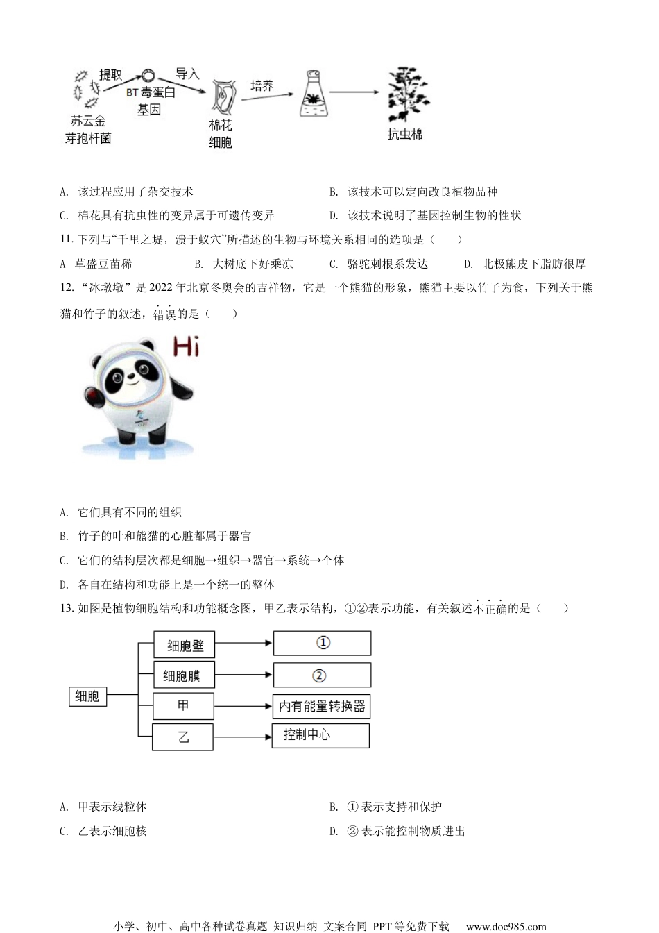 小学、初中、高中各种试卷真题知识归纳文案合同PPT等免费下载www.doc985.com2022年海南省中考生物真题一、选择题1.生物体结构和功能的基本单位是()A.细胞B.组织C.器官D.系统2.下列生态系统中自我调节能力最强的是()A.草原生态系统B.农田生态系统C.湿地生态系统D.森林生态系统3.下列属于海洋动物的是()A.鲨鱼B.涡虫C.水螅D.草履虫4.下列人体疾病与激素无关的是()A.夜盲症B.甲亢C.糖尿病D.侏儒症5.成分输血以“缺什么补什么”为原则,严重贫血患者治疗时应输入()A.红细胞B.白细胞C.血小板D.血浆6.“一日三餐,米香弥漫,饱食者当常忆袁公。”袁隆平院士毕生研究的是()A.杂交水稻B.高产奶牛C.克隆羊D.太空椒7.古诗词是中华文化瑰宝,深受人民喜爱。下列诗句中不包含生命现象的是()A.野火烧不尽,春风吹又生B.两岸猿声啼不住,轻舟已过万重山C.红豆生南国,春来发几枝D.孤山寺北贾亭西,水面初平云脚低8.某同学利用两片木板、两条松紧带和一颗螺丝钉做成一个骨-关节-肌肉关系的模型,其中木板代表()A.骨B.关节C.骨骼肌D.肌腹9.下列行为或做法合理的是()A.经常喝果汁等饮料代替饮水B.为了身体发育只吃肉不吃青菜C.早餐吃得少,通过多吃午餐来弥补D.购买食品时仔细查看包装上的生产日期、保质期等信息10.下图是科学家培育抗虫棉的过程示意图,以下叙述错误的是()小学、初中、高中各种试卷真题知识归纳文案合同PPT等免费下载www.doc985.comA.该过程应用了杂交技术B.该技术可以定向改良植物品种C.棉花具有抗虫性的变异属于可遗传变异D.该技术说明了基因控制生物的性状11.下列与“千里之堤,溃于蚁穴”所描述的生物与环境关系相同的选项是()A.草盛豆苗稀B.大树底下好乘凉C.骆驼刺根系发达D.北极熊皮下脂肪很厚12.“冰墩墩”是2022年北京冬奥会的吉祥物,它是一个熊猫的形象,熊猫主要以竹子为食,下列关于熊猫和竹子的叙述,错误的是()A.它们具有不同的组织B.竹子的叶和熊猫的心脏都属于器官C.它们的结构层次都是细胞→组织→器官→系统→个体D.各自在结构和功能上是一个统一的整体13.如图是植物细胞结构和功能概念图,甲乙表示结构,①②表示功能,有关叙述不正确的是()A.甲表示线粒体B.①表示支持和保护C.乙表示细胞核D.②表示能控制物质进出小学、初中、高中各种试卷真题知识归纳文案合同PPT等免费下载www.doc985.com14.光合作用、呼吸作用、蒸腾作用是植物的基本生理过程,人们将其应用于生产实践,以下相关说法不正确的是()A.合理密植能充分利用光能提高农作物产量B.夜间对火龙果进行适当光照是为了增加光合作用产物C.移栽树木时剪去部分枝叶主要是为了降低蒸腾作用D.温室大棚适当增加二氧化碳有利于增强呼吸作用15.下图是某同学为探究植物光合作用、呼吸作用和蒸腾作用而设计的实验装置,下列有关叙述不正确的是()A.将甲装置放在光下,①中收集到的气体能使带火星的卫生香复燃B.乙装置透明袋内壁出现小水珠,说明植物进行了蒸腾作用C.用乙装置探究蒸腾作用时,可改进为用透明袋包住整个花盆并扎紧D.将乙装置放在黑暗处一昼夜,用手挤压透明袋,②中澄清的石灰水会变浑浊16.某实验小组探究三种动物的绕道取食行为,得到如下结果。动物甲乙丙成功取食前的尝试次数1305012分析数据可知,三种动物从高等到低等的顺序最可能是()A.甲→乙→丙B.乙→丙→甲C.丙→乙→甲D.丙→甲→乙17.下列属于相对性状的是()A.绵羊的卷毛和山羊的直毛B.番茄的红果和樱桃的红果C.玉米的黄粒和甜粒D.爸爸的有酒窝和妈妈的无酒窝18.山柳菊有时进行有性生殖有时进行无性生殖,且花很小,难以做人工杂交实验。下列有关山柳菊的说法错误的是()A.进行无性生殖时,后代的遗传信息全部来自母体小学、初中、高中各种试卷真题知识归纳文案合同PPT等免费下载www.doc985.comB.进行有性生殖时,同一亲本的后代性状表现可能差异很大C.有性生殖时产生两性生殖细胞,通过受精作用产生新个体D.决定山柳菊花很小的根本原因是它有时进行无性生殖19.6月26日是“国际禁毒日”,下列有关毒品的说法不正确的是()A.毒品具有成瘾性,一旦染上很难戒除B.吸毒会严重损害身心健康、危害社会C.冰毒、...