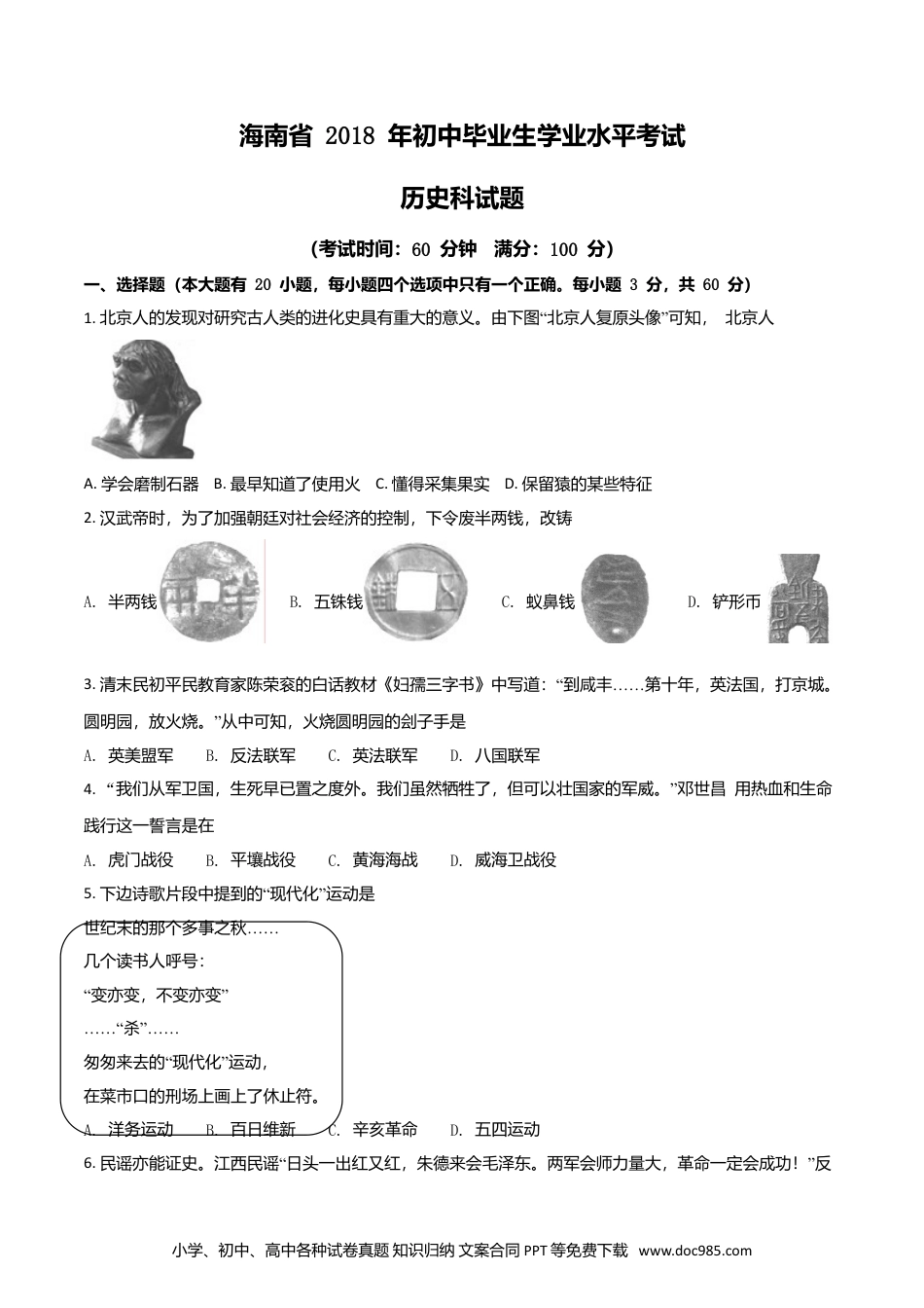 海南省2018年初中毕业生学业水平考试历史科试题(考试时间:60分钟满分:100分)一、选择题(本大题有20小题,每小题四个选项中只有一个正确。每小题3分,共60分)1.“”北京人的发现对研究古人类的进化史具有重大的意义。由下图北京人复原头像可知,北京人A.学会磨制石器B.最早知道了使用火C.懂得采集果实D.保留猿的某些特征2.汉武帝时,为了加强朝廷对社会经济的控制,下令废半两钱,改铸A.半两钱B.五铢钱C.蚁鼻钱D.铲形币3.“……清末民初平民教育家陈荣衮的白话教材《妇孺三字书》中写道:到咸丰第十年,英法国,打京城。”圆明园,放火烧。从中可知,火烧圆明园的刽子手是A.英美盟军B.反法联军C.英法联军D.八国联军4.“”我们从军卫国,生死早已置之度外。我们虽然牺牲了,但可以壮国家的军威。邓世昌用热血和生命践行这一誓言是在A.虎门战役B.平壤战役C.黄海海战D.威海卫战役5.“”下边诗歌片段中提到的现代化运动是……世纪末的那个多事之秋几个读书人呼号:“”变亦变,不变亦变……“”……杀“”匆匆来去的现代化运动,在菜市口的刑场上画上了休止符。A.洋务运动B.百日维新C.辛亥革命D.五四运动6.“”民谣亦能证史。江西民谣日头一出红又红,朱德来会毛泽东。两军会师力量大,革命一定会成功!反小学、初中、高中各种试卷真题知识归纳文案合同PPT等免费下载www.doc985.com映的历史事件是A.吴起镇会师B.井冈山会师C.会宁会师D.懋功会师7.“”毛泽东曾打趣说打了三个战役,白了一根头发,值得!下列不属于三大战役的是A.辽沈战役B.淮海战役C.平津战役D.渡江战役8.“前不久,习近平总书记在南海大阅兵时指出:建设一支强大的海军,寄托着中华民族向海图强的世代”夙愿。中国人民解放军第一支海军成立于A.19世纪80年代B.新中国成立前夕C.20世纪50年代D.20世纪60年代9.周恩来恰如一名睿智的大国棋手,在风云变幻的国际外交大棋局中纵横捭阖,谈笑风生,使新中国外交突破重围,朋友遍天下。下列与下图相符的周恩来外交语言是A.我们是来求同而不是来立异的B.打扫干净屋子再请客C.越中情谊深,同志加兄弟D.各国之间一定能找到共同点10.1858年,英法侵略者通过《天津条约》增开了10处通商口岸,最南的口岸位于今天的A.广州B.深圳C.文昌D.海口11.海南因改革开放而生,也因改革开放而兴。30年前,为海南岛建省办经济特区规划了宏伟蓝图的党和国家领导人是A.毛泽东B.邓小平C.胡锦涛D.习近平12.文字是人类文明发展的重要载体。下列承载着古埃及文明历史的文字是A.甲骨文B.腓尼基文字小学、初中、高中各种试卷真题知识归纳文案合同PPT等免费下载www.doc985.comC.楔形文字D.象形文字13.“”“”有人说雅典的民主政治是历史上最狭隘也是最充实的。其狭隘之处体现在:真正享有民主权利的群体只有A.成年男性公民B.妇女、外邦人C.城邦上层贵族D.五百人会议成员14.“《大国崛起》一书认为:拿破仑战争是大革命的继续,拿破仑帝国是法国革命的最后阶”段。充分肯定了拿破仑A.巩固了资产阶级革命成果B.占领了欧洲大片领土C.击退了反法联盟多次进攻D.扫荡了欧洲封建势力15.“”马克思说:蒸汽和新的工具把工场手工业变成了现代化大工业。通过改进蒸汽机为新的工具提供动力的人是A.莱特兄弟B.卡尔·本茨C.史蒂芬孙D.瓦特16.“美国最大的连锁书店巴诺旗下的《图书》杂志公布了该刊评选出的改变美国的20”本书,《共产党宣言》赫然在列。170年前,《共产党宣言》的发表标志着A.无产阶级出现B.巴黎公社成立C.马克思主义诞生D.资产阶级消亡17.1922年2“‘’月的华盛顿,美国国务卿休斯难掩得意之色:多亏了这个条约,对华门户开放终于实现”了。休斯所说的条约是A.《凡尔赛和约》B.《四国条约》C.《九国公约》D.《五国公约》18.图片在一定程度上记录了历史的瞬间。下列三幅图反映的共同主题是A.法西斯暴行B.纳粹的暴政C.战场的残酷D.种族的灭绝19.“”下图漫画中,马歇尔计划成为扶助欧洲成长的夹板,反映了这一计划在复兴欧洲经济的同时,小学、初中、高中各种试卷真题知识归纳文案合同PPT等免费下载www.doc985.comA.控制了西欧各国B.冲击了西欧民主C.促进了欧洲联合D.摧残了欧洲文明20.2018年,中美...
