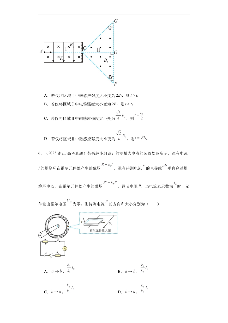 专题09磁场一、单选题1.(2023·全国·统考高考真题)如图,一磁感应强度大小为B的匀强磁场,方向垂直于纸面(xOy平面)向里,磁场右边界与x轴垂直。一带电粒子由O点沿x正向入射到磁场中,在磁场另一侧的S点射出,粒子离开磁场后,沿直线运动打在垂直于x轴的接收屏上的P点;SP=l,S与屏的距离为,与x轴的距离为a。如果保持所有条件不变,在磁场区域再加上电场强度大小为E的匀强电场,该粒子入射后则会沿x轴到达接收屏。该粒子的比荷为()A.B.C.D.2.(2023·海南·统考高考真题)汽车测速利用了电磁感应现象,汽车可简化为一个矩形线圈abcd,埋在地下的线圈分别为1、2,通上顺时针(俯视)方向电流,当汽车经过线圈时()A.线圈1、2产生的磁场方向竖直向上B.汽车进入线圈1过程产生感应电流方向为abcdC.汽车离开线圈1过程产生感应电流方向为abcdD.汽车进入线圈2过程受到的安培力方向与速度方向相同3.(2023·海南·统考高考真题)如图所示,带正电的小球竖直向下射入垂直纸面向里的匀强磁场,关于小球运动和受力说法正确的是()A.小球刚进入磁场时受到的洛伦兹力水平向右B.小球运动过程中的速度不变C.小球运动过程的加速度保持不变D.小球受到的洛伦兹力对小球做正功4.(2023·江苏·统考高考真题)如图所示,匀强磁场的磁感应强度为B.L形导线通以恒定电流I,放置在磁场中.已知ab边长为2l,与磁场方向垂直,bc边长为l,与磁场方向平行.该导线受到的安培力为()A.0B.BIlC.2BIlD.5.(2023·湖南·统考高考真题)如图,真空中有区域Ⅰ和Ⅱ,区域Ⅰ中存在匀强电场和匀强磁场,电场方向竖直向下(与纸面平行),磁场方向垂直纸面向里,等腰直角三角形CGF区域(区域Ⅱ)内存在匀强磁场,磁场方向垂直纸面向外。图中A、C、O三点在同一直线上,AO与GF垂直,且与电场和磁场方向均垂直。A点处的粒子源持续将比荷一定但速率不同的粒子射入区域Ⅰ中,只有沿直线AC运动的粒子才能进入区域Ⅱ。若区域Ⅰ中电场强度大小为E、磁感应强度大小为B1,区域Ⅱ中磁感应强度大小为B2,则粒子从CF的中点射出,它们在区域Ⅱ中运动的时间为t0。若改变电场或磁场强弱,能进入区域Ⅱ中的粒子在区域Ⅱ中运动的时间为t,不计粒子的重力及粒子之间的相互作用,下列说法正确的是()A.若仅将区域Ⅰ中磁感应强度大小变为2B1,则t>t0B.若仅将区域Ⅰ中电场强度大小变为2E,则t>t0C.若仅将区域Ⅱ中磁感应强度大小变为,则D.若仅将区域Ⅱ中磁感应强度大小变为,则6.(2023·浙江·高考真题)某兴趣小组设计的测量大电流的装置如图所示,通有电流I的螺绕环在霍尔元件处产生的磁场,通有待测电流的直导线垂直穿过螺绕环中心,在霍尔元件处产生的磁场。调节电阻R,当电流表示数为时,元件输出霍尔电压为零,则待测电流的方向和大小分别为()A.,B.,C.,D.,7.(2022·重庆·高考真题)2021年中国全超导托卡马克核聚变实验装置创造了新的纪录。为粗略了解等离子体在托卡马克环形真空室内的运动状况,某同学将一小段真空室内的电场和磁场理想化为方向均水平向右的匀强电场和匀强磁场(如图),电场强度大小为E,磁感应强度大小为B。若某电荷量为q的正离子在此电场和磁场中运动,其速度平行于磁场方向的分量大小为v1,垂直于磁场方向的分量大小为v2,不计离子重力,则()A.电场力的瞬时功率为B.该离子受到的洛伦兹力大小为qv1BC.v2与v1的比值不断变大D.该离子的加速度大小不变8.(2022·北京·高考真题)正电子是电子的反粒子,与电子质量相同、带等量正电荷。在云室中有垂直于纸面的匀强磁场,从P点发出两个电子和一个正电子,三个粒子运动轨迹如图中1、2、3所示。下列说法正确的是()A.磁场方向垂直于纸面向里B.轨迹1对应的粒子运动速度越来越大C.轨迹2对应的粒子初速度比轨迹3的大D.轨迹3对应的粒子是正电子9.(2022·江苏·高考真题)如图所示,两根固定的通电长直导线a、b相互垂直,a平行于纸面,电流方向向右,b垂直于纸面,电流方向向里,则导线a所受安培力方向()A.平行于纸面向上B.平行于纸面向下C.左半部分垂直纸面向外,右半部分垂直纸面向里D.左半部分垂直纸...