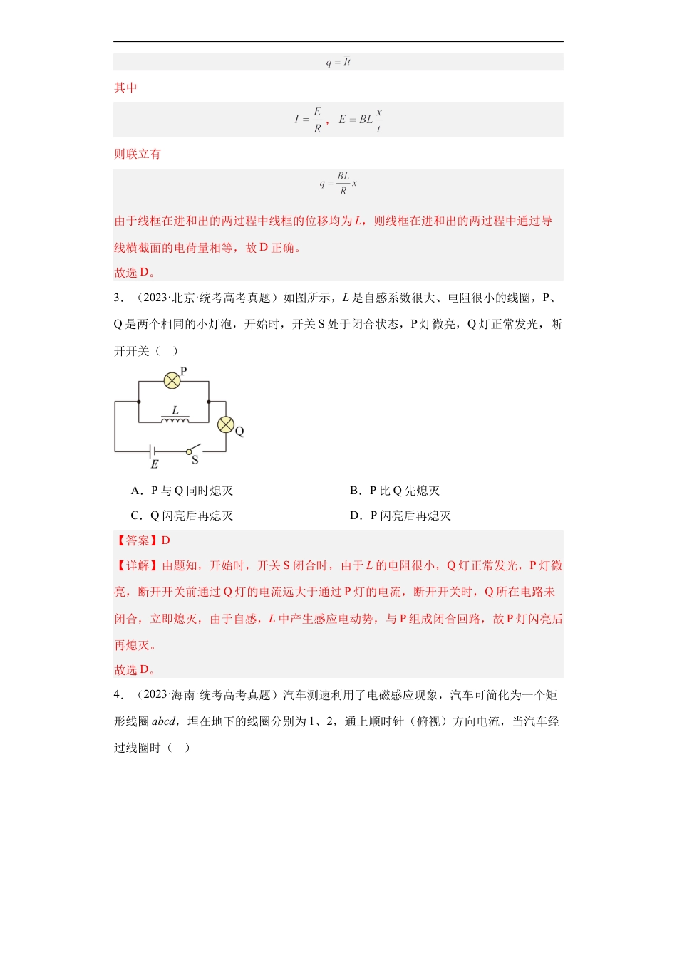 专题10电磁感应一、单选题1.(2023·全国·统考高考真题)一学生小组在探究电磁感应现象时,进行了如下比较实验。用图(a)所示的缠绕方式,将漆包线分别绕在几何尺寸相同的有机玻璃管和金属铝管上,漆包线的两端与电流传感器接通。两管皆竖直放置,将一很小的强磁体分别从管的上端由静止释放,在管内下落至管的下端。实验中电流传感器测得的两管上流过漆包线的电流I随时间t的变化分别如图(b)和图(c)所示,分析可知()A.图(c)是用玻璃管获得的图像B.在铝管中下落,小磁体做匀变速运动C.在玻璃管中下落,小磁体受到的电磁阻力始终保持不变D.用铝管时测得的电流第一个峰到最后一个峰的时间间隔比用玻璃管时的短【答案】A【详解】A.强磁体在铝管中运动,铝管会形成涡流,玻璃是绝缘体故强磁体在玻璃管中运动,玻璃管不会形成涡流。强磁体在铝管中加速后很快达到平衡状态,做匀速直线运动,而玻璃管中的磁体则一直做加速运动,故由图像可知图(c)的脉冲电流峰值不断增大,说明强磁体的速度在增大,与玻璃管中磁体的运动情况相符,A正确;B.在铝管中下落,脉冲电流的峰值一样,磁通量的变化率相同,故小磁体做匀速运动,B错误;C.在玻璃管中下落,玻璃管为绝缘体,线圈的脉冲电流峰值增大,电流不断在变化,故小磁体受到的电磁阻力在不断变化,C错误;D.强磁体分别从管的上端由静止释放,在铝管中,磁体在线圈间做匀速运动,玻璃管中磁体在线圈间做加速运动,故用铝管时测得的电流第一个峰到最后一个峰的时间间隔比用玻璃管时的长,D错误。故选A。2.(2023·北京·统考高考真题)如图所示,光滑水平面上的正方形导线框,以某一初速度进入竖直向下的匀强磁场并最终完全穿出。线框的边长小于磁场宽度。下列说法正确的是()A.线框进磁场的过程中电流方向为顺时针方向B.线框出磁场的过程中做匀减速直线运动C.线框在进和出的两过程中产生的焦耳热相等D.线框在进和出的两过程中通过导线横截面的电荷量相等【答案】D【详解】A.线框进磁场的过程中由楞次定律知电流方向为逆时针方向,A错误;B.线框出磁场的过程中,根据E=Blv联立有由于线框出磁场过程中由左手定则可知线框受到的安培力向左,则v减小,线框做加速度减小的减速运动,B错误;C.由能量守恒定律得线框产生的焦耳热Q=FAL其中线框进出磁场时均做减速运动,但其进磁场时的速度大,安培力大,产生的焦耳热多,C错误;D.线框在进和出的两过程中通过导线横截面的电荷量其中,则联立有由于线框在进和出的两过程中线框的位移均为L,则线框在进和出的两过程中通过导线横截面的电荷量相等,故D正确。故选D。3.(2023·北京·统考高考真题)如图所示,L是自感系数很大、电阻很小的线圈,P、Q是两个相同的小灯泡,开始时,开关S处于闭合状态,P灯微亮,Q灯正常发光,断开开关()A.P与Q同时熄灭B.P比Q先熄灭C.Q闪亮后再熄灭D.P闪亮后再熄灭【答案】D【详解】由题知,开始时,开关S闭合时,由于L的电阻很小,Q灯正常发光,P灯微亮,断开开关前通过Q灯的电流远大于通过P灯的电流,断开开关时,Q所在电路未闭合,立即熄灭,由于自感,L中产生感应电动势,与P组成闭合回路,故P灯闪亮后再熄灭。故选D。4.(2023·海南·统考高考真题)汽车测速利用了电磁感应现象,汽车可简化为一个矩形线圈abcd,埋在地下的线圈分别为1、2,通上顺时针(俯视)方向电流,当汽车经过线圈时()A.线圈1、2产生的磁场方向竖直向上B.汽车进入线圈1过程产生感应电流方向为abcdC.汽车离开线圈1过程产生感应电流方向为abcdD.汽车进入线圈2过程受到的安培力方向与速度方向相同【答案】C【详解】A.由题知,埋在地下的线圈1、2通顺时针(俯视)方向的电流,则根据右手定则,可知线圈1、2产生的磁场方向竖直向下,A错误;B.汽车进入线圈1过程中,磁通量增大,根据楞次定律可知产生感应电流方向为adcb(逆时针),B错误;C.汽车离开线圈1过程中,磁通量减小,根据楞次定律可知产生感应电流方向为abcd(顺时针),C正确;D.汽车进入线圈2过程中,磁通量增大,根据楞次定律可知产生感应电流方向为adcb(逆时针),再根据左手定则,可知汽...