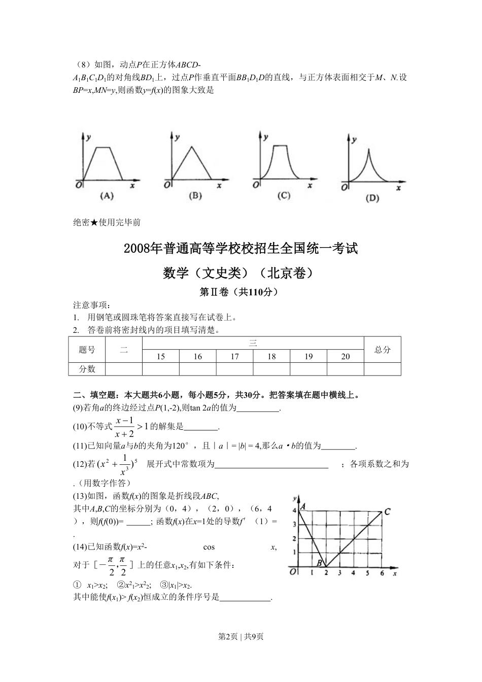 第1页|共9页绝密★启用前2008年普通高等学校招生全国统一考试(北京卷)数学(文史类)本试卷分第Ⅰ卷(选择题)和第Ⅱ卷(非选择题)两部分。第Ⅰ卷1至2页。第Ⅱ卷3至9页,共150分,考试时间120分钟。考试结束,将本试卷和答题卡一并交回。第Ⅰ卷(选择题共40分)注意事项:1.答第Ⅰ卷前,考生务必将自己的姓名、准考证号、考试科目涂写在答题卡上。2.每小题选出答案后,用铅笔把答题卡上对应题目的答案标号涂黑。如需改动,用橡颇擦干净后,再选涂其他答案。不能答在试卷上。一、本大题共8小题,第小题5分,共40分。在每小题列出的四个选项中,选出符合题目要求的一项。(1)若集合A={x|-2≤x≤3}≤3,B={x|x<-1或x>4},则集合A∩B等于(A){x|x≤3或x>4}(B){x|-1<x≤3}(C){x|3≤x<4}(D){x|-2≤x<-1}(2)若a=log3π,b=log76,c=log20.8,则(A)a>b>c(B)b>a>c(C)c>a>b(D)b>c>a(3)“双曲线的方程为116922yx”是“双曲线的准线方程为x=59”的(A)充分而不必要条件(B)必要而不充分条件(C)充分必要条件(D)既不充分也不必要条件(4)已知△ABC中,a=2,b=3,B=60°,那么角A等于(A)135°(B)90°(C)45°(D)30°(5)函数f(x)=(x-1)2+1(x<1)的反函数为(A)f--1(x)=1+1x(x>1)(B)f--1(x)=1-1x(x>1)(C)f--1(x)=1+1x(x≥1)(D)f--1(x)=1-1x(x≥1)x-y+1≥0,(6)若实数x,y满足x+y≥0,则z=x+2y的最小值是x≤0,(A)0(B)21(C)1(D)2(7)已知等差数列{an}中,a2=6,a5=15.若bn=a2n,则数列{bn}的前5项和等于(A)30(B)45(C)90(D)186第2页|共9页(8)如图,动点P在正方体ABCD-A1B1C1D1的对角线BD1上,过点P作垂直平面BB1D1D的直线,与正方体表面相交于M、N.设BP=x,MN=y,则函数y=f(x)的图象大致是绝密★使用完毕前2008年普通高等学校校招生全国统一考试数学(文史类)(北京卷)第Ⅱ卷(共110分)注意事项:1.用钢笔或圆珠笔将答案直接写在试卷上。2.答卷前将密封线内的项目填写清楚。三题号二151617181920总分分数二、填空题:本大题共6小题,每小题5分,共30分。把答案填在题中横线上。(9)若角a的终边经过点P(1,-2),则tan2a的值为.(10)不等式121xx的解集是.(11)已知向量a与b的夹角为120°,且|a|=|b|=4,那么a·b的值为.(12)若532)1(xx展开式中常数项为;各项系数之和为.(用数字作答)(13)如图,函数f(x)的图象是折线段ABC,其中A,B,C的坐标分别为(0,4),(2,0),(6,4),则f(f(0))=;函数f(x)在x=1处的导数f′(1)=.(14)已知函数f(x)=x2-cosx,对于[-22ππ,]上的任意x1,x2,有如下条件:①x1>x2;②x21>x22;③|x1|>x2.其中能使f(x1)>f(x2)恒成立的条件序号是.第3页|共9页三、解答题:本大题共6小题,共80分。解答应写出文字说明。演算步骤或证明过程。(15)(本小题共13分)已知函数2()sin3sinsin()(0)2fxxxxpwwwwf的最小正周期为π.(Ⅰ)求ω的值;(Ⅱ)求函数f(x)在区间[0,23p]上的取值范围.(16)(本小题共14分)如图,在三棱锥P-ABC中,AC=BC=2,∠ACB=90°,AP=BP=AB,PC⊥AC.(Ⅰ)求证:PC⊥AB;(Ⅱ)求二面角B-AP-C的大小.(17)(本小题共13分)已知函数32()3(0),()()2fxxaxbxcbgxfx¹且是奇函数.(Ⅰ)求a,c的值;(Ⅱ)求函数f(x)的单调区间.(18)(本小题共13分)甲、乙等五名奥运志愿者被随机地分到A,B,C,D四个不同的岗位服务,每个岗位至少有一名志愿者.(Ⅰ)求甲、乙两人同时参加A岗位服务的概率;(Ⅱ)求甲、乙两人不在同一个岗位服务的概率。第4页|共9页(19)(本小题共14分)已知△ABC的顶点A,B在椭圆2234xy上,C在直线l:y=x+2上,且AB∥l.(Ⅰ)当AB边通过坐标原点O时,求AB的长及△ABC的面积;(Ⅱ)当∠ABC=90°,且斜边AC的长最大时,求AB所在直线的方程.(20)(本小题共13分)数列{an}满足2111,()(1,2,......),.nnaannanll是常数(Ⅰ)当a2=-1时,求λ及a3的值;(Ⅱ)数列{an}是否可能为等差数列?若可能,求出它的通项公式;若不可能,说明理由;(Ⅲ)求λ的取值范围,使得存在正整数m,当n>m时总有an<0.第5页|共9页绝密★考试结束前2008年普通高等学...