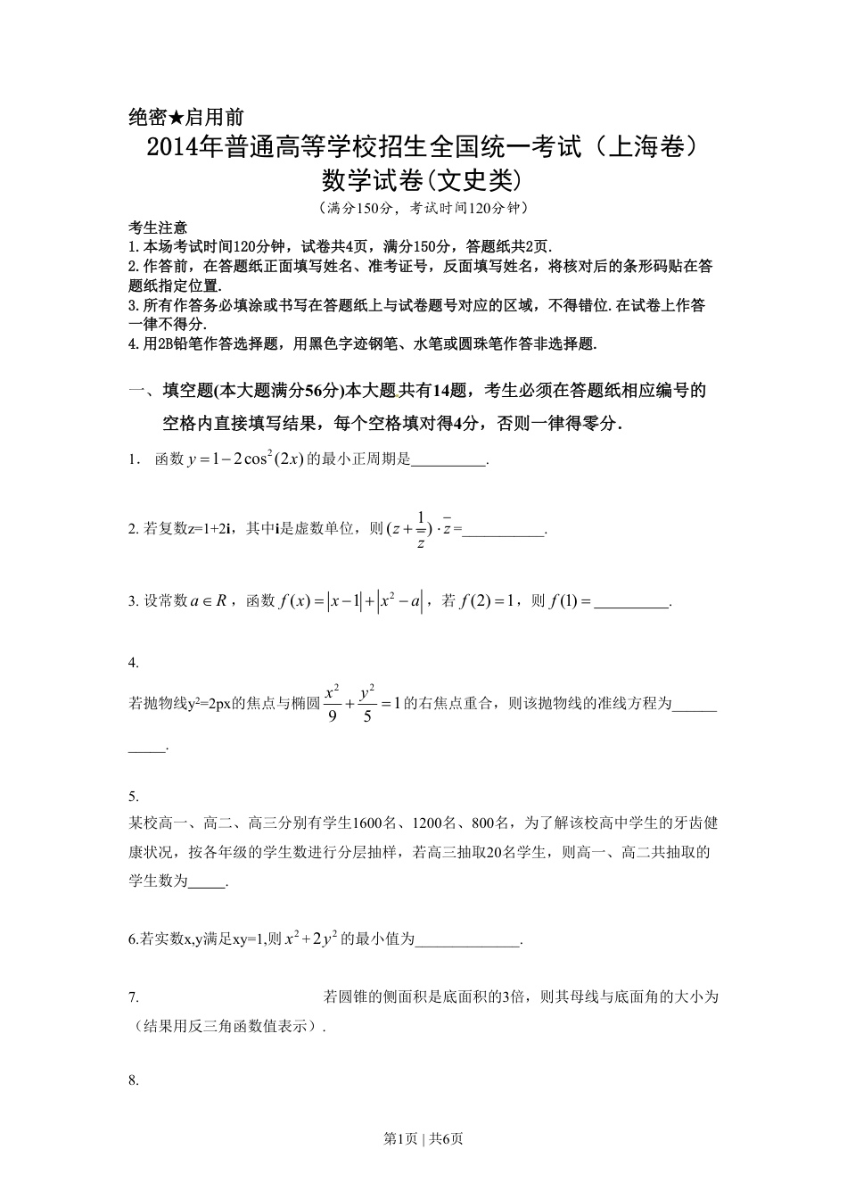 第1页|共6页绝密★启用前2014年普通高等学校招生全国统一考试(上海卷)数学试卷(文史类)(满分150分,考试时间120分钟)考生注意1.本场考试时间120分钟,试卷共4页,满分150分,答题纸共2页.2.作答前,在答题纸正面填写姓名、准考证号,反面填写姓名,将核对后的条形码贴在答题纸指定位置.3.所有作答务必填涂或书写在答题纸上与试卷题号对应的区域,不得错位.在试卷上作答一律不得分.4.用2B铅笔作答选择题,用黑色字迹钢笔、水笔或圆珠笔作答非选择题.一、填空题(本大题满分56分)本大题共有14题,考生必须在答题纸相应编号的空格内直接填写结果,每个空格填对得4分,否则一律得零分.1.函数212cos(2)yx=-的最小正周期是.2.若复数z=1+2i,其中i是虚数单位,则1()zz+z=___________.3.设常数aRÎ,函数2()1fxxxa=-+-,若(2)1f=,则(1)f=.4.若抛物线y2=2px的焦点与椭圆15922=+yx的右焦点重合,则该抛物线的准线方程为___________.5.某校高一、高二、高三分别有学生1600名、1200名、800名,为了解该校高中学生的牙齿健康状况,按各年级的学生数进行分层抽样,若高三抽取20名学生,则高一、高二共抽取的学生数为.6.若实数x,y满足xy=1,则2x+22y的最小值为______________.7.若圆锥的侧面积是底面积的3倍,则其母线与底面角的大小为(结果用反三角函数值表示).8.第2页|共6页在长方体中割去两个小长方体后的几何体的三视图如图,则切割掉的两个小长方体的体积之和等于.9.设,0,()1,0,xaxfxxxx-+£ìï=í+>ïî若(0)f是()fx的最小值,则a的取值范围是.10.设无穷等比数列{na}的公比为q,若)(lim431++=aaan,则q=.11.若2132)(xxxf-=,则满足0)(xf的x取值范围是.12.方程sin3cos1xx+=在区间[0,2]p上的所有解的和等于.13.为强化安全意识,某商场拟在未来的连续10天中随机选择3天进行紧急疏散演练,则选择的3天恰好为连续3天的概率是(结构用最简分数表示).14.已知曲线C:24xy=--,直线l:x=6.若对于点A(m,0),存在C上的点P和l上的点Q使得0APAQ+=uuuruuurr,则m的取值范围为.二、选择题:本大题共4个小题,每小题5分,共20分.在每小题给出的四个选项中,只有一项是符合题目要求的.15.设RbaÎ,,则“4>+ba”是“2,2>>ba且”的()(A)充分条件(B)必要条件(C)充分必要条件(D)既非充分又非必要条件第3页|共6页16.已知互异的复数,ab满足0ab¹,集合{,}ab={2a,2b},则ab+=()(A)2(B)1(C)0(D)1-17.如图,四个边长为1的正方形排成一个大正方形,AB是在正方形的一条边,(1,2,,7)iPi=是小正方形的其余各个顶点,则(1,2,,7)iABAPi=uuuruuur的不同值的个数为()(A)7(B)5(C)3(D)118.已知),(111baP与),(222baP是直线y=kx+1(k为常数)上两个不同的点,则关于x和y的方程组112211axbyaxby+=ìí+=î的解的情况是()(A)无论k,21,PP如何,总是无解(B)无论k,21,PP如何,总有唯一解(C)存在k,21,PP,使之恰有两解(D)存在k,21,PP,使之有无穷多解三.解答题(本大题共5题,满分74分)19、(本题满分12分)底面边长为2的正三棱锥PABC-,zxxk其表面展开图是三角形321ppp,如图,求△321ppp的各边长及此三棱锥的体积V.20.(本题满分14分)本题有2个小题,学科网第一小题满分6分,第二小题满分1分。设常数0a,函数aaxfxx-+=22)((1)若a=4,求函数)(xfy=的反函数)(1xfy-=;(2)根据a的不同取值,讨论函数)(xfy=的奇偶性,并说明理由.第4页|共6页21.(本题满分14分)本题共有2个小题,第1小题满分6分,第2小题满分8分.如图,某公司要在AB、两地连线上的定点C处建造广告牌CD,其中D为顶端,AC长35米,CB长80米,设AB、在同一水平面上,从A和B看D的仰角分别为和.(1)设计中CD是铅垂方向,若要求2,问CD的长至多为多少学科网(结果精确到0.01米)?(2)施工完成后.CD与铅垂方向有偏差,现在实测得zxxk,,45.1812.38==求CD的长(结果精确到0.01米)?22(本题满分16分)本题共3个小题,第1小题满分3分,第2小题满分5分,第3小题满分8分.在平面直角坐标系xoy中,对于直线l:0axbyc++=和点),,(),,(22211yxPyxPi记1122)().axbycaxbyc=++++(若<0...