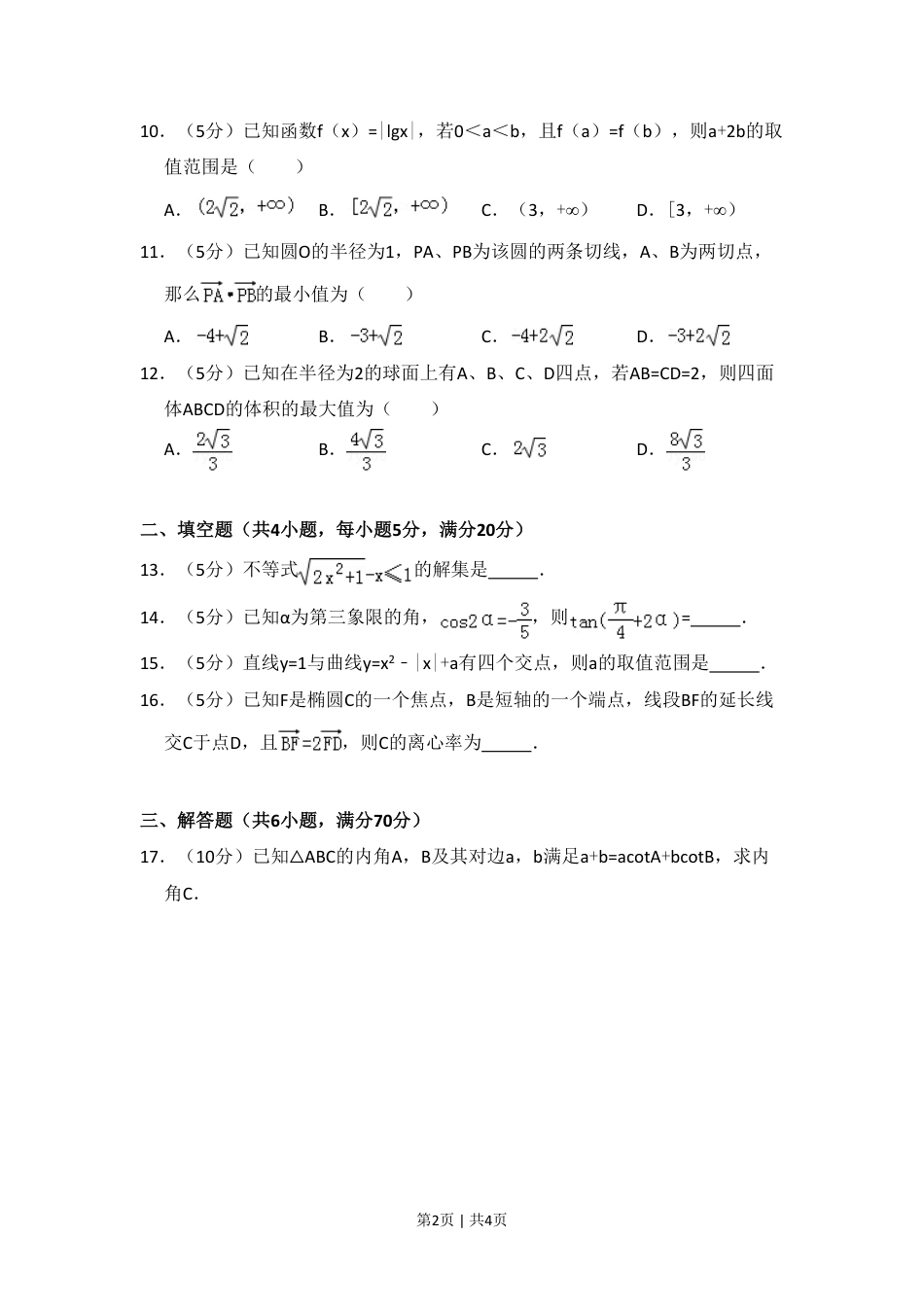 第1页|共4页2010年全国统一高考数学试卷(理科)(大纲版Ⅰ)一、选择题(共12小题,每小题5分,满分60分)1.(5分)复数=()A.iB.﹣iC.12﹣13iD.12+13i2.(5分)记cos(﹣80°)=k,那么tan100°=()A.B.﹣C.D.﹣3.(5分)若变量x,y满足约束条件,则z=x﹣2y的最大值为()A.4B.3C.2D.14.(5分)已知各项均为正数的等比数列{an},a1a2a3=5,a7a8a9=10,则a4a5a6=()A.B.7C.6D.5.(5分)(1+2)3(1﹣)5的展开式中x的系数是()A.﹣4B.﹣2C.2D.46.(5分)某校开设A类选修课3门,B类选择课4门,一位同学从中共选3门,若要求两类课程中各至少选一门,则不同的选法共有()A.30种B.35种C.42种D.48种7.(5分)正方体ABCD﹣A1B1C1D1中,BB1与平面ACD1所成角的余弦值为()A.B.C.D.8.(5分)设a=log32,b=ln2,c=,则()A.a<b<cB.b<c<aC.c<a<bD.c<b<a9.(5分)已知F1、F2为双曲线C:x2﹣y2=1的左、右焦点,点P在C上,∠F1PF2=60°,则P到x轴的距离为()A.B.C.D.第2页|共4页10.(5分)已知函数f(x)=|lgx|,若0<a<b,且f(a)=f(b),则a+2b的取值范围是()A.B.C.(3,+∞)D.[3,+∞)11.(5分)已知圆O的半径为1,PA、PB为该圆的两条切线,A、B为两切点,那么的最小值为()A.B.C.D.12.(5分)已知在半径为2的球面上有A、B、C、D四点,若AB=CD=2,则四面体ABCD的体积的最大值为()A.B.C.D.二、填空题(共4小题,每小题5分,满分20分)13.(5分)不等式的解集是.14.(5分)已知α为第三象限的角,,则=.15.(5分)直线y=1与曲线y=x2﹣|x|+a有四个交点,则a的取值范围是.16.(5分)已知F是椭圆C的一个焦点,B是短轴的一个端点,线段BF的延长线交C于点D,且,则C的离心率为.三、解答题(共6小题,满分70分)17.(10分)已知△ABC的内角A,B及其对边a,b满足a+b=acotA+bcotB,求内角C.第3页|共4页18.(12分)投到某杂志的稿件,先由两位初审专家进行评审.若能通过两位初审专家的评审,则予以录用;若两位初审专家都未予通过,则不予录用;若恰能通过一位初审专家的评审,则再由第三位专家进行复审,若能通过复审专家的评审,则予以录用,否则不予录用.设稿件能通过各初审专家评审的概率均为0.5,复审的稿件能通过评审的概率为0.3.各专家独立评审.(Ⅰ)求投到该杂志的1篇稿件被录用的概率;(Ⅱ)求投到该杂志的4篇稿件中,至少有2篇被录用的概率.19.(12分)如图,四棱锥S﹣ABCD中,SD⊥底面ABCD,AB∥DC,AD⊥DC,AB=AD=1,DC=SD=2,E为棱SB上的一点,平面EDC⊥平面SBC.(Ⅰ)证明:SE=2EB;(Ⅱ)求二面角A﹣DE﹣C的大小.20.(12分)已知函数f(x)=(x+1)lnx﹣x+1.(Ⅰ)若xf′(x)≤x2+ax+1,求a的取值范围;(Ⅱ)证明:(x﹣1)f(x)≥0.第4页|共4页21.(12分)已知抛物线C:y2=4x的焦点为F,过点K(﹣1,0)的直线l与C相交于A、B两点,点A关于x轴的对称点为D.(Ⅰ)证明:点F在直线BD上;(Ⅱ)设,求△BDK的内切圆M的方程.22.(12分)已知数列{an}中,a1=1,an+1=c﹣.(Ⅰ)设c=,bn=,求数列{bn}的通项公式;(Ⅱ)求使不等式an<an+1<3成立的c的取值范围.