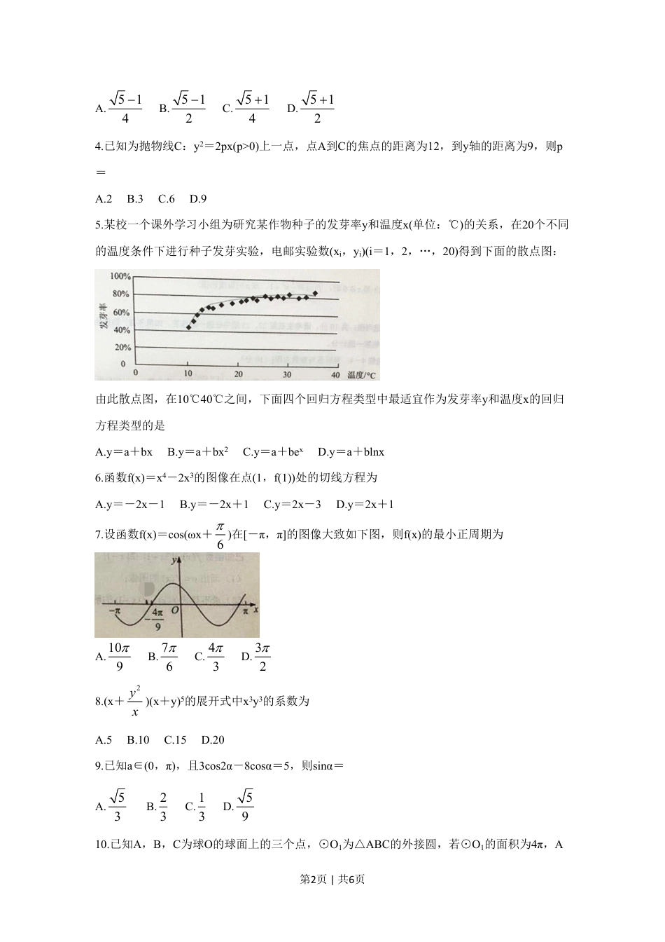 第1页|共6页绝密★启用前2020年普通高等学校招生全国统一考试理科数学本试卷共5页,23题(含选考题)。全卷满分150分。考试用时120分钟。★祝考试顺利★注意事项:1.答题前,先将自己的姓名、准考证号填写在试卷和答题卡上,并将准考证号条形码粘贴在答题卡上的指定位置。2.选择题的作答:每小题选出答案后,用2B铅笔把答题卡上对应题目的答案标号涂黑。写在试卷、草稿纸和答题卡上的非答题区域均无效。3.非选择题的作答:用黑色签字笔直接答在答题卡上对应的答题区域内。写在试卷、草稿纸和答题卡上的非答题区域均无效。4.选考题的作答:先把所选题目的题号在答题卡上指定的位置用2B铅笔涂黑。答案写在答题卡上对应的答题区域内,写在试卷、草稿纸和答题卡上的非答题区域均无效。5.考试结束后,请将本试卷和答题卡一并上交。一、选择题:本题共12小题,每小题5分,共60分。在每小题给出的四个选项中,只有一项是符合题目要求的。1.若z=1+i,则|z2-2z|=A.0B.1C.2D.22.设集合A={x|x2-4≤0},B={x|2x+a≤0},且A∩B={x|-2≤x≤1},则a=A.-4B.-2C.2D.43.埃及胡夫金字塔是古代世界建筑奇迹之一,它的形状可视为一个正四棱锥。以该四棱锥的高为边长的正方形面积等于该四棱锥一个侧面三角形的面积,则其侧面三角形底边上的高与底面正方形的边长的比值为第2页|共6页A.514-B.512-C.514+D.512+4.已知为抛物线C:y2=2px(p>0)上一点,点A到C的焦点的距离为12,到y轴的距离为9,则p=A.2B.3C.6D.95.某校一个课外学习小组为研究某作物种子的发芽率y和温度x(单位:℃)的关系,在20个不同的温度条件下进行种子发芽实验,电邮实验数(xi,yi)(i=1,2,…,20)得到下面的散点图:由此散点图,在10℃40℃之间,下面四个回归方程类型中最适宜作为发芽率y和温度x的回归方程类型的是A.y=a+bxB.y=a+bx2C.y=a+bexD.y=a+blnx6.函数f(x)=x4-2x3的图像在点(1,f(1))处的切线方程为A.y=-2x-1B.y=-2x+1C.y=2x-3D.y=2x+17.设函数f(x)=cos(ωx+6p)在[-π,π]的图像大致如下图,则f(x)的最小正周期为A.109pB.76pC.43pD.32p8.(x+2yx)(x+y)5的展开式中x3y3的系数为A.5B.10C.15D.209.已知a∈(0,π),且3cos2α-8cosα=5,则sinα=A.53B.23C.13D.5910.已知A,B,C为球O的球面上的三个点,⊙O1为△ABC的外接圆,若⊙O1的面积为4π,A第3页|共6页B=BC=AC=OO1,则球O的表面积为A.64πB.48πC.36πD.32π1..已知⊙M:x2+y2-2x-2y-2=0,直线l:2x+y+2=0,P为l上的动点,过点P作⊙M的切线PA,PB,切点为A,B,当|PM|·|AB|最小时,直线AB的方程为A.2x-y-1=0B.2x+y-1=0C.2x-y+1=0D.2x+y+1=012.若2a+log2a=4b+2log4b,则A.a>2bB.a<2bC.a>b2D.a<b2二、填空题:本题共4小题,每小题5分,共20分。13.若x,y满足约束条件2201010xyxyy+-£--³+³ìïíïî,则z=x+7y的最大值为。14.a,b为单位向量,且|a+b|=1,则|a-b|=。15.已知F为双曲线C:22221(0,0)xyabab-=>>的右焦点,A为C的右项点,B为C上的点,且BF垂直于x轴。若AB的斜率为3,则C的离心率为。16.如图,在三棱锥P-ABC的平面展开图中,AC=1,AB=AD=3,AB⊥AC,AB⊥AD,∠CAE=30°,则cos∠FCB=。第4页|共6页三、解答题:共70分。解答应写出文字说明、证明过程或演算步骤。第17~21题为必考题,每个试题考生都必须作答。第22、23题为选考题,考生根据要求作答。(一)必考题:共60分。17.(12分)设{an}是公比不为1的等比数列,a1为a2,a3的等差中项。(1)求{an}的公比;(2)若a1=1,求数列{nan}的前n项和。18.(12分)如图,D为圆锥的项点,O是圆锥底面的圆心,AE为底面直径,AE=AD。△ABC是底面的内接正三角形,P为DO上一点,PO=66DO。(1)证明:PA⊥平面PBC;(2)求二面角B-PC-E的余弦值。19.(12分)甲、乙、丙三位同学进行羽毛球比赛,约定赛制如下:累计负两场者被淘汰;比赛前抽签决定首先比赛的两人,另一人轮空:每场比赛的胜者与轮空者进行下一场比赛,负者下一场轮空,直至有一人被淘汰:当一人被淘汰后,剩余的两人继续比赛,直至其中人被淘汰,另一人最终获胜,比赛结束。经抽签,甲...