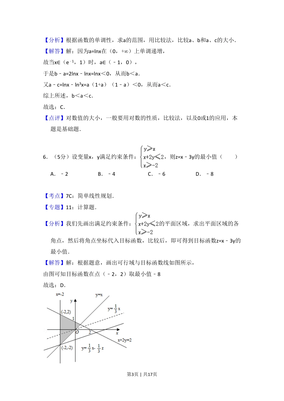 第1页|共17页2008年全国统一高考数学试卷(文科)(全国卷Ⅱ)参考答案与试题解析一、选择题(共12小题,每小题5分,满分60分)1.(5分)若sinα<0且tanα>0,则α是()A.第一象限角B.第二象限角C.第三象限角D.第四象限角【考点】GC:三角函数值的符号.菁优网版权所有【分析】由正弦和正切的符号确定角的象限,当正弦值小于零时,角在第三四象限,当正切值大于零,角在第一三象限,要同时满足这两个条件,角的位置是第三象限,实际上我们解的是不等式组.【解答】解:sinα<0,α在三、四象限;tanα>0,α在一、三象限.故选:C.【点评】记住角在各象限的三角函数符号是解题的关键,可用口诀帮助记忆:一全部,二正弦,三切值,四余弦,它们在上面所述的象限为正2.(5分)设集合M={m∈Z|﹣3<m<2},N={n∈Z|﹣1≤n≤3},则M∩N=()A.{0,1}B.{﹣1,0,1}C.{0,1,2}D.{﹣1,0,1,2}【考点】1E:交集及其运算.菁优网版权所有【分析】由题意知集合M={m∈z|﹣3<m<2},N={n∈z|﹣1≤n≤3},然后根据交集的定义和运算法则进行计算.【解答】解: M={﹣2,﹣1,0,1},N={﹣1,0,1,2,3},∴M∩N={﹣1,0,1},故选:B.【点评】此题主要考查集合和交集的定义及其运算法则,是一道比较基础的题第2页|共17页.3.(5分)原点到直线x+2y﹣5=0的距离为()A.1B.C.2D.【考点】IT:点到直线的距离公式.菁优网版权所有【分析】用点到直线的距离公式直接求解.【解答】解析:.故选:D.【点评】点到直线的距离公式是高考考点,是同学学习的重点,本题是基础题.4.(5分)函数f(x)=﹣x的图象关于()A.y轴对称B.直线y=﹣x对称C.坐标原点对称D.直线y=x对称【考点】3M:奇偶函数图象的对称性.菁优网版权所有【分析】根据函数f(x)的奇偶性即可得到答案.【解答】解: f(﹣x)=﹣+x=﹣f(x)∴是奇函数,所以f(x)的图象关于原点对称故选:C.【点评】本题主要考查函数奇偶性的性质,是高考必考题型.5.(5分)若x∈(e﹣1,1),a=lnx,b=2lnx,c=ln3x,则()A.a<b<cB.c<a<bC.b<a<cD.b<c<a【考点】4M:对数值大小的比较.菁优网版权所有第3页|共17页【分析】根据函数的单调性,求a的范围,用比较法,比较a、b和a、c的大小.【解答】解:因为a=lnx在(0,+∞)上单调递增,故当x∈(e﹣1,1)时,a∈(﹣1,0),于是b﹣a=2lnx﹣lnx=lnx<0,从而b<a.又a﹣c=lnx﹣ln3x=a(1+a)(1﹣a)<0,从而a<c.综上所述,b<a<c.故选:C.【点评】对数值的大小,一般要用对数的性质,比较法,以及0或1的应用,本题是基础题.6.(5分)设变量x,y满足约束条件:,则z=x﹣3y的最小值()A.﹣2B.﹣4C.﹣6D.﹣8【考点】7C:简单线性规划.菁优网版权所有【专题】11:计算题.【分析】我们先画出满足约束条件:的平面区域,求出平面区域的各角点,然后将角点坐标代入目标函数,比较后,即可得到目标函数z=x﹣3y的最小值.【解答】解:根据题意,画出可行域与目标函数线如图所示,由图可知目标函数在点(﹣2,2)取最小值﹣8故选:D.第4页|共17页【点评】用图解法解决线性规划问题时,分析题目的已知条件,找出约束条件和目标函数是关键,可先将题目中的量分类、列出表格,理清头绪,然后列出不等式组(方程组)寻求约束条件,并就题目所述找出目标函数.然后将可行域各角点的值一一代入,最后比较,即可得到目标函数的最优解.7.(5分)设曲线y=ax2在点(1,a)处的切线与直线2x﹣y﹣6=0平行,则a=()A.1B.C.D.﹣1【考点】6H:利用导数研究曲线上某点切线方程.菁优网版权所有【分析】利用曲线在切点处的导数为斜率求曲线的切线斜率;利用直线平行它们的斜率相等列方程求解.【解答】解:y'=2ax,于是切线的斜率k=y'|x=1=2a, 切线与直线2x﹣y﹣6=0平行∴有2a=2∴a=1故选:A.【点评】本题考查导数的几何意义:曲线在切点处的导数值是切线的斜率.8.(5分)正四棱锥的侧棱长为,侧棱与底面所成的角为60°,则该棱锥的体积为()A.3B.6C.9D.18【考点】LF:棱柱、棱锥、棱台的体积.菁优网版权所有【专题】11:计算题.【分析】...