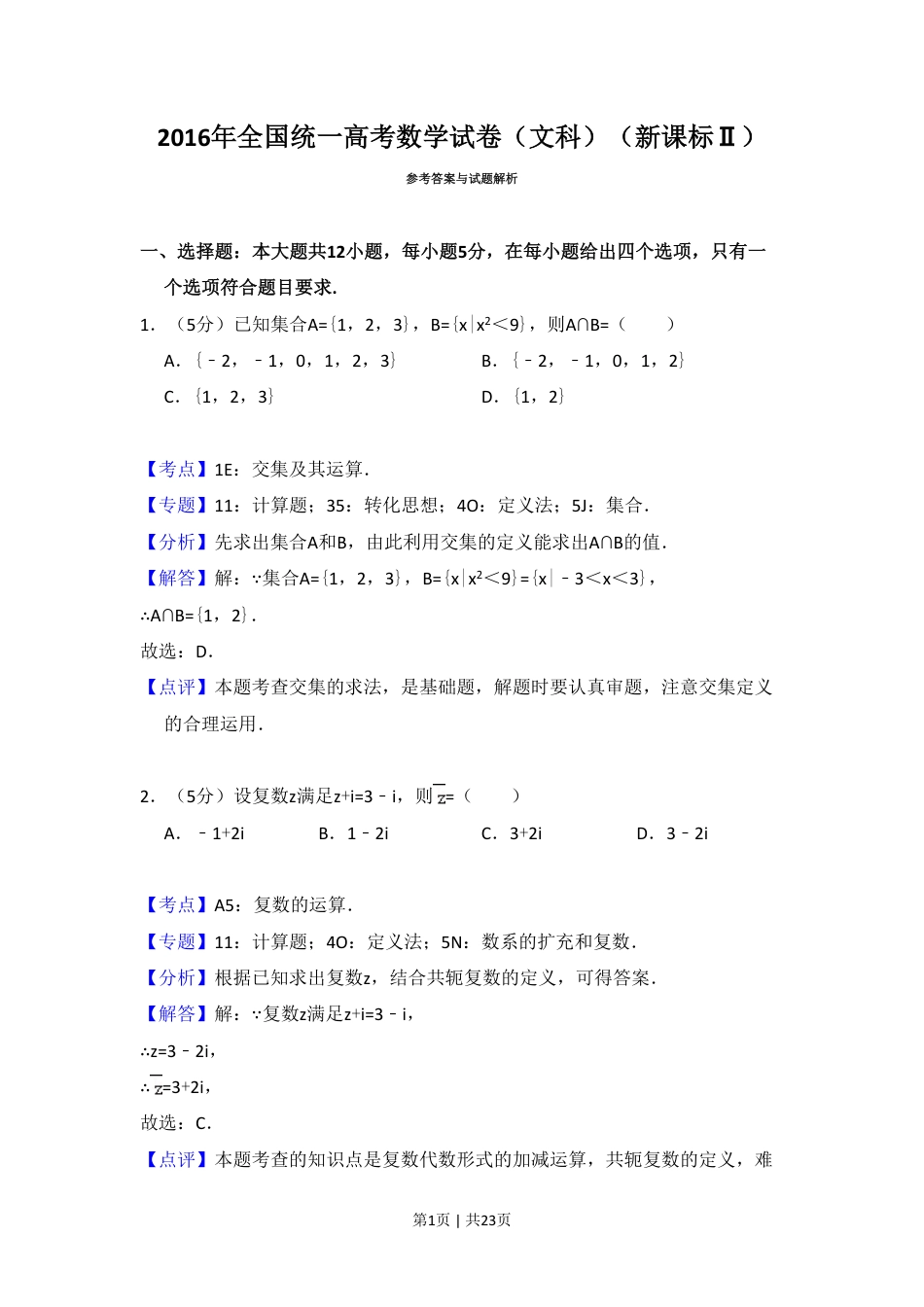 第1页|共23页2016年全国统一高考数学试卷(文科)(新课标Ⅱ)参考答案与试题解析一、选择题:本大题共12小题,每小题5分,在每小题给出四个选项,只有一个选项符合题目要求.1.(5分)已知集合A={1,2,3},B={x|x2<9},则A∩B=()A.{﹣2,﹣1,0,1,2,3}B.{﹣2,﹣1,0,1,2}C.{1,2,3}D.{1,2}【考点】1E:交集及其运算.菁优网版权所有【专题】11:计算题;35:转化思想;4O:定义法;5J:集合.【分析】先求出集合A和B,由此利用交集的定义能求出A∩B的值.【解答】解: 集合A={1,2,3},B={x|x2<9}={x|﹣3<x<3},∴A∩B={1,2}.故选:D.【点评】本题考查交集的求法,是基础题,解题时要认真审题,注意交集定义的合理运用.2.(5分)设复数z满足z+i=3﹣i,则=()A.﹣1+2iB.1﹣2iC.3+2iD.3﹣2i【考点】A5:复数的运算.菁优网版权所有【专题】11:计算题;4O:定义法;5N:数系的扩充和复数.【分析】根据已知求出复数z,结合共轭复数的定义,可得答案.【解答】解: 复数z满足z+i=3﹣i,∴z=3﹣2i,∴=3+2i,故选:C.【点评】本题考查的知识点是复数代数形式的加减运算,共轭复数的定义,难第2页|共23页度不大,属于基础题.3.(5分)函数y=Asin(ωx+φ)的部分图象如图所示,则()A.y=2sin(2x﹣)B.y=2sin(2x﹣)C.y=2sin(x+)D.y=2sin(x+)【考点】HK:由y=Asin(ωx+φ)的部分图象确定其解析式.菁优网版权所有【专题】35:转化思想;4R:转化法;57:三角函数的图像与性质.【分析】根据已知中的函数y=Asin(ωx+φ)的部分图象,求出满足条件的A,ω,φ值,可得答案.【解答】解:由图可得:函数的最大值为2,最小值为﹣2,故A=2,=,故T=π,ω=2,故y=2sin(2x+φ),将(,2)代入可得:2sin(+φ)=2,则φ=﹣满足要求,故y=2sin(2x﹣),故选:A.【点评】本题考查的知识点是由y=Asin(ωx+φ)的部分图象确定其解析式,确定各个参数的值是解答的关键.4.(5分)体积为8的正方体的顶点都在同一球面上,则该球面的表面积为(第3页|共23页)A.12πB.πC.8πD.4π【考点】LG:球的体积和表面积.菁优网版权所有【专题】11:计算题;34:方程思想;49:综合法;5U:球.【分析】先通过正方体的体积,求出正方体的棱长,然后求出球的半径,即可求出球的表面积.【解答】解:正方体体积为8,可知其边长为2,正方体的体对角线为=2,即为球的直径,所以半径为,所以球的表面积为=12π.故选:A.【点评】本题考查学生的空间想象能力,体积与面积的计算能力,是基础题.5.(5分)设F为抛物线C:y2=4x的焦点,曲线y=(k>0)与C交于点P,PF⊥x轴,则k=()A.B.1C.D.2【考点】K8:抛物线的性质.菁优网版权所有【专题】35:转化思想;4R:转化法;5D:圆锥曲线的定义、性质与方程.【分析】根据已知,结合抛物线的性质,求出P点坐标,再由反比例函数的性质,可得k值.【解答】解:抛物线C:y2=4x的焦点F为(1,0),曲线y=(k>0)与C交于点P在第一象限,由PF⊥x轴得:P点横坐标为1,代入C得:P点纵坐标为2,故k=2,故选:D.第4页|共23页【点评】本题考查的知识点是抛物线的简单性质,反比例函数的性质,难度中档.6.(5分)圆x2+y2﹣2x﹣8y+13=0的圆心到直线ax+y﹣1=0的距离为1,则a=()A.﹣B.﹣C.D.2【考点】IT:点到直线的距离公式;J9:直线与圆的位置关系.菁优网版权所有【专题】35:转化思想;4R:转化法;5B:直线与圆.【分析】求出圆心坐标,代入点到直线距离方程,解得答案.【解答】解:圆x2+y2﹣2x﹣8y+13=0的圆心坐标为:(1,4),故圆心到直线ax+y﹣1=0的距离d==1,解得:a=,故选:A.【点评】本题考查的知识点是圆的一般方程,点到直线的距离公式,难度中档.7.(5分)如图是由圆柱与圆锥组合而成的几何体的三视图,则该几何体的表面积为()A.20πB.24πC.28πD.32π【考点】L!:由三视图求面积、体积.菁优网版权所有第5页|共23页【专题】15:综合题;35:转化思想;49:综合法;5F:空间位置关系与距离.【分析】空间几何体是一个组合体,上面是一个圆锥,圆锥的底面直径是4,圆锥的高是2...
