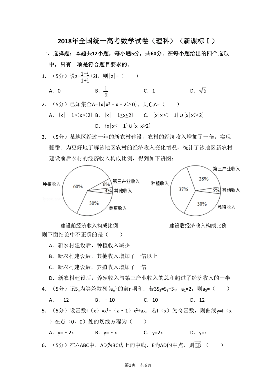 第1页|共6页2018年全国统一高考数学试卷(理科)(新课标Ⅰ)一、选择题:本题共12小题,每小题5分,共60分。在每小题给出的四个选项中,只有一项是符合题目要求的。1.(5分)设z=+2i,则|z|=()A.0B.C.1D.2.(5分)已知集合A={x|x2﹣x﹣2>0},则∁RA=()A.{x|﹣1<x<2}B.{x|﹣1≤x≤2}C.{x|x<﹣1}∪{x|x>2}D.{x|x≤﹣1}∪{x|x≥2}3.(5分)某地区经过一年的新农村建设,农村的经济收入增加了一倍,实现翻番.为更好地了解该地区农村的经济收入变化情况,统计了该地区新农村建设前后农村的经济收入构成比例,得到如下饼图:则下面结论中不正确的是()A.新农村建设后,种植收入减少B.新农村建设后,其他收入增加了一倍以上C.新农村建设后,养殖收入增加了一倍D.新农村建设后,养殖收入与第三产业收入的总和超过了经济收入的一半4.(5分)记Sn为等差数列{an}的前n项和.若3S3=S2+S4,a1=2,则a5=()A.﹣12B.﹣10C.10D.125.(5分)设函数f(x)=x3+(a﹣1)x2+ax.若f(x)为奇函数,则曲线y=f(x)在点(0,0)处的切线方程为()A.y=﹣2xB.y=﹣xC.y=2xD.y=x6.(5分)在△ABC中,AD为BC边上的中线,E为AD的中点,则=()第2页|共6页A.﹣B.﹣C.+D.+7.(5分)某圆柱的高为2,底面周长为16,其三视图如图.圆柱表面上的点M在正视图上的对应点为A,圆柱表面上的点N在左视图上的对应点为B,则在此圆柱侧面上,从M到N的路径中,最短路径的长度为()A.2B.2C.3D.28.(5分)设抛物线C:y2=4x的焦点为F,过点(﹣2,0)且斜率为的直线与C交于M,N两点,则•=()A.5B.6C.7D.89.(5分)已知函数f(x)=,g(x)=f(x)+x+a.若g(x)存在2个零点,则a的取值范围是()A.[﹣1,0)B.[0,+∞)C.[﹣1,+∞)D.[1,+∞)10.(5分)如图来自古希腊数学家希波克拉底所研究的几何图形.此图由三个半圆构成,三个半圆的直径分别为直角三角形ABC的斜边BC,直角边AB,AC.△ABC的三边所围成的区域记为I,黑色部分记为Ⅱ,其余部分记为Ⅲ.在整个图形中随机取一点,此点取自Ⅰ,Ⅱ,Ⅲ的概率分别记为p1,p2,p3,则()A.p1=p2B.p1=p3C.p2=p3D.p1=p2+p311.(5分)已知双曲线C:﹣y2=1,O为坐标原点,F为C的右焦点,过F的直第3页|共6页线与C的两条渐近线的交点分别为M,N.若△OMN为直角三角形,则|MN|=()A.B.3C.2D.412.(5分)已知正方体的棱长为1,每条棱所在直线与平面α所成的角都相等,则α截此正方体所得截面面积的最大值为()A.B.C.D.二、填空题:本题共4小题,每小题5分,共20分。13.(5分)若x,y满足约束条件,则z=3x+2y的最大值为.14.(5分)记Sn为数列{an}的前n项和.若Sn=2an+1,则S6=.15.(5分)从2位女生,4位男生中选3人参加科技比赛,且至少有1位女生入选,则不同的选法共有种.(用数字填写答案)16.(5分)已知函数f(x)=2sinx+sin2x,则f(x)的最小值是.三、解答题:共70分。解答应写出文字说明、证明过程或演算步骤。第17~21题为必考题,每个试题考生都必须作答。第22、23题为选考题,考生根据要求作答。(一)必考题:共60分。17.(12分)在平面四边形ABCD中,∠ADC=90°,∠A=45°,AB=2,BD=5.(1)求cos∠ADB;(2)若DC=2,求BC.第4页|共6页18.(12分)如图,四边形ABCD为正方形,E,F分别为AD,BC的中点,以DF为折痕把△DFC折起,使点C到达点P的位置,且PF⊥BF.(1)证明:平面PEF⊥平面ABFD;(2)求DP与平面ABFD所成角的正弦值.19.(12分)设椭圆C:+y2=1的右焦点为F,过F的直线l与C交于A,B两点,点M的坐标为(2,0).(1)当l与x轴垂直时,求直线AM的方程;(2)设O为坐标原点,证明:∠OMA=∠OMB.第5页|共6页20.(12分)某工厂的某种产品成箱包装,每箱200件,每一箱产品在交付用户之前要对产品作检验,如检验出不合格品,则更换为合格品.检验时,先从这箱产品中任取20件作检验,再根据检验结果决定是否对余下的所有产品作检验.设每件产品为不合格品的概率都为p(0<p<1),且各件产品是否为不合格品相互独立.(1)记20件产品中恰有2件不合格品的概率为f(p),求f(p)...