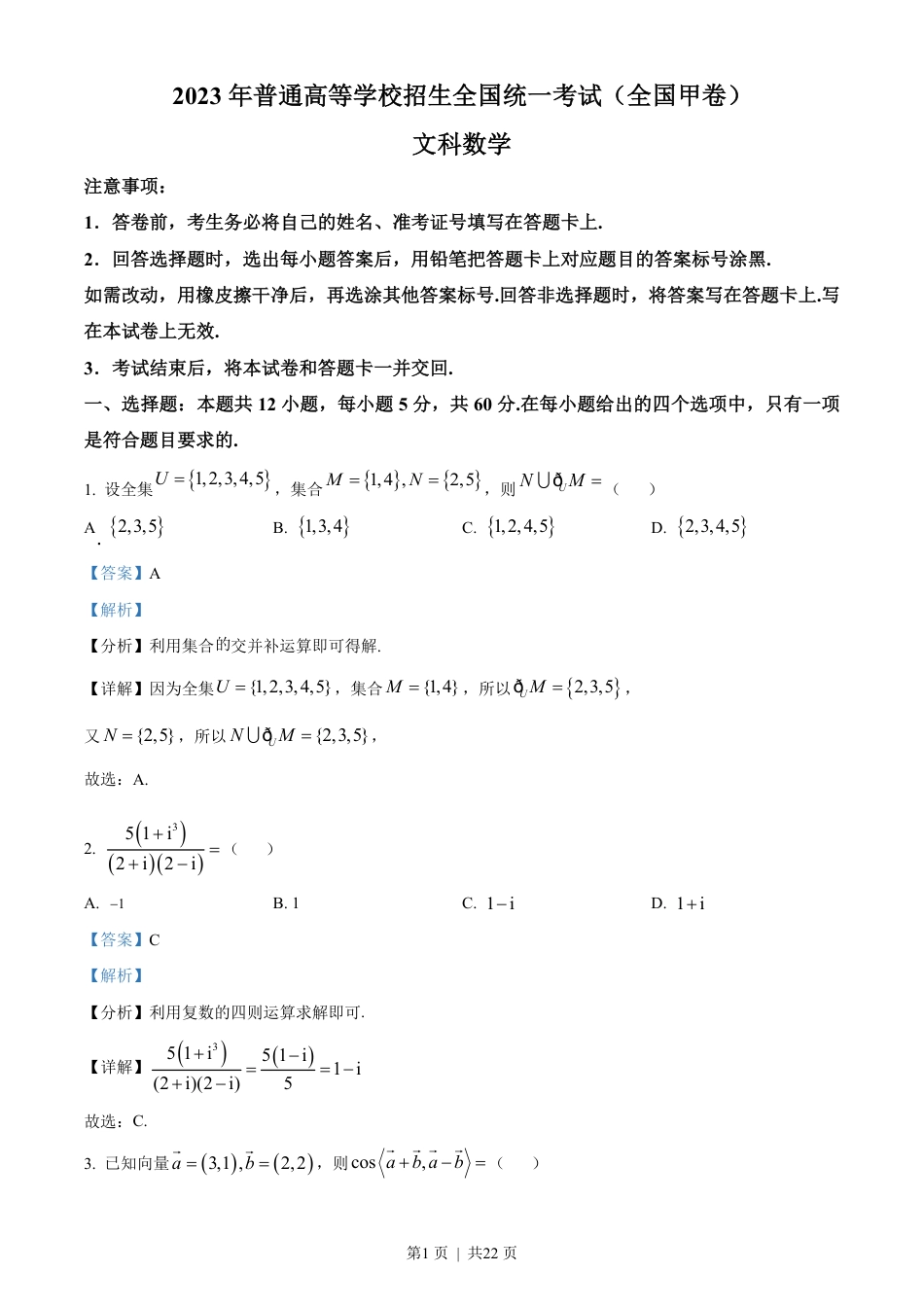 第1页|共22页2023年普通高等学校招生全国统一考试(全国甲卷)文科数学注意事项:1.答卷前,考生务必将自己的姓名、准考证号填写在答题卡上.2.回答选择题时,选出每小题答案后,用铅笔把答题卡上对应题目的答案标号涂黑.如需改动,用橡皮擦干净后,再选涂其他答案标号.回答非选择题时,将答案写在答题卡上.写在本试卷上无效.3.考试结束后,将本试卷和答题卡一并交回.一、选择题:本题共12小题,每小题5分,共60分.在每小题给出的四个选项中,只有一项是符合题目要求的.1.设全集1,2,3,4,5U=,集合1,4,2,5MN==,则UNM=Uð()A2,3,5B.1,3,4C.1,2,4,5D.2,3,4,5【答案】A【解析】【分析】利用集合交并补运算即可得解.【详解】因为全集{1,2,3,4,5}U=,集合{1,4}M=,所以2,3,5UM=ð,又{2,5}N=,所以{2,3,5}UNM=Uð,故选:A.2.351i2i2i+=+-()A.1-B.1C.1i-D.1i+【答案】C【解析】【分析】利用复数的四则运算求解即可.【详解】351i51i1i(2i)(2i)5+-==-+-故选:C.3.已知向量3,1,2,2ab==rr,则cos,abab+-=rrrr().的第2页|共22页A.117B.1717C.55D.255【答案】B【解析】【分析】利用平面向量模与数量积的坐标表示分别求得,,abababab+-+×-rrrrrrrr,从而利用平面向量余弦的运算公式即可得解.【详解】因为(3,1),(2,2)ab==rr,所以5,3,1,1abab+=-=-rrrr,则225334,112abab+=+=-=+=rrrr,51312abab+×-=´+´-=rrrr,所以217cos,17342abababababab+×-+-===´+-rrrrrrrrrrrr.故选:B.4.某校文艺部有4名学生,其中高一、高二年级各2名.从这4名学生中随机选2名组织校文艺汇演,则这2名学生来自不同年级的概率为()A.16B.13C.12D.23【答案】D【解析】【分析】利用古典概率的概率公式,结合组合的知识即可得解.【详解】依题意,从这4名学生中随机选2名组织校文艺汇演,总的基本事件有24C6=件,其中这2名学生来自不同年级的基本事件有1122CC4=,所以这2名学生来自不同年级的概率为4263=.故选:D.5.记nS为等差数列na的前n项和.若264810,45aaaa+==,则5S=()A.25B.22C.20D.15【答案】C【解析】【分析】方法一:根据题意直接求出等差数列na的公差和首项,再根据前n项和公式即可解出;方法二:根据等差数列的性质求出等差数列na的公差,再根据前n项和公式的性质即可解出.第3页|共22页【详解】方法一:设等差数列na的公差为d,首项为1a,依题意可得,2611510aaadad+=+++=,即135ad+=,又48113745aaadad=++=,解得:11,2da==,所以515455210202Sad´=+´=´+=.故选:C.方法二:264210aaa+==,4845aa=,所以45a=,89a=,从而84184aad-==-,于是34514aad=-=-=,所以53520Sa==.故选:C.6.执行下边的程序框图,则输出的B=()A21B.34C.55D.89【答案】B【解析】【分析】根据程序框图模拟运行即可解出.【详解】当1k=时,判断框条件满足,第一次执行循环体,123A=+=,325B=+=,112k=+=;当2k=时,判断框条件满足,第二次执行循环体,358A=+=,8513B=+=,213k=+=;当3k=时,判断框条件满足,第三次执行循环体,81321A=+=,211334B=+=,314k=+=;当4k=时,判断框条件不满足,跳出循环体,输出34B=.故选:B..第4页|共22页7.设12,FF为椭圆22:15xCy+=的两个焦点,点P在C上,若120PFPF×=uuuruuuur,则12PFPF×=()A.1B.2C.4D.5【答案】B【解析】【分析】方法一:根据焦点三角形面积公式求出12PFF△的面积,即可解出;方法二:根据椭圆的定义以及勾股定理即可解出.【详解】方法一:因为120PFPF×=uuuruuuur,所以1290FPFÐ=o,从而122121tan4512FPFSbPFPF===´×oV,所以122PFPF×=.故选:B.方法二:因为120PFPF×=uuuruuuur,所以1290FPFÐ=o,由椭圆方程可知,25142cc=-=Þ=,所以22221212416PFPFFF+===,又12225PFPFa+==,平方得:22121212216220PFPFPFPFPFPF++=+=,所以122PFPF×=.故选:B.8.曲线e1=+xyx在点e1,2æöç÷èø处的切线方程为()A.e4yx=B.e2yx=C.ee44yx=+D.e3e24yx=+【答案】C【解析】【分析】先由切点设切线方程,再求函数的导数,把切点的横坐标代入...