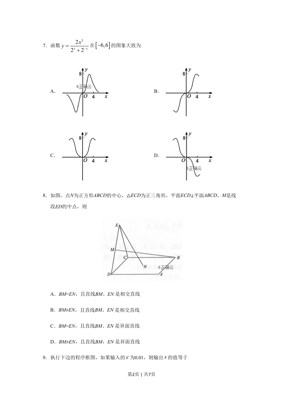 第1页|共7页绝密★启用前2019年全国统一高考数学试卷(理科)(新课标Ⅲ)一、选择题:本题共12小题,每小题5分,共60分。在每小题给的四个选项中,只有一项是符合题目要求的。1.已知集合2{1,0,1,2}{1}ABxx=-=£,,则AB=IA.1,0,1-B.0,1C.1,1-D.0,1,22.若(1i)2iz+=,则z=A.1i--B.1+i-C.1i-D.1+i3.《西游记》《三国演义》《水浒传》和《红楼梦》是中国古典文学瑰宝,并称为中国古典小说四大名著.某中学为了解本校学生阅读四大名著的情况,随机调查了100学生,其中阅读过《西游记》或《红楼梦》的学生共有90位,阅读过《红楼梦》的学生共有80位,阅读过《西游记》且阅读过《红楼梦》的学生共有60位,则该校阅读过《西游记》的学生人数与该校学生总数比值的估计值为A.0.5B.0.6C.0.7D.0.84.(1+2x2)(1+x)4的展开式中x3的系数为A.12B.16C.20D.245.已知各项均为正数的等比数列{an}的前4项为和为15,且a5=3a3+4a1,则a3=A.16B.8C.4D.26.已知曲线elnxyaxx=+在点(1,ae)处的切线方程为y=2x+b,则A.e1ab==-,B.a=e,b=1C.1e1ab-==,D.1ea-=,1b=-第2页|共7页7.函数3222xxxy-=+在6,6-的图象大致为A.B.C.D.8.如图,点N为正方形ABCD的中心,△ECD为正三角形,平面ECD⊥平面ABCD,M是线段ED的中点,则A.BM=EN,且直线BM、EN是相交直线B.BM≠EN,且直线BM,EN是相交直线C.BM=EN,且直线BM、EN是异面直线D.BM≠EN,且直线BM,EN是异面直线9.执行下边的程序框图,如果输入的e为0.01,则输出s的值等于第3页|共7页A.4122-B.5122-C.6122-D.7122-10.双曲线C:2242xy-=1的右焦点为F,点P在C的一条渐进线上,O为坐标原点,若=POPF,则△PFO的面积为A.324B.322C.22D.3211.设fx是定义域为R的偶函数,且在0,¥单调递减,则A.f(log314)>f(322-)>f(232-)B.f(log314)>f(232-)>f(322-)C.f(322-)>f(232-)>f(log314)D.f(232-)>f(322-)>f(log314)12.设函数fx=sin(5xwp+)(w>0),已知fx在0,2p有且仅有5个零点,下述四个结论:①fx在(0,2p)有且仅有3个极大值点第4页|共7页②fx在(0,2p)有且仅有2个极小值点③fx在(0,10p)单调递增④w的取值范围是[1229510,)其中所有正确结论的编号是A.①④B.②③C.①②③D.①③④二、填空题:本题共4小题,每小题5分,共20分。13.已知a,b为单位向量,且a·b=0,若25=-cab,则cos,<>=ac___________.14.记Sn为等差数列{an}的前n项和,12103aaa=≠,,则105SS=___________.15.设12FF,为椭圆C:22+13620xy=的两个焦点,M为C上一点且在第一象限.若12MFF△为等腰三角形,则M的坐标为___________.16.学生到工厂劳动实践,利用3D打印技术制作模型.如图,该模型为长方体1111ABCDABCD-挖去四棱锥O—EFGH后所得几何体,其中O为长方体的中心,E,F,G,H分别为所在棱的中点,16cm4cmAB=BC=,AA=,3D打印所用原料密度为0.9g/cm3,不考虑打印损耗,制作该模型所需原料的质量为___________.第5页|共7页三、解答题:共70分。解答应写出文字说明、证明过程或演算步骤。第17~21题为必考题,每个试题考生都必须作答。第22、23题为选考题,考生根据要求作答。(一)必考题:共60分。17.(12分)为了解甲、乙两种离子在小鼠体内的残留程度,进行如下试验:将200只小鼠随机分成A、B两组,每组100只,其中A组小鼠给服甲离子溶液,B组小鼠给服乙离子溶液,每组小鼠给服的溶液体积相同、摩尔浓度相同.经过一段时间后用某种科学方法测算出残留在小鼠体内离子的百分比.根据试验数据分别得到如下直方图:记C为事件:“乙离子残留在体内的百分比不低于5.5”,根据直方图得到P(C)的估计值为0.70.(1)求乙离子残留百分比直方图中a,b的值;(2)分别估计甲、乙离子残留百分比的平均值(同一组中的数据用该组区间的中点值为代表).18.(12分)△ABC的内角A、B、C的对边分别为a、b、c,已知sinsin2ACabA+=.(1)求B;(2)若△ABC为锐角三角形,且c=1,求△ABC面积的取值范围.19.(12分)第6页|共7页图1是由矩形ADEB、Rt△ABC和菱形BFGC组成...