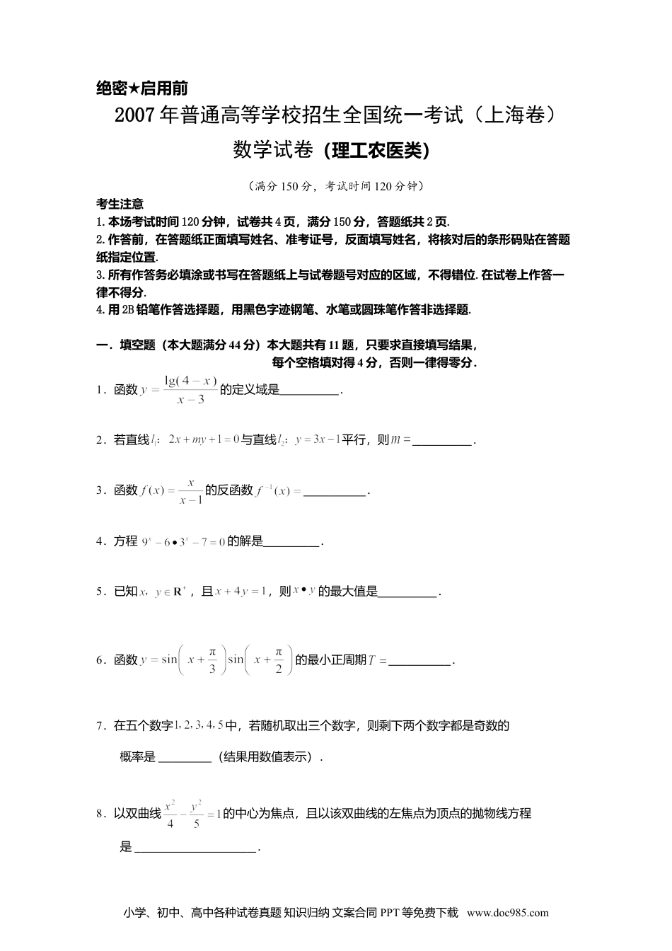 绝密★启用前2007年普通高等学校招生全国统一考试(上海卷)数学试卷(理工农医类)(满分150分,考试时间120分钟)考生注意1.本场考试时间120分钟,试卷共4页,满分150分,答题纸共2页.2.作答前,在答题纸正面填写姓名、准考证号,反面填写姓名,将核对后的条形码贴在答题纸指定位置.3.所有作答务必填涂或书写在答题纸上与试卷题号对应的区域,不得错位.在试卷上作答一律不得分.4.用2B铅笔作答选择题,用黑色字迹钢笔、水笔或圆珠笔作答非选择题.一.填空题(本大题满分44分)本大题共有11题,只要求直接填写结果,每个空格填对得4分,否则一律得零分.1.函数的定义域是.2.若直线与直线平行,则.3.函数的反函数.4.方程的解是.5.已知,且,则的最大值是.6.函数的最小正周期.7.在五个数字中,若随机取出三个数字,则剩下两个数字都是奇数的概率是(结果用数值表示).8.以双曲线的中心为焦点,且以该双曲线的左焦点为顶点的抛物线方程是.小学、初中、高中各种试卷真题知识归纳文案合同PPT等免费下载www.doc985.com9.对于非零实数,以下四个命题都成立:①;②;③若,则;④若,则.那么,对于非零复数,仍然成立的命题的所有序号是.10.在平面上,两条直线的位置关系有相交、平行、重合三种.已知是两个相交平面,空间两条直线在上的射影是直线,在上的射影是直线.用与,与的位置关系,写出一个总能确定与是异面直线的充分条件:.11.已知为圆上任意一点(原点除外),直线的倾斜角为弧度,记.在右侧的坐标系中,画出以为坐标的点的轨迹的大致图形为二.选择题(本大题满分16分)本大题共有4题,每题都给出代号为A,B,C,D的四个结论,其中有且只有一个结论是正确的,必须把正确结论的代号写在题后的圆括号内,选对得4分,不选、选错或者选出的代号超过一个(不论是否都写在圆括号内),一律得零分.12.已知,且(是虚数单位)是实系数一元二次方程的两个根,那么的值分别是()A.B.C.D.13.设是非零实数,若,则下列不等式成立的是()小学、初中、高中各种试卷真题知识归纳文案合同PPT等免费下载www.doc985.comA.B.C.D.14.直角坐标系中,分别是与轴正方向同向的单位向量.在直角三角形中,若,则的可能值个数是()A.1B.2C.3D.415.设是定义在正整数集上的函数,且满足:“当成立时,总可推出成立”.那么,下列命题总成立的是()A.若成立,则当时,均有成立B.若成立,则当时,均有成立C.若成立,则当时,均有成立D.若成立,则当时,均有成立三.解答题(本大题满分90分)本大题共有6题,解答下列各题必须写出必要的步骤.16.(本题满分12分)如图,在体积为1的直三棱柱中,.求直线与平面所成角的大小(结果用反三角函数值表示).小学、初中、高中各种试卷真题知识归纳文案合同PPT等免费下载www.doc985.comCB1B1AA1C17.(本题满分14分)在中,分别是三个内角的对边.若,,求的面积.18.(本题满分14分)本题共有2个小题,第1小题满分6分,第2小题满分8分.近年来,太阳能技术运用的步伐日益加快.2002年全球太阳电池的年生产量达到670兆瓦,年生产量的增长率为34%.以后四年中,年生产量的增长率逐年递增2%(如,2003年的年生产量的增长率为36%).(1)求2006年全球太阳电池的年生产量(结果精确到0.1兆瓦);(2)目前太阳电池产业存在的主要问题是市场安装量远小于生产量,2006年的实际安装量为1420兆瓦.假设以后若干年内太阳电池的年生产量的增长率保持在42%,到2010年,要使年安装量与年生产量基本持平(即年安装量不少于年生产量的95%),这四年中太阳电池的年安装量的平均增长率至少应达到多少(结果精确到0.1%)?小学、初中、高中各种试卷真题知识归纳文案合同PPT等免费下载www.doc985.com19.(本题满分14分)本题共有2个小题,第1小题满分7分,第2小题满分7分.已知函数,常数.(1)讨论函数的奇偶性,并说明理由;(2)若函数在上为增函数,求的取值范围.20.(本题满分18分)本题共有3个小题,第1小题满分3分,第2小题满分6分,第3小题满分9分.如果有穷数列(为正整数)满足条件,,…,,即(...
