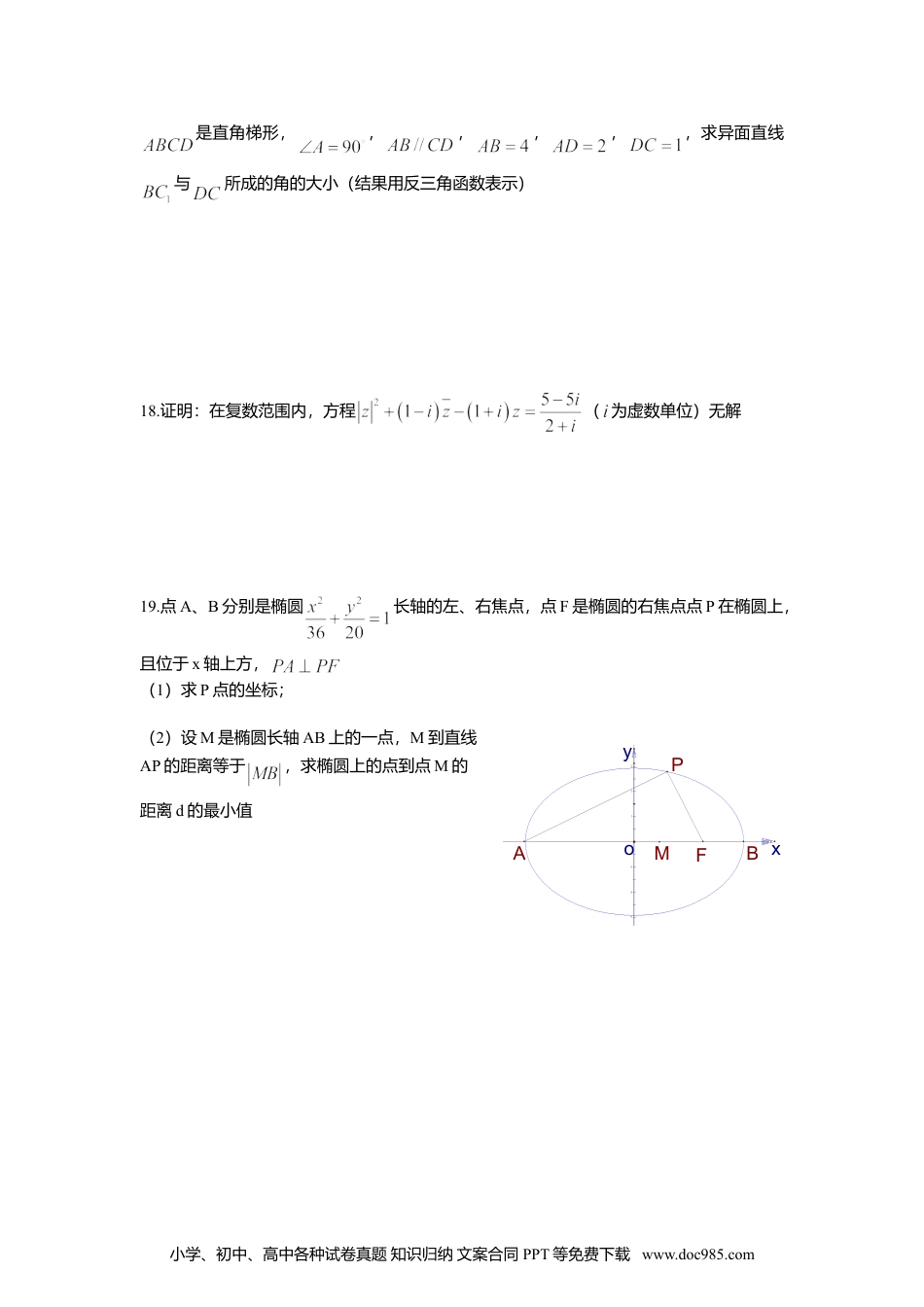 绝密★启用前2005年普通高等学校招生全国统一考试(上海卷)数学试卷(理工农医类)(满分150分,考试时间120分钟)考生注意1.本场考试时间120分钟,试卷共4页,满分150分,答题纸共2页.2.作答前,在答题纸正面填写姓名、准考证号,反面填写姓名,将核对后的条形码贴在答题纸指定位置.3.所有作答务必填涂或书写在答题纸上与试卷题号对应的区域,不得错位.在试卷上作答一律不得分.4.用2B铅笔作答选择题,用黑色字迹钢笔、水笔或圆珠笔作答非选择题.一、填空题()1.函数的反函数________________2.方程的解是___________________3.直角坐标平面中,若定点与动点满足,则点P的轨迹方程是______________4.在的展开式中,的系数是15,则实数______________5.若双曲线的渐近线方程为,它的一个焦点是,则双曲线的方程是____6.将参数方程(为参数)化为普通方程,所得方程是______7.计算:______________8.某班有50名学生,其15人选修A课程,另外35人选修B课程从班级中任选两名学生,他们是选修不同课程的学生的概率是____________(结果用分数表示)9.在中,若,,,则的面积S=_________10.函数的图像与直线又且仅有两个不同的交点,则的取值范围是____________小学、初中、高中各种试卷真题知识归纳文案合同PPT等免费下载www.doc985.com4a5a3a2a4a5a3a2a11.有两个相同的直三棱柱,高为,底面三角形的三边长分别为、、用它们拼成一个三棱柱或四棱柱,在所有可能的情形中,全面积最小的一个是四棱柱,则的取值范围是_______12.用n个不同的实数可得到个不同的排列,每个排列为一行写成一个行的数阵对第行,记例如:用1,2,3可得数阵如下,由于此数阵中每一列各数之和都是12,所以,那么,在用1,2,3,4,5形成的数阵中,___________________二、选择题()13.若函数,则该函数在上是(A)单调递减无最小值(B)单调递减有最小值(C)单调递增无最大值(D)单调递增有最大值14.已知集合,,则等于(A)(B)(C)(D)15.过抛物线的焦点作一条直线与抛物线相交于A、B两点,它们的横坐标之和等于5,则这样的直线(A)又且仅有一条(B)有且仅有两条(C)有无穷多条(D)不存在16.设定义域为为R的函数,则关于的方程有7个不同的实数解得充要条件是(A)且(B)且(C)且(D)且三、解答题17.已知直四棱柱中,,底面小学、初中、高中各种试卷真题知识归纳文案合同PPT等免费下载www.doc985.com123132213231312321D1C1B1A1DCBA是直角梯形,,,,,,求异面直线与所成的角的大小(结果用反三角函数表示)18.证明:在复数范围内,方程(为虚数单位)无解19.点A、B分别是椭圆长轴的左、右焦点,点F是椭圆的右焦点点P在椭圆上,且位于x轴上方,(1)求P点的坐标;(2)设M是椭圆长轴AB上的一点,M到直线AP的距离等于,求椭圆上的点到点M的距离d的最小值小学、初中、高中各种试卷真题知识归纳文案合同PPT等免费下载www.doc985.com321-1-2-3FAPBMoyx20.假设某市2004年新建住房400万平方米,其中有250万平方米是中低价房预计在今后的若干年内,该市每年新建住房面积平均比上一年增长8%,另外,每年新建住房中,中低价房的面积均比上一年增加50万平方米那么,到那一年底,(1)该市历年所建中低价房的累计面积(以2004年为累计的第一年)将首次不少于4750万平方米?(2)当年建造的中低价房的面积占该年建造住房面积的比例首次大于85%?21.(本题满分18分)本题共有3个小题,第1小题满分4分,第2小题满分8分,第3小题满分6分对定义域是.的函数.,规定:函数(1)若函数,,写出函数的解析式;(2)求问题(1)中函数的值域;(3)若,其中是常数,且,请设计一个定义域为R的函数,及一个的值,使得,并予以证明22.在直角坐标平面中,已知点,,,,其中n是正整数对平面上任一点,记为关于点的对称点,为关于点的对称点,为关于点的对称点(1)求向量的坐标;(2)当点在曲线C上移动时,点的轨迹是函数的图像,其中是以3位周期的周期函数,且当时,求以曲线C为图像的函数在上的解析式;小学、初中、高中各种试卷真题知识归纳文案合同PPT等免费下载www.doc985.com(3)对任意偶数n,用n表示向量...
