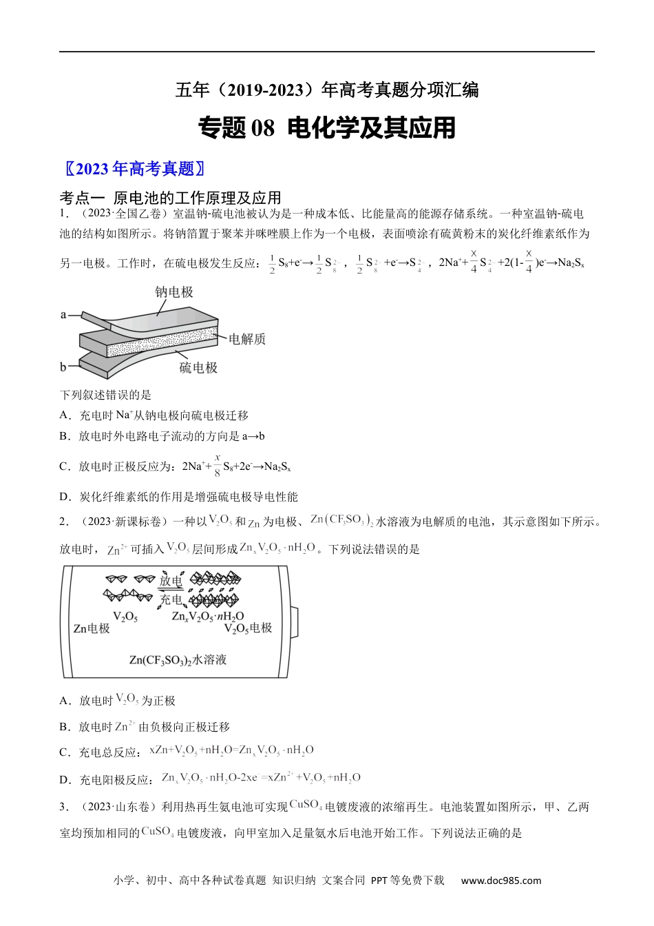 小学、初中、高中各种试卷真题知识归纳文案合同PPT等免费下载www.doc985.com五年(2019-2023)年高考真题分项汇编专题08电化学及其应用〖2023年高考真题〗考点一原电池的工作原理及应用1.(2023·全国乙卷)室温钠-硫电池被认为是一种成本低、比能量高的能源存储系统。一种室温钠-硫电池的结构如图所示。将钠箔置于聚苯并咪唑膜上作为一个电极,表面喷涂有硫黄粉末的炭化纤维素纸作为另一电极。工作时,在硫电极发生反应:S8+e-→S,S+e-→S,2Na++S+2(1-)e-→Na2Sx下列叙述错误的是A.充电时Na+从钠电极向硫电极迁移B.放电时外电路电子流动的方向是a→bC.放电时正极反应为:2Na++S8+2e-→Na2SxD.炭化纤维素纸的作用是增强硫电极导电性能2.(2023·新课标卷)一种以和为电极、水溶液为电解质的电池,其示意图如下所示。放电时,可插入层间形成。下列说法错误的是A.放电时为正极B.放电时由负极向正极迁移C.充电总反应:D.充电阳极反应:3.(2023·山东卷)利用热再生氨电池可实现电镀废液的浓缩再生。电池装置如图所示,甲、乙两室均预加相同的电镀废液,向甲室加入足量氨水后电池开始工作。下列说法正确的是小学、初中、高中各种试卷真题知识归纳文案合同PPT等免费下载www.doc985.comA.甲室电极为正极B.隔膜为阳离子膜C.电池总反应为:D.扩散到乙室将对电池电动势产生影响4.(2023·辽宁卷)某低成本储能电池原理如下图所示。下列说法正确的是A.放电时负极质量减小B.储能过程中电能转变为化学能C.放电时右侧通过质子交换膜移向左侧D.充电总反应:考点二电解池的工作原理及应用5.(2023·全国甲卷)用可再生能源电还原时,采用高浓度的抑制酸性电解液中的析氢反应来提高多碳产物(乙烯、乙醇等)的生成率,装置如下图所示。下列说法正确的是A.析氢反应发生在电极上B.从电极迁移到电极C.阴极发生的反应有:小学、初中、高中各种试卷真题知识归纳文案合同PPT等免费下载www.doc985.comD.每转移电子,阳极生成气体(标准状况)6.(2023·湖北卷)我国科学家设计如图所示的电解池,实现了海水直接制备氢气技术的绿色化。该装置工作时阳极无生成且KOH溶液的浓度不变,电解生成氢气的速率为。下列说法错误的是A.b电极反应式为B.离子交换膜为阴离子交换膜C.电解时海水中动能高的水分子可穿过PTFE膜D.海水为电解池补水的速率为7.(2023·浙江卷)氯碱工业能耗大,通过如图改进的设计可大幅度降低能耗,下列说法不正确的是A.电极A接电源正极,发生氧化反应B.电极B的电极反应式为:C.应选用阳离子交换膜,在右室获得浓度较高的溶液D.改进设计中通过提高电极B上反应物的氧化性来降低电解电压,减少能耗8.(2023·辽宁卷)某无隔膜流动海水电解法制的装置如下图所示,其中高选择性催化剂可抑制产生。下列说法正确的是小学、初中、高中各种试卷真题知识归纳文案合同PPT等免费下载www.doc985.comA.b端电势高于a端电势B.理论上转移生成C.电解后海水下降D.阳极发生:9.(2023·北京卷)回收利用工业废气中的和,实验原理示意图如下。下列说法不正确的是A.废气中排放到大气中会形成酸雨B.装置a中溶液显碱性的原因是的水解程度大于的电离程度C.装置a中溶液的作用是吸收废气中的和D.装置中的总反应为〖2022年高考真题〗考点一原电池的工作原理及应用10.(2022·湖南卷)海水电池在海洋能源领域备受关注,一种锂-海水电池构造示意图如下。下列说法错误的是A.海水起电解质溶液作用小学、初中、高中各种试卷真题知识归纳文案合同PPT等免费下载www.doc985.comB.N极仅发生的电极反应:C.玻璃陶瓷具有传导离子和防水的功能D.该锂-海水电池属于一次电池考点二电解池的工作原理及应用11.(2022·广东卷)以熔融盐为电解液,以含和等的铝合金废料为阳极进行电解,实现的再生。该过程中A.阴极发生的反应为B.阴极上被氧化C.在电解槽底部产生含的阳极泥D.阳极和阴极的质量变化相等12.(2022·天津卷)实验装置如图所示。接通电源后,用碳棒(、)作笔,在浸有饱和NaCl溶液和石蕊溶液的湿润试纸上同时写字,端的字迹呈白色。下列结论正确的是A.a为负极B.端的字迹...