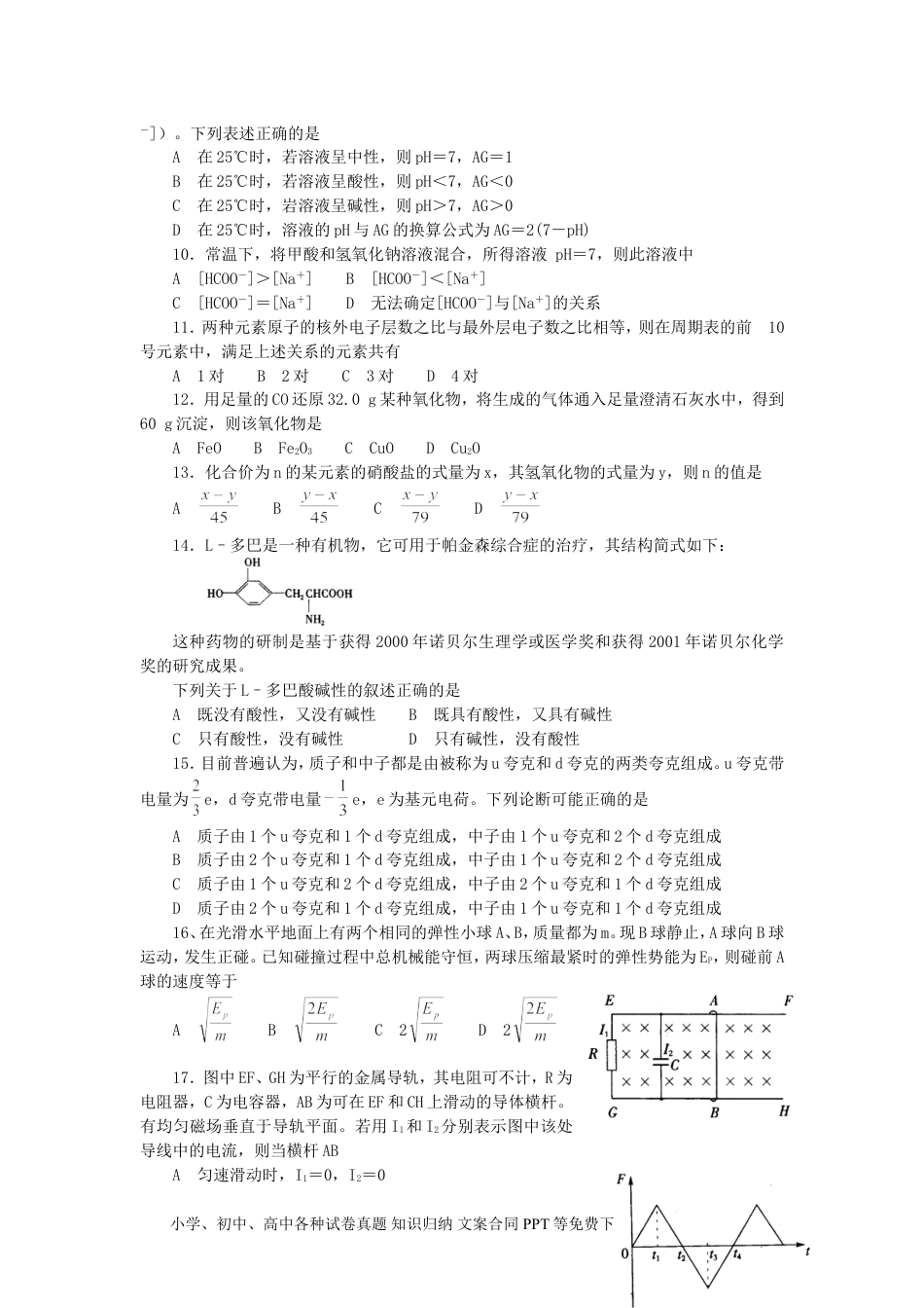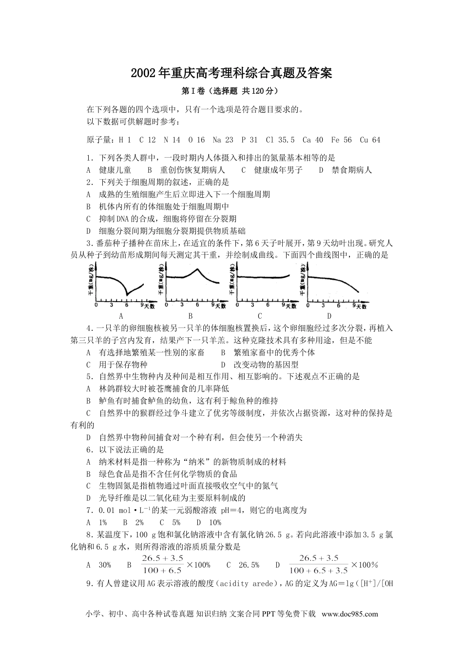 2002年重庆高考理科综合真题及答案第I卷(选择题共120分)在下列各题的四个选项中,只有一个选项是符合题目要求的。以下数据可供解题时参考:原子量:H1C12N14O16Na23P31Cl35.5Ca40Fe56Cu641.下列各类人群中,一段时期内人体摄入和排出的氮量基本相等的是A健康儿童B重创伤恢复期病人C健康成年男子D禁食期病人2.下列关于细胞周期的叙述,正确的是A成熟的生殖细胞产生后立即进入下一个细胞周期B机体内所有的体细胞处于细胞周期中C抑制DNA的合成,细胞将停留在分裂期D细胞分裂间期为细胞分裂期提供物质基础3.番茄种子播种在苗床上,在适宜的条件下,第6天子叶展开,第9天幼叶出现。研究人员从种子到幼苗形成期间每天测定其干重,并绘制成曲线。下面四个曲线图中,正确的是ABCD4.一只羊的卵细胞核被另一只羊的体细胞核置换后,这个卵细胞经过多次分裂,再植入第三只羊的子宫内发育,结果产下一只羊羔。这种克隆技术具有多种用途,但是不能A有选择地繁殖某一性别的家畜B繁殖家畜中的优秀个体C用于保存物种D改变动物的基因型5.自然界中生物种内及种间是相互作用、相互影响的。下述观点不正确的是A林鸽群较大时被苍鹰捕食的几率降低B鲈鱼有时捕食鲈鱼的幼鱼,这有利于鲸鱼种的维持C自然界中的猴群经过争斗建立了优劣等级制度,并依次占据资源,这对种的保持是有利的D自然界中物种间捕食对一个种有利,但会使另一个种消失6.以下说法正确的是A纳米材料是指一种称为“纳米”的新物质制成的材料B绿色食品是指不含任何化学物质的食品C生物固氮是指植物通过叶面直接吸收空气中的氮气D光导纤维是以二氧化硅为主要原料制成的7.0.01mol·L-1的某一元弱酸溶液pH=4,则它的电离度为A1%B2%C5%D10%8.某温度下,100g饱和氯化钠溶液中含有氯化钠26.5g。若向此溶液中添加3.5g氯化钠和6.5g水,则所得溶液的溶质质量分数是A30%B×100%C26.5%D×100%9.有人曾建议用AG表示溶液的酸度(acidityarede),AG的定义为AG=lg([H+]/[OH小学、初中、高中各种试卷真题知识归纳文案合同PPT等免费下载www.doc985.com-])。下列表述正确的是A在25℃时,若溶液呈中性,则pH=7,AG=1B在25℃时,若溶液呈酸性,则pH<7,AG<0C在25℃时,岩溶液呈碱性,则pH>7,AG>0D在25℃时,溶液的pH与AG的换算公式为AG=2(7-pH)10.常温下,将甲酸和氢氧化钠溶液混合,所得溶液pH=7,则此溶液中A[HCOO-]>[Na+]B[HCOO-]<[Na+]C[HCOO-]=[Na+]D无法确定[HCOO-]与[Na+]的关系11.两种元素原子的核外电子层数之比与最外层电子数之比相等,则在周期表的前10号元素中,满足上述关系的元素共有A1对B2对C3对D4对12.用足量的CO还原32.0g某种氧化物,将生成的气体通入足量澄清石灰水中,得到60g沉淀,则该氧化物是AFeOBFe2O3CCuODCu2O13.化合价为n的某元素的硝酸盐的式量为x,其氢氧化物的式量为y,则n的值是ABCD14.L–多巴是一种有机物,它可用于帕金森综合症的治疗,其结构简式如下:这种药物的研制是基于获得2000年诺贝尔生理学或医学奖和获得2001年诺贝尔化学奖的研究成果。下列关于L–多巴酸碱性的叙述正确的是A既没有酸性,又没有碱性B既具有酸性,又具有碱性C只有酸性,没有碱性D只有碱性,没有酸性15.目前普遍认为,质子和中子都是由被称为u夸克和d夸克的两类夸克组成。u夸克带电量为e,d夸克带电量e,e为基元电荷。下列论断可能正确的是A质子由1个u夸克和1个d夸克组成,中子由1个u夸克和2个d夸克组成B质子由2个u夸克和1个d夸克组成,中子由1个u夸克和2个d夸克组成C质子由1个u夸克和2个d夸克组成,中子由2个u夸克和1个d夸克组成D质子由2个u夸克和1个d夸克组成,中子由1个u夸克和1个d夸克组成16、在光滑水平地面上有两个相同的弹性小球A、B,质量都为m。现B球静止,A球向B球运动,发生正碰。已知碰撞过程中总机械能守恒,两球压缩最紧时的弹性势能为EP,则碰前A球的速度等于ABC2D217.图中EF、GH为平行的金属导轨,其电阻可不计,R为电阻器,C为电容器,AB为可在EF和CH上滑动的导体横杆。有均匀磁场垂直于导轨平面。若用I1和I2分别表示图中该处导线中的电流,则当横杆ABA匀速滑动时,I1=0,I2=0小学、...