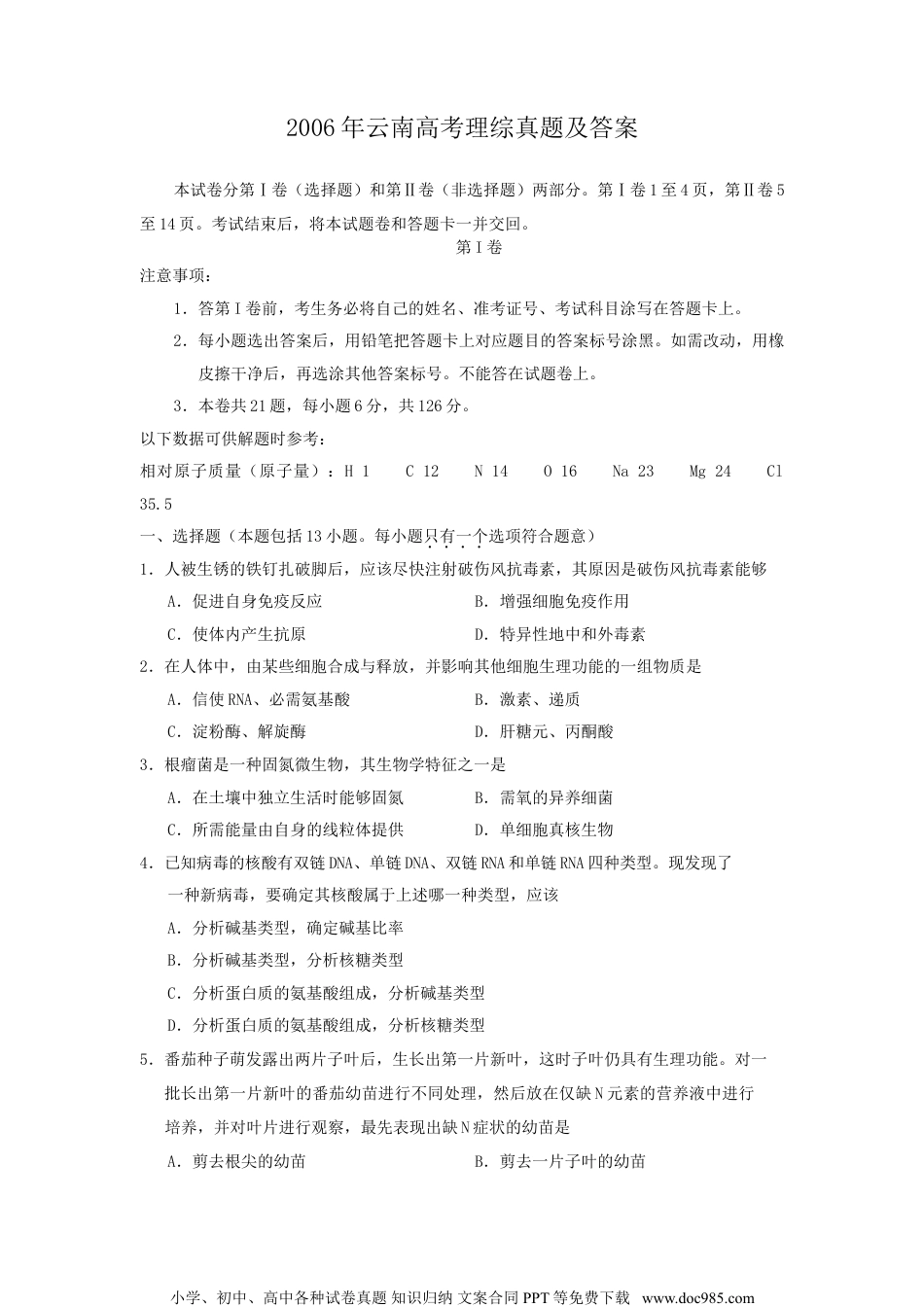 2006年云南高考理综真题及答案本试卷分第Ⅰ卷(选择题)和第Ⅱ卷(非选择题)两部分。第Ⅰ卷1至4页,第Ⅱ卷5至14页。考试结束后,将本试题卷和答题卡一并交回。第I卷注意事项:1.答第I卷前,考生务必将自己的姓名、准考证号、考试科目涂写在答题卡上。2.每小题选出答案后,用铅笔把答题卡上对应题目的答案标号涂黑。如需改动,用橡皮擦干净后,再选涂其他答案标号。不能答在试题卷上。3.本卷共21题,每小题6分,共126分。以下数据可供解题时参考:相对原子质量(原子量):H1C12N14O16Na23Mg24Cl35.5一、选择题(本题包括13小题。每小题只有一个选项符合题意)1.人被生锈的铁钉扎破脚后,应该尽快注射破伤风抗毒素,其原因是破伤风抗毒素能够A.促进自身免疫反应B.增强细胞免疫作用C.使体内产生抗原D.特异性地中和外毒素2.在人体中,由某些细胞合成与释放,并影响其他细胞生理功能的一组物质是A.信使RNA、必需氨基酸B.激素、递质C.淀粉酶、解旋酶D.肝糖元、丙酮酸3.根瘤菌是一种固氮微生物,其生物学特征之一是A.在土壤中独立生活时能够固氮B.需氧的异养细菌C.所需能量由自身的线粒体提供D.单细胞真核生物4.已知病毒的核酸有双链DNA、单链DNA、双链RNA和单链RNA四种类型。现发现了一种新病毒,要确定其核酸属于上述哪一种类型,应该A.分析碱基类型,确定碱基比率B.分析碱基类型,分析核糖类型C.分析蛋白质的氨基酸组成,分析碱基类型D.分析蛋白质的氨基酸组成,分析核糖类型5.番茄种子萌发露出两片子叶后,生长出第一片新叶,这时子叶仍具有生理功能。对一批长出第一片新叶的番茄幼苗进行不同处理,然后放在仅缺N元素的营养液中进行培养,并对叶片进行观察,最先表现出缺N症状的幼苗是A.剪去根尖的幼苗B.剪去一片子叶的幼苗小学、初中、高中各种试卷真题知识归纳文案合同PPT等免费下载www.doc985.comC.剪去两片子叶的幼苗D.完整幼苗6.反应2A(g)+B(g)2C(g);△H>0。下列反应条件有利于生成C的是A.低温、低压B.低温、高压C.高温、高压D.高温、低压7.将纯水加热至较高温度,下列叙述正确的是A.水的离子积变大、pH变小、呈酸性B.水的离了积不变、pH不变、呈中性C.水的离子积变小、pH变大、呈碱性D.水的离子积变大、pH变小、呈中性8.下列反应的离子方程式书写正确的是A.氯化铝溶液中加入过量氨水:Al3++4NH+H2OAlo2-+4NH4++2H2OB.澄清石灰水与少量苏打溶液混合:Ca2++OH-+HCO3-CaCO3↓+H2OC.碳酸钙溶于醋酸:CaCO3+2H+Ca2++CO2↑+H2OD.氯化亚铁溶液中通入氯气:2Fe2++Cl22Fe3++2Cl-9.某氯化镁溶液的密度为1.18g·cm-3,其中镁离子的质量分数为5.1%,300mL该溶液中Cl-离子的物质的量约等于A.0.37molB.0.63molC.0.74molD.1.5mol10.已知下列分子或离子在酸性条件下都能氧化KI,自身发生如下变化:H2O2→H2OIO3-→IMnO4-→Mn2+HNO2→NO如果分别用等物质的量的这些物质氧化足量的KI,得到I2最多的是A.H2O2B.IO3-C.MnO4-D.HNO211.下列叙述正确的是A.NH3是极性分子,分子中N原子是在3个H原子所组成的三角形的中心B.CCl4是非极性分子,分子中C原子处在4个Cl原子所组成的正方形的中心C.H2O是极性分子,分子中O原子不处在2个H原子所连成的直线的中央D.CO2是非极性分子,分子中C原子不处在2个O原子所连成的直线的中央12.下列叙述正确的是A.直径介于1nm~100nm之间的微粒称为胶体B.电泳现象可证明胶体属电解质溶液C.利用丁达尔效应可以区别溶液与胶体D.胶体粒子很小,可以透过半透膜13.主链含5个碳原子,有甲基、乙基2个支链的烷烃有A.2种B.3种C.4种D.5种二、选择题(本题包括8小题。每小题给出的四个选项中,有的只有一个选项正确,有的有多个选项正确,全部选对的得6分,选对但不全的得3分,有选错的得0分)14.现有三个核反应:小学、初中、高中各种试卷真题知识归纳文案合同PPT等免费下载www.doc985.com①2411Na→2412Mg+01c②23592U+10n→14156Ba+36Kr+310n③21H+31H→42He+10n下列说法正确的是A.①是裂变,②是β衰变,③是聚变B.①是聚变,②是裂变,③是β衰变C.①是β衰变,②是裂变,③是聚变D.①是β衰变,②是聚...
