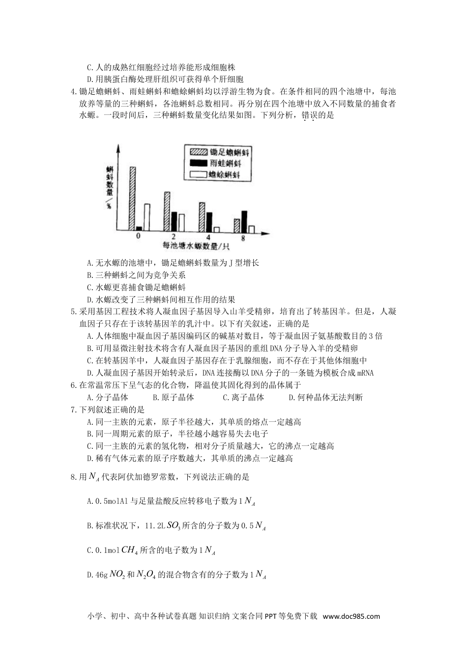 2006年江西高考理综真题及答案本试卷分第I卷(选择题)和第a卷(非选择题)两部分。第I卷1至4页,第Ⅱ卷5至8页。考试结束后,将本试题卷和答题卡一并交回。第I卷注愈事项:1.答题前,考生在答题卡上务必用黑色签字笔将自己的姓名、准考证号填写清楚,并贴好条形码.请认真核准条形码上的准考证号、姓名和科目。2.每小题选出答案后,用2B铅笔把答题卡上对应题目的答案标号涂黑,如需改动,用橡皮擦干净后,再选涂其他答案标号,在试题卷上作答无效.3本卷共21小题,每小题6分,共126分。以下数据可供解题时参考:相对原子质量(原子量):H1C12N14O16一、选择题(本题包括13小题。每小题只有一个选项符合题意)1.人的神经系统中,有些神经细胞既能传导兴奋,又能合成分泌激素。这些细胞位于A.大脑皮层B.垂体C.下丘脑D.脊髓2.一般情况下,用抗原免疫机体,血清中抗体浓度会发生相应变化。如果第二次免疫与第一次免疫所用的抗原相同且剂量相等,下列四图中能正确表示血清中抗体浓度变化的是3.下列关于动物细胞培养的叙述,正确的是A.培养中的人效应T细胞能产生单克隆抗体B.培养中的人B细胞能够无限地增殖小学、初中、高中各种试卷真题知识归纳文案合同PPT等免费下载www.doc985.comC.人的成熟红细胞经过培养能形成细胞株D.用胰蛋白酶处理肝组织可获得单个肝细胞4.锄足蟾蝌蚪、雨蛙蝌蚪和蟾蜍蝌蚪均以浮游生物为食。在条件相同的四个池塘中,每池放养等量的三种蝌蚪,各池蝌蚪总数相同。再分别在四个池塘中放入不同数量的捕食者水螈。一段时间后,三种蝌蚪数量变化结果如图。下列分析,错误的是A.无水螈的池塘中,锄足蟾蝌蚪数量为J型增长B.三种蝌蚪之间为竞争关系C.水螈更喜捕食锄足蟾蝌蚪D.水螈改变了三种蝌蚪间相互作用的结果5.采用基因工程技术将人凝血因子基因导入山羊受精卵,培育出了转基因羊。但是,人凝血因子只存在于该转基因羊的乳汁中。以下有关叙述,正确的是A.人体细胞中凝血因子基因编码区的碱基对数目,等于凝血因子氨基酸数目的3倍B.可用显微注射技术将含有人凝血因子基因的重组DNA分子导入羊的受精卵C.在转基因羊中,人凝血因子基因存在于乳腺细胞,而不存在于其他体细胞中D.人凝血因子基因开始转录后,DNA连接酶以DNA分子的一条链为模板合成mRNA6.在常温常压下呈气态的化合物,降温使其固化得到的晶体属于A.分子晶体B.原子晶体C.离子晶体D.何种晶体无法判断7.下列叙述正确的是A.同一主族的元素,原子半径越大,其单质的熔点一定越高B.同一周期元素的原子,半径越小越容易失去电子C.同一主族的元素的氢化物,相对分子质量越大,它的沸点一定越高D.稀有气体元素的原子序数越大,其单质的沸点一定越高8.用AN代表阿伏加德罗常数,下列说法正确的是A.0.5molAl与足量盐酸反应转移电子数为1ANB.标准状况下,11.2L3SO所含的分子数为0.5ANC.0.1mol4CH所含的电子数为1AND.46g2NO和24NO的混合物含有的分子数为1AN小学、初中、高中各种试卷真题知识归纳文案合同PPT等免费下载www.doc985.com9.把分别盛有熔融的氯化钾、氯化镁、氯化铝的三个电解槽串连,在一定条件下通电一段时间后,析出钾、镁、铝的物质的量之比为A.1:2:3B.3:2:1C.6:3:1D.6:3:210.浓度均为0.1mol·L-1的三种溶液等体积混和,充分反映后没有沉淀的一组溶液是A.BaCl2NaOHNaHCO3B.Na2CO3MgCl2H2SO4C.AlCl3NH3·H2ONaOHD.Ba(OH)2CaCl2Na2SO411.在0.1mol·L-1CH3COOH溶液中存在如下电离平衡:CH3COOHCH3COO-+H+对于该平衡,下列叙述正确的是A.加入水时,平衡向逆反应方向移动B.加入少量NaOH固体,平衡向正反应方向移动C.加入少量0.1mol·L-1HCl溶液,溶液中c(H+)减小D.加入少量CH3COONa固体,平衡向正反应方向移动12.茉莉醛具有浓郁的茉莉花香,其结构简式如下所示:关于茉莉醛的下列叙述错误的是A.在加热和催化剂作用下,能被氢气还原B.能被高锰酸钾酸性溶液氧化C.在一定条件下能与溴发生取代反应D.不能与氢溴酸发生加成反应13.由硫酸钾、硫酸铝和硫酸组成的混和溶液,其pH=1,c(Al3+)=0.4mol·L-1,c(SO42-)=0.8mol·L-1,则c(K+)为A.0.15mol·L-1B.0.2mol·L-1C.0.3mol·L-1D.0.4mol·L-1...