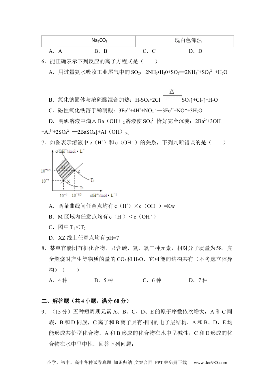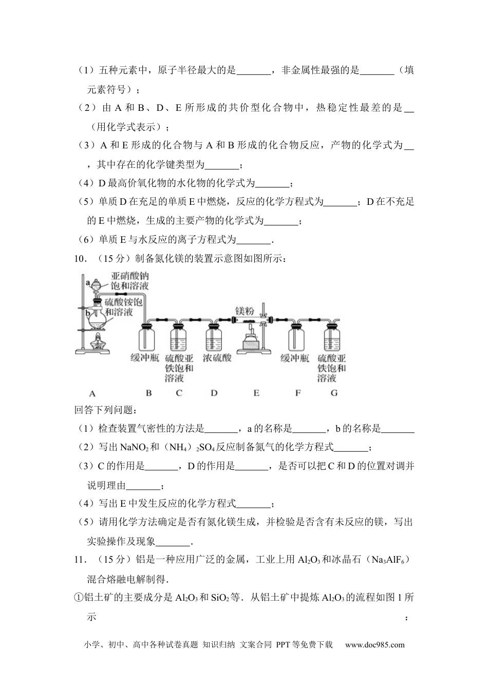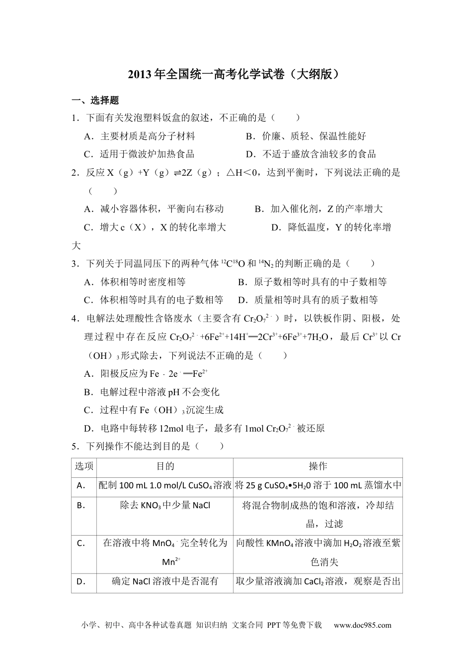 小学、初中、高中各种试卷真题知识归纳文案合同PPT等免费下载www.doc985.com2013年全国统一高考化学试卷(大纲版)一、选择题1.下面有关发泡塑料饭盒的叙述,不正确的是()A.主要材质是高分子材料B.价廉、质轻、保温性能好C.适用于微波炉加热食品D.不适于盛放含油较多的食品2.反应X(g)+Y(g)⇌2Z(g);△H<0,达到平衡时,下列说法正确的是()A.减小容器体积,平衡向右移动B.加入催化剂,Z的产率增大C.增大c(X),X的转化率增大D.降低温度,Y的转化率增大3.下列关于同温同压下的两种气体12C18O和14N2的判断正确的是()A.体积相等时密度相等B.原子数相等时具有的中子数相等C.体积相等时具有的电子数相等D.质量相等时具有的质子数相等4.电解法处理酸性含铬废水(主要含有Cr2O72﹣)时,以铁板作阴、阳极,处理过程中存在反应Cr2O72﹣+6Fe2++14H+═2Cr3++6Fe3++7H2O,最后Cr3+以Cr(OH)3形式除去,下列说法不正确的是()A.阳极反应为Fe2e﹣﹣═Fe2+B.电解过程中溶液pH不会变化C.过程中有Fe(OH)3沉淀生成D.电路中每转移12mol电子,最多有1molCr2O72﹣被还原5.下列操作不能达到目的是()选项目的操作A.配制100mL1.0mol/LCuSO4溶液将25gCuSO4•5H20溶于100mL蒸馏水中B.除去KNO3中少量NaCl将混合物制成热的饱和溶液,冷却结晶,过滤C.在溶液中将MnO4﹣完全转化为Mn2+向酸性KMnO4溶液中滴加H2O2溶液至紫色消失D.确定NaCl溶液中是否混有取少量溶液滴加CaCl2溶液,观察是否出小学、初中、高中各种试卷真题知识归纳文案合同PPT等免费下载www.doc985.comNa2CO3现白色浑浊A.AB.BC.CD.D6.能正确表示下列反应的离子方程式是()A.用过量氨水吸收工业尾气中的SO2:2NH3•H20+SO2═2NH4++SO32﹣+H2OB.氯化钠固体与浓硫酸混合加热:H2SO4+2Cl﹣SO2↑+Cl2↑+H2OC.磁性氧化铁溶于稀硝酸:3Fe2++4H++NO3﹣═3Fe3++NO↑+3H2OD.明矾溶液中滴入Ba(OH)2溶液使SO42﹣恰好完全沉淀:2Ba2++3OH﹣+Al3++2SO42﹣═2BaSO4↓+Al(OH)3↓7.如图表示溶液中c(H+)和c(OH﹣)的关系,下列判断错误的是()A.两条曲线间任意点均有c(H+)×c(OH﹣)=KwB.M区域内任意点均有c(H+)<c(OH﹣)C.图中T1<T2D.XZ线上任意点均有pH=78.某单官能团有机化合物,只含碳、氢、氧三种元素,相对分子质量为58,完全燃烧时产生等物质的量的CO2和H2O.它可能的结构共有(不考虑立体异构)()A.4种B.5种C.6种D.7种二、解答题(共4小题,满分60分)9.(15分)五种短周期元素A、B、C、D、E的原子序数依次增大,A和C同族,B和D同族,C离子和B离子具有相同的电子层结构.A和B、D、E均能形成共价型化合物.A和B形成的化合物在水中呈碱性,C和E形成的化合物在水中呈中性.回答下列问题:小学、初中、高中各种试卷真题知识归纳文案合同PPT等免费下载www.doc985.com(1)五种元素中,原子半径最大的是,非金属性最强的是(填元素符号);(2)由A和B、D、E所形成的共价型化合物中,热稳定性最差的是(用化学式表示);(3)A和E形成的化合物与A和B形成的化合物反应,产物的化学式为,其中存在的化学键类型为;(4)D最高价氧化物的水化物的化学式为;(5)单质D在充足的单质E中燃烧,反应的化学方程式为;D在不充足的E中燃烧,生成的主要产物的化学式为;(6)单质E与水反应的离子方程式为.10.(15分)制备氮化镁的装置示意图如图所示:回答下列问题:(1)检查装置气密性的方法是,a的名称是,b的名称是(2)写出NaNO2和(NH4)2SO4反应制备氮气的化学方程式;(3)C的作用是,D的作用是,是否可以把C和D的位置对调并说明理由;(4)写出E中发生反应的化学方程式;(5)请用化学方法确定是否有氮化镁生成,并检验是否含有未反应的镁,写出实验操作及现象.11.(15分)铝是一种应用广泛的金属,工业上用Al2O3和冰晶石(Na3AlF6)混合熔融电解制得.①铝土矿的主要成分是Al2O3和SiO2等.从铝土矿中提炼Al2O3的流程如图1所示:小学、初中、高中各种试卷真题知识归纳文案合同PPT等免费下载www.doc985.com图1图2②以萤石(CaF2)和纯碱为原料制备冰晶石的流程如图2所示:回答...