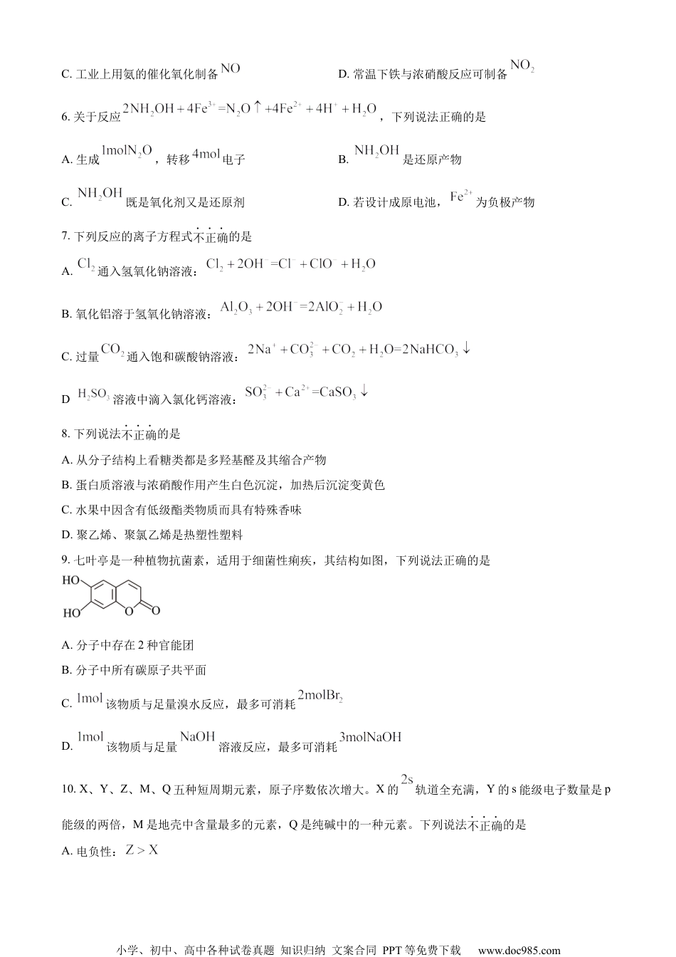 小学、初中、高中各种试卷真题知识归纳文案合同PPT等免费下载www.doc985.com2023年1月浙江省普通高校招生选考化学试题化学试题可能用到的相对原子质量:H1Li7C12N14O16Na23Mg24Al27Si28S32C135.5K39Ca40Fe56Cu64Br80Ag108I127Ba137一、选择题(本大题共16小题,每小题3分,共48分。每小题列出的四个备选项中只有一个是符合题目要求的,不选、多选、错选均不得分)1.下列物质中属于耐高温酸性氧化物的是A.B.C.D.2.硫酸铜应用广泛,下列说法不正确的是A.元素位于周期表p区B.硫酸铜属于强电解质C.硫酸铜溶液呈酸性D.硫酸铜能使蛋白质变性3.下列化学用语表示正确的是A.中子数为18的氯原子:B.碳的基态原子轨道表示式:C.的空间结构:(平面三角形)D.的形成过程:4.物质的性质决定用途,下列两者对应关系不正确的是A.能使某些色素褪色,可用作漂白剂B.金属钠导热性好,可用作传热介质C.溶液呈碱性,可用作消毒剂D.呈红色,可用作颜料5.下列关于元素及其化合物的性质说法不正确的是A.和乙醇反应可生成B.工业上煅烧黄铁矿生产小学、初中、高中各种试卷真题知识归纳文案合同PPT等免费下载www.doc985.comC.工业上用氨的催化氧化制备D.常温下铁与浓硝酸反应可制备6.关于反应,下列说法正确的是A.生成,转移电子B.是还原产物C.既是氧化剂又是还原剂D.若设计成原电池,为负极产物7.下列反应的离子方程式不正确的是A.通入氢氧化钠溶液:B.氧化铝溶于氢氧化钠溶液:C.过量通入饱和碳酸钠溶液:D.溶液中滴入氯化钙溶液:8.下列说法不正确的是A.从分子结构上看糖类都是多羟基醛及其缩合产物B.蛋白质溶液与浓硝酸作用产生白色沉淀,加热后沉淀变黄色C.水果中因含有低级酯类物质而具有特殊香味D.聚乙烯、聚氯乙烯是热塑性塑料9.七叶亭是一种植物抗菌素,适用于细菌性痢疾,其结构如图,下列说法正确的是A.分子中存在2种官能团B.分子中所有碳原子共平面C.该物质与足量溴水反应,最多可消耗D.该物质与足量溶液反应,最多可消耗10.X、Y、Z、M、Q五种短周期元素,原子序数依次增大。X的轨道全充满,Y的s能级电子数量是p能级的两倍,M是地壳中含量最多的元素,Q是纯碱中的一种元素。下列说法不正确的是A.电负性:小学、初中、高中各种试卷真题知识归纳文案合同PPT等免费下载www.doc985.comB.最高正价:C.Q与M的化合物中可能含有非极性共价键D.最高价氧化物对应水化物的酸性:11.在熔融盐体系中,通过电解和获得电池材料,电解装置如图,下列说法正确的是A.石墨电极为阴极,发生氧化反应B.电极A的电极反应:C.该体系中,石墨优先于参与反应D.电解时,阳离子向石墨电极移动12.共价化合物中所有原子均满足8电子稳定结构,一定条件下可发生反应:,下列说法不正确的是A.的结构式为B.为非极性分子C.该反应中的配位能力大于氯D.比更难与发生反应13.甲酸是重要的化工原料。工业废水中的甲酸及其盐,通过离子交换树脂(含固体活性成分,R为烷基)因静电作用被吸附回收,其回收率(被吸附在树脂上甲酸根的物质的量分数)与废水初始关系如图(已知甲酸),下列说法不正确的是小学、初中、高中各种试卷真题知识归纳文案合同PPT等免费下载www.doc985.comA.活性成分在水中存在平衡:B.的废水中C.废水初始,随下降,甲酸的电离被抑制,与作用的数目减少D.废水初始,离子交换树脂活性成分主要以形态存在14.标准状态下,气态反应物和生成物的相对能量与反应历程示意图如下[已知和的相对能量为0],下列说法不正确的是A.小学、初中、高中各种试卷真题知识归纳文案合同PPT等免费下载www.doc985.comB.可计算键能为C.相同条件下,的平衡转化率:历程Ⅱ>历程ⅠD.历程Ⅰ、历程Ⅱ中速率最快的一步反应的热化学方程式为:15.碳酸钙是常见难溶物,将过量碳酸钙粉末置于水中达到溶解平衡:[已知,,的电离常数],下列有关说法正确的是A.上层清液中存在B.上层清液中含碳微粒最主要以形式存在C.向体系中通入气体,溶液中保持不变D.通过加溶液可实现向的有效转化16.探究铁及其化合物的性质,下列方案设计、现象和结论都正确的是实验方案现象结论A往溶液中加入片短时间内无明显现象的氧化能力比弱B往溶液中滴加溶液,再加入少量固体溶液先变成血红色...