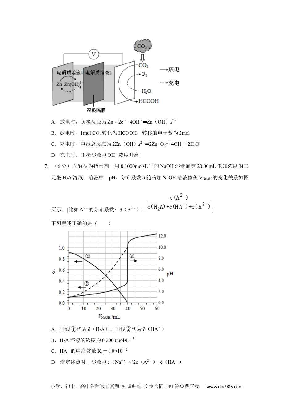 小学、初中、高中各种试卷真题知识归纳文案合同PPT等免费下载www.doc985.com2020年全国统一高考化学试卷(新课标Ⅰ)一、选择题:本题共7小题,每小题6分,共42分。在每小题给出的四个选项中,只有一项是符合题目要求的。1.(6分)国家卫健委公布的新型冠状病毒肺炎诊疗方案指出,乙醚、75%乙醇、含氯消毒剂、过氧乙酸(CH3COOOH)、氯仿等均可有效灭活病毒。对于上述化学药品,下列说法错误的是()A.CH3CH2OH能与水互溶B.NaClO通过氧化灭活病毒C.过氧乙酸相对分子质量为76D.氯仿的化学名称是四氯化碳2.(6分)紫花前胡醇()可从中药材当归和白芷中提取得到,能提高人体免疫力。有关该化合物,下列叙述错误的是()A.分子式为C14H14O4B.不能使酸性重铬酸钾溶液变色C.能够发生水解反应D.能够发生消去反应生成双键3.(6分)下列气体去除杂质的方法中,不能实现目的的是()气体(杂质)方法A.SO2(H2S)通过酸性高锰酸钾溶液B.Cl2(HCl)通过饱和的食盐水C.N2(O2)通过灼热的铜丝网D.NO(NO2)通过氢氧化钠溶液A.AB.BC.CD.D4.(6分)铑的配合物离子(Rh(CO)2I2]﹣可催化甲醇羰基化,反应过程如图所示。下列叙述错误的是()小学、初中、高中各种试卷真题知识归纳文案合同PPT等免费下载www.doc985.comA.CH3COI是反应中间体B.甲醇羰基化反应为CH3OH+CO═CH3CO2HC.反应过程中Rh的成键数目保持不变D.存在反应CH3OH+HI═CH3I+H2O5.(6分)1934年约里奥﹣居里夫妇在核反应中用α粒子(即氦核He)轰击金属原子X,得到核素Y,开创了人造放射性核素的先河:X+He→Y+n其中元素X、Y的最外层电子数之和为8.下列叙述正确的是()A.X的相对原子质量为26B.X、Y均可形成三氯化物C.X的原子半径小于Y的D.Y仅有一种含氧酸6.(6分)科学家近年发明了一种新型ZnCO﹣2水介质电池。电池示意图如图,电极为金属锌和选择性催化材料。放电时,温室气体CO2被转化为储氢物质甲酸等,为解决环境和能源问题提供了一种新途径。下列说法错误的是()小学、初中、高中各种试卷真题知识归纳文案合同PPT等免费下载www.doc985.comA.放电时,负极反应为Zn2e﹣﹣+4OH﹣═Zn(OH)42﹣B.放电时,1molCO2转化为HCOOH,转移的电子数为2molC.充电时,电池总反应为2Zn(OH)42﹣═2Zn+O2↑+4OH﹣+2H2OD.充电时,正极溶液中OH﹣浓度升高7.(6分)以酚酞为指示剂,用0.1000mol•L1﹣的NaOH溶液滴定20.00mL未知浓度的二元酸H2A溶液。溶液中,pH、分布系数δ随滴加NaOH溶液体积VNaOH的变化关系如图所示。[比如A2﹣的分布系数:δ(A2﹣)=]下列叙述正确的是()A.曲线①代表δ(H2A),曲线②代表δ(HA﹣)B.H2A溶液的浓度为0.2000mol•L1﹣C.HA﹣的电离常数Ka=1.0×102﹣D.滴定终点时,溶液中c(Na+)<2c(A2﹣)+c(HA﹣)小学、初中、高中各种试卷真题知识归纳文案合同PPT等免费下载www.doc985.com二、非选择题:共58分。第8~10题为必考题,每个试题考生都必须作答。第11~12题为选考题,考生根据要求作答。(一)必考题:共43分。8.(14分)钒具有广泛用途。黏土钒矿中,钒以+3、+4、+5价的化合物存在,还包括钾、镁的铝硅酸盐,以及SiO2、Fe3O4.采用以下工艺流程可由黏土钒矿制备NH4VO3。该工艺条件下,溶液中金属离子开始沉淀和完全沉淀的pH如下表所示:金属离子Fe3+Fe2+Al3+Mn2+开始沉淀pH1.97.03.08.1完全沉淀pH3.29.04.710.1回答下列问题:(1)“酸浸氧化”需要加热,其原因是。(2)“酸浸氧化”中,VO+和VO2+被氧化成VO2+,同时还有离子被氧化。写出VO+转化为VO2+反应的离子方程式。(3)“中和沉淀”中,钒水解并沉淀为V2O5•xH2O,随滤液②可除去金属离子K+、Mg2+、Na+、,以及部分的。(4)“沉淀转溶”中,V2O5•xH2O转化为钒酸盐溶解。滤渣③的主要成分是。(5)“调pH”中有沉淀生成,生成沉淀反应的化学方程式是。(6)“沉钒”中析出NH4VO3晶体时,需要加入过量NH4Cl,其原因是。9.(15分)为验证不同化合价铁的氧化还原能力,利用下列电池装置进行实验。回答下列问题:(1)由FeSO4•7H2O固体配制0.10mol•L1﹣FeSO4溶液,需要的仪器有药匙、玻璃棒、小学...