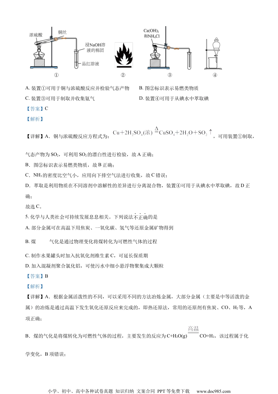小学、初中、高中各种试卷真题知识归纳文案合同PPT等免费下载www.doc985.com绝密★启用前2024年6月浙江省普通高校招生选考科目考试化学本试题卷分选择题和非选择题两部分,共8页,满分100分,考试时间90分钟。考生注意:1.答题前,请务必将自己的姓名、准考证号用黑色字迹的签字笔或钢笔分别填写在试题卷和答题纸规定的位置上。2.答题时,请按照答题纸上“注意事项”的要求,在答题纸相应的位置上规范作答,在本试题卷上的作答一律无效。3.非选择题的答案必须使用黑色字迹的签字笔或钢笔写在答题纸上相应区域内,作图时可先使用2B铅笔,确定后必须使用黑色字迹的签字笔或钢笔描黑。4.可能用到的相对原子质量:选择题部分一、选择题(本大题共16小题,每小题3分,共48分。每小题列出的四个备选项中只有一个是符合题目要求的,不选、多选、错选均不得分)1.按物质组成分类,属于A.酸B.碱C.盐D.混合物【答案】C【解析】【详解】KAl(SO4)2∙12H2O是结晶水合物,属于纯净物;是由金属阳离子K+、Al3+和酸根阴离子组成的复盐;答案选C。2.下列说法不正确的是A.呈两性,不能用于治疗胃酸过多B.能与反应产生,可作供氧剂小学、初中、高中各种试卷真题知识归纳文案合同PPT等免费下载www.doc985.comC.有还原性,能被氧化成D.见光易分解,应保存在棕色试剂瓶中【答案】A【解析】【详解】A.呈两性,不溶于水,但可以与胃酸反应生成无毒物质,因此其能用于治疗胃酸过多,A不正确;B.能与反应产生,该反应能安全发生且不生成有毒气体,故可作供氧剂,B正确;C.有还原性,其中Fe元素的化合价为+2,用适当的氧化剂可以将其氧化成更高价态的,C正确;D.见光易分解的物质应保存在棕色试剂瓶中;见光易分解,故其应保存在棕色试剂瓶中,D正确;综上所述,本题选A。3.下列表示不正确的是A.的电子式:B.中共价键的电子云图:C.的空间填充模型:D.3,3-二甲基戊烷的键线式:【答案】A【解析】【详解】A.的电子式:,故A错误;B.Cl2中的共价键是由2个氯原子各提供1个未成对电子的3p原子轨道重叠形成的,共价键电子云图为:,故B正确;C.的中心原子N形成3个σ键和1个孤电子对,为sp3杂化,为三角锥形,空间填充模型:,故C正确;D.3,3-二甲基戊烷的主链上有5个C,3号碳上连接有2个甲基,键线式为:,故D正确;故选A。4.下列说法不正确的是小学、初中、高中各种试卷真题知识归纳文案合同PPT等免费下载www.doc985.comA.装置①可用于铜与浓硫酸反应并检验气态产物B.图②标识表示易燃类物质C.装置③可用于制取并收集氨气D.装置④可用于从碘水中萃取碘【答案】C【解析】【详解】A.铜与浓硫酸反应方程式为:,可用装置①制取,气态产物为SO2,可利用SO2的漂白性进行检验,故A正确;B.图②标识表示易燃类物质,故B正确;C.NH3的密度比空气小,应用向下排空气法进行收集,故C错误;D.萃取是利用物质在不同溶剂中溶解性的差异进行分离混合物,装置④可用于从碘水中萃取碘,故D正确;故选C。5.化学与人类社会可持续发展息息相关。下列说法不正确的是A.部分金属可在高温下用焦炭、一氧化碳、氢气等还原金属矿物得到B.煤的气化是通过物理变化将煤转化为可燃性气体的过程C.制作水果罐头时加入抗氧化剂维生素C,可延长保质期D.加入混凝剂聚合氯化铝,可使污水中细小悬浮物聚集成大颗粒【答案】B【解析】【详解】A.根据金属活泼性的不同,可以采用不同的方法冶炼金属,大部分金属(主要是中等活泼的金属)的冶炼是通过高温下发生氧化还原反应来完成的,即热还原法,常用的还原剂有焦炭、CO、H2等,A项正确;B.煤的气化是将煤转化为可燃性气体的过程,主要发生的反应为C+H2O(g)CO+H2,该过程属于化学变化,B项错误;小学、初中、高中各种试卷真题知识归纳文案合同PPT等免费下载www.doc985.comC.维生素C(即抗坏血酸)具有还原性,能被氧化成脱氢抗坏血酸,故制作水果罐头时加入维生素C作抗氧化剂,可延长保质期,C项正确;D.混凝剂聚合氯化铝在污水中能水解成Al(OH)3胶体,Al(OH)3胶体能吸附污水中细小悬浮物,使其聚集成较大颗粒而沉降下来,D项正确;答案选B。6.利用可将废水中的转化为对环境无害的物质...