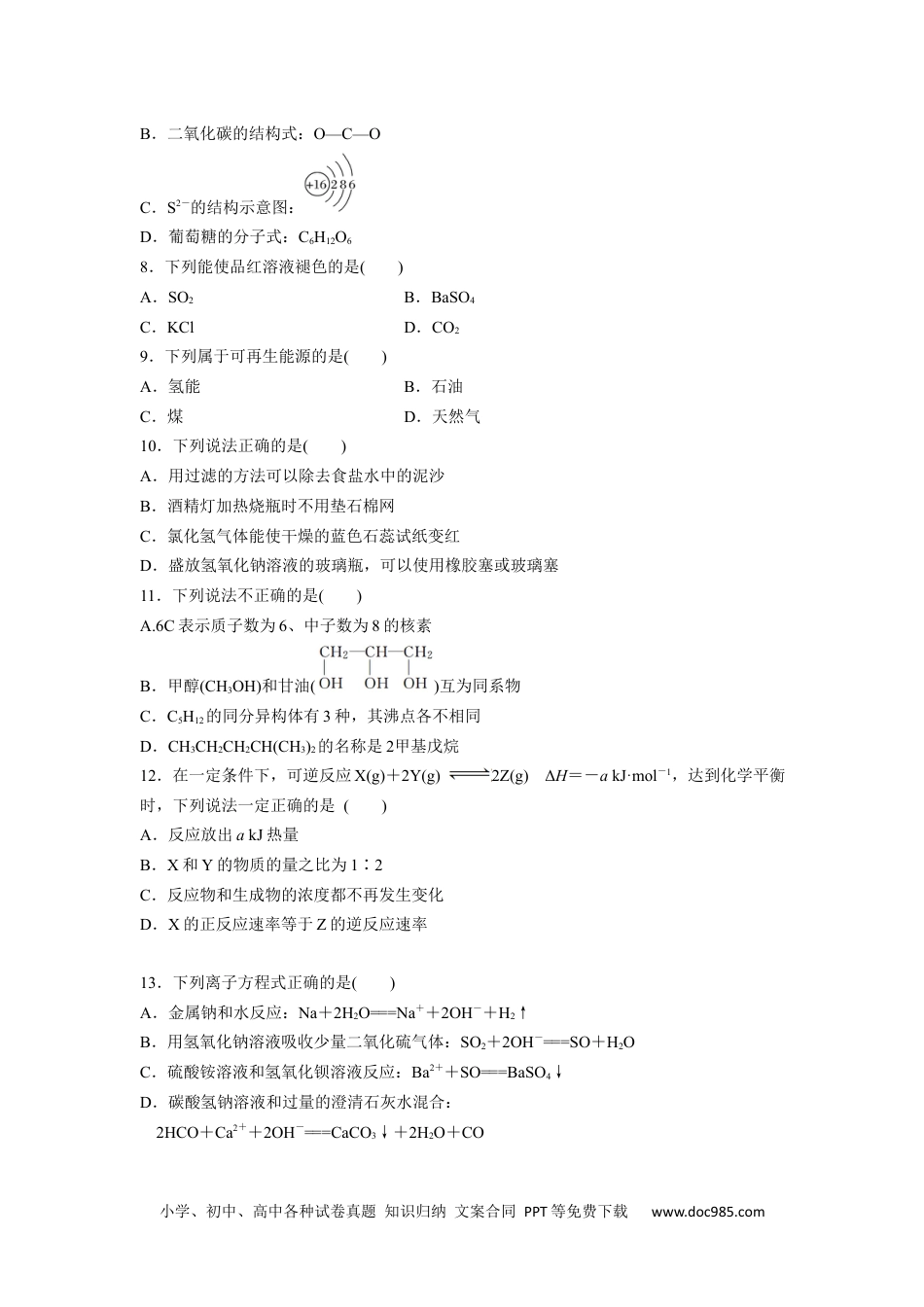 小学、初中、高中各种试卷真题知识归纳文案合同PPT等免费下载www.doc985.com2016年10月浙江省普通高校招生选考考试化学试题一、选择题(本大题共25小题,每小题2分,共50分。每小题列出的四个备选项中只有一个是符合题目要求的,不选、多选、错选均不得分)1.下列属于酸的是()A.H2SO4B.CO2C.NaClD.NaOH2.下列仪器名称为“分液漏斗”的是()3.下列属于电解质的是()A.酒精B.蔗糖C.硝酸钾D.铜丝4.下列反应中,水作氧化剂的是()A.C+H2O=====CO+H2B.H2+CuO=====Cu+H2OC.Cl2+H2OHCl+HClOD.SO3+H2O===H2SO45.下列物质的水溶液因水解而呈酸性的是()A.NaOHB.(NH4)2SO4C.Na2CO3D.NaCl6.下列说法不正确的是()A.氯化钠可用于配制生理盐水B.二氧化硅可用于制造玻璃C.海水中的钠元素以单质存在D.氧化镁(熔点2800℃)是优良的耐高温材料7.下列表示正确的是()A.氯化钠的电子式:小学、初中、高中各种试卷真题知识归纳文案合同PPT等免费下载www.doc985.comB.二氧化碳的结构式:O—C—OC.S2-的结构示意图:D.葡萄糖的分子式:C6H12O68.下列能使品红溶液褪色的是()A.SO2B.BaSO4C.KClD.CO29.下列属于可再生能源的是()A.氢能B.石油C.煤D.天然气10.下列说法正确的是()A.用过滤的方法可以除去食盐水中的泥沙B.酒精灯加热烧瓶时不用垫石棉网C.氯化氢气体能使干燥的蓝色石蕊试纸变红D.盛放氢氧化钠溶液的玻璃瓶,可以使用橡胶塞或玻璃塞11.下列说法不正确的是()A.6C表示质子数为6、中子数为8的核素B.甲醇(CH3OH)和甘油()互为同系物C.C5H12的同分异构体有3种,其沸点各不相同D.CH3CH2CH2CH(CH3)2的名称是2甲基戊烷12.在一定条件下,可逆反应X(g)+2Y(g)2Z(g)ΔH=-akJ·mol-1,达到化学平衡时,下列说法一定正确的是()A.反应放出akJ热量B.X和Y的物质的量之比为1∶2C.反应物和生成物的浓度都不再发生变化D.X的正反应速率等于Z的逆反应速率13.下列离子方程式正确的是()A.金属钠和水反应:Na+2H2O===Na++2OH-+H2↑B.用氢氧化钠溶液吸收少量二氧化硫气体:SO2+2OH-===SO+H2OC.硫酸铵溶液和氢氧化钡溶液反应:Ba2++SO===BaSO4↓D.碳酸氢钠溶液和过量的澄清石灰水混合:2HCO+Ca2++2OH-===CaCO3↓+2H2O+CO小学、初中、高中各种试卷真题知识归纳文案合同PPT等免费下载www.doc985.com14.W、X、Y、Z四种短周期元素,它们在周期表中位置如图所示,下列说法不正确的是()A.W、Y、X三种元素的原子半径依次减小B.Z元素的气态氢化物的热稳定性比Y的高C.W元素与氢元素可能会形成W2H6D.Y元素的单质能从NaZ溶液中置换出Z元素的单质15.下列说法正确的是()A.甲烷分子的比例模型为,其二氯取代物有2种结构B.苯和乙烯都能使溴水褪色,其褪色原理相同C.相同质量的乙炔与苯分别在足量的氧气中完全燃烧,消耗氧气的物质的量相同D.在一定条件下,苯与氯气生成氯苯的反应类型是加成反应16.下列说法正确的是()A.油脂、糖类和蛋白质均为高分子化合物B.植物秸秆的主要成分是纤维素,纤维素在催化剂作用下经水解可得葡萄糖,葡萄糖在酒化酶的作用下能转化为酒精C.往含硫酸的淀粉水解液中加入银氨溶液,水浴加热后无银镜产生,说明淀粉未水解D.向鸡蛋清的溶液中加入甲醛溶液,可观察到蛋白质发生凝聚,再加入蒸馏水,振荡后蛋白质又发生溶解17.在一块表面无锈的铁片上滴食盐水,放置一段时间后看到铁片上有铁锈出现。铁片腐蚀过程中发生的总化学方程式:2Fe+2H2O+O2===2Fe(OH)2,Fe(OH)2进一步被氧气氧化为Fe(OH)3,再在一定条件下脱水生成铁锈,其原理如图。下列说法正确的是()A.铁片发生还原反应而被腐蚀B.铁片腐蚀最严重区域应该是生锈最多的区域C.铁片腐蚀中负极发生的电极反应:2H2O+O2+4e-===4OH-D.铁片里的铁和碳与食盐水形成无数微小原电池,发生了电化学腐蚀18.为证明醋酸是弱电解质,下列方法不正确的是()小学、初中、高中各种试卷真题知识归纳文案合同PPT等免费下载www.doc985.comA.测定0.1mol·L-1醋酸溶液的pHB.测定0.1mol·L-1CH3COONa溶液的酸碱性C.比较浓度均为0.1mol·L-1盐酸和醋酸溶液的导电能力D.比...