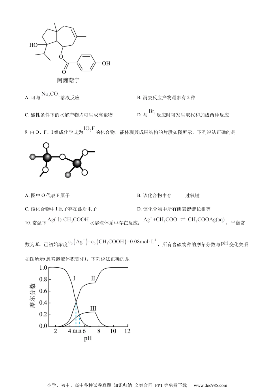小学、初中、高中各种试卷真题知识归纳文案合同PPT等免费下载www.doc985.com2024年全省普通高中学业水平等级考试化学注意事项:1.答卷前,考生务必将自己的姓名、考生号等填写在答题卡和试卷指定位置。2.回答选择题时,选出每小题答案后,用铅笔把答题卡上对应题目的答案标号涂黑。如需改动,用橡皮擦干净后,再选涂其他答案标号。回答非选择题时,将答案写在答题卡上。写在本试卷上无效。3.考试结束后,将本试卷和答题卡并交回。可能用到的相对原子质量:一、选择题:本题共10小题,每小题2分,共20分。每小题只有一个选项符合题目要求。1.中国书画是世界艺术瑰宝,古人所用文房四宝制作过程中发生氧化还原反应的是A.竹管、动物尾毫→湖笔B.松木→油烟→徽墨C.楮树皮→纸浆纤维→宣纸D.端石→端砚2.化学品在食品工业中也有重要应用,下列说法错误的是A.活性炭可用作食品脱色剂B.铁粉可用作食品脱氧剂C.谷氨酸钠可用作食品增味剂D.五氧化二磷可用作食品干燥剂3.下列化学用语或图示正确的是A.的系统命名:2-甲基苯酚B.分子的球棍模型:C.激发态H原子的轨道表示式:D.键形成的轨道重叠示意图:4.下列物质均为共价晶体且成键结构相似,其中熔点最低的是小学、初中、高中各种试卷真题知识归纳文案合同PPT等免费下载www.doc985.comA.金刚石(C)B.单晶硅()C.金刚砂()D.氮化硼(,立方相)5.物质性质决定用途,下列两者对应关系错误的是A.石灰乳除去废气中二氧化硫,体现了的碱性B.氯化铁溶液腐蚀铜电路板,体现了的氧化性C.制作豆腐时添加石膏,体现了的难溶性D.用氨水配制银氨溶液,体现了的配位性6.下列图示实验中,操作规范的是A.调控滴定速度B.用试纸测定溶液C.加热试管中的液体D.向试管中滴加溶液A.AB.BC.CD.D7.我国科学家在青蒿素研究方面为人类健康作出了巨大贡献。在青蒿素研究实验中,下列叙述错误的是A.通过萃取法可获得含青蒿素的提取液B.通过X射线衍射可测定青蒿素晶体结构C.通过核磁共振谱可推测青蒿素相对分子质量D.通过红外光谱可推测青蒿素分子中的官能团8.植物提取物阿魏萜宁具有抗菌活性,其结构简式如图所示。下列关于阿魏萜宁的说法错误的是小学、初中、高中各种试卷真题知识归纳文案合同PPT等免费下载www.doc985.comA.可与溶液反应B.消去反应产物最多有2种C.酸性条件下的水解产物均可生成高聚物D.与反应时可发生取代和加成两种反应9.由O、F、I组成化学式为的化合物,能体现其成键结构的片段如图所示。下列说法正确的是A.图中O代表F原子B.该化合物中存在过氧键C.该化合物中I原子存在孤对电子D.该化合物中所有碘氧键键长相等10.常温下水溶液体系中存在反应:,平衡常数为K。已初始浓度,所有含碳物种的摩尔分数与变化关系如图所示(忽略溶液体积变化)。下列说法正确的是小学、初中、高中各种试卷真题知识归纳文案合同PPT等免费下载www.doc985.comA.线Ⅱ表示的变化情况B.的电离平衡常数C.时,D.时,二、选择题:本题共5小题,每小题4分,共20分。每小题有个或两个选项符合题目要求,全部选对得4分,选对但不全的得2分,有选错的得0分。11.中国美食享誉世界,东坡诗句“芽姜紫醋炙银鱼”描述了古人烹饪时对食醋的妙用。食醋风味形成的关键是发酵,包括淀粉水解、发酵制醇和发酵制酸等三个阶段。下列说法错误的是A.淀粉水解阶段有葡萄糖产生B.发酵制醇阶段有产生C.发酵制酸阶段有酯类物质产生D.上述三个阶段均应在无氧条件下进行12.由下列事实或现象能得出相应结论的是事实或现象结论A向酸性溶液中加入草酸,紫色褪去草酸具有还原性B铅蓄电池使用过程中两电极的质量均增加电池发生了放电反应C向等物质的量浓度的,混合溶液中滴加溶液,先生成白色沉淀D为基元反应,将盛有的密闭烧瓶浸入冷水,红棕色变浅正反应活化能大于逆反应活化能A.AB.BC.CD.D13.以不同材料修饰的为电极,一定浓度的溶液为电解液,采用电解和催化相结合的循环方式,小学、初中、高中各种试卷真题知识归纳文案合同PPT等免费下载www.doc985.com可实现高效制和,装置如图所示。下列说法错误的是A.电极a连接电源负极B.加入Y的目的是补充C.电解总反应式为D.催化阶段反应产物物质的量之比14.钧瓷是宋代五大...