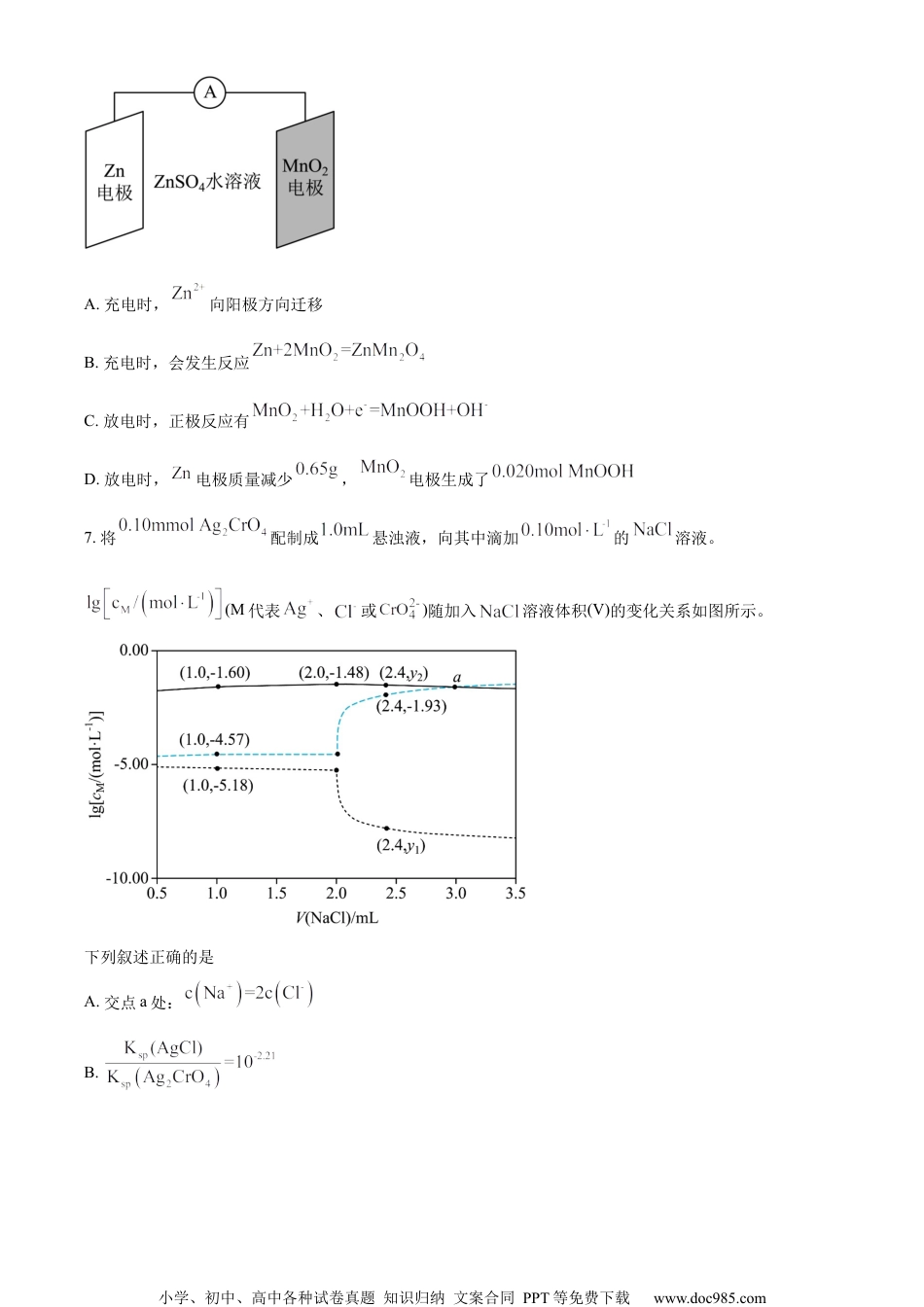 小学、初中、高中各种试卷真题知识归纳文案合同PPT等免费下载www.doc985.com2024年普通高等学校招生全国统一考试(甲卷)理科综合能力测试注意事项:1.答卷前,考生务必将自己的姓名、准考证号填写在答题卡上,并将自己的姓名、准考证号、座位号填写在本试卷上。2.回答选择题时,选出每小题答案后,用2B铅笔把答题卡上对应题目的答案标号涂黑;如需改动,用橡皮擦干净后,再选涂其他答案标号。涂写在本试卷上无效。3.作答非选择题时,将答案书写在答题卡上,书写在本试卷上无效。4.考试结束后,将本试卷和答题卡一并交回。可能用到的相对原子质量:一、选择题:本题共13小题,每小题6分,共78分。在每小题给出的四个选项中,只有一项是符合题目要求的。1.人类对能源的利用经历了柴薪、煤炭和石油时期,现正向新能源方向高质量发展。下列有关能源的叙述错误的是A.木材与煤均含有碳元素B.石油裂化可生产汽油C.燃料电池将热能转化为电能D.太阳能光解水可制氢2.下列过程对应的离子方程式正确的是A.用氢氟酸刻蚀玻璃:B.用三氯化铁溶液刻制覆铜电路板:C.用硫代硫酸钠溶液脱氯:D.用碳酸钠溶液浸泡锅炉水垢中的硫酸钙:3.我国化学工作者开发了一种回收利用聚乳酸(PLA)高分子材料的方法,其转化路线如下所示。下列叙述错误的是A.PLA在碱性条件下可发生降解反应小学、初中、高中各种试卷真题知识归纳文案合同PPT等免费下载www.doc985.comB.MP的化学名称是丙酸甲酯C.MP的同分异构体中含羧基的有3种D.MMA可加聚生成高分子4.四瓶无色溶液,它们之间的反应关系如图所示。其中a、b、c、d代表四种溶液,e和g为无色气体,f为白色沉淀。下列叙述正确的是A.a呈弱碱性B.f可溶于过量的b中C.c中通入过量的e可得到无色溶液D.b和d反应生成的沉淀不溶于稀硝酸5.W、X、Y、Z为原子序数依次增大的短周期元素。W和X原子序数之和等于的核外电子数,化合物可用作化学电源的电解质。下列叙述正确的是A.X和Z属于同一主族B.非属性:C.气态氢化物的稳定性:D.原子半径:6.科学家使用研制了一种可充电电池(如图所示)。电池工作一段时间后,电极上检测到和少量。下列叙述正确的是小学、初中、高中各种试卷真题知识归纳文案合同PPT等免费下载www.doc985.comA.充电时,向阳极方向迁移B.充电时,会发生反应C.放电时,正极反应有D.放电时,电极质量减少,电极生成了7.将配制成悬浊液,向其中滴加的溶液。(M代表、或)随加入溶液体积(V)的变化关系如图所示。下列叙述正确的是A.交点a处:B.小学、初中、高中各种试卷真题知识归纳文案合同PPT等免费下载www.doc985.comC.时,不变D.8.钴在新能源、新材料领域具有重要用途。某炼锌废渣含有锌、铅、铜、铁、钴、锰的价氧化物及锌和铜的单质。从该废渣中提取钴的一种流程如下。注:加沉淀剂使一种金属离子浓度小于等于,其他金属离子不沉淀,即认为完全分离。已知:①。②以氢氧化物形式沉淀时,和溶液的关系如图所示。回答下列问题:(1)“酸浸”前,需将废渣磨碎,其目的是_____。(2)“酸浸”步骤中,发生反应的化学方程式是_____。(3)假设“沉铜”后得到的滤液中和均为,向其中加入至沉淀完全,此时溶液中_____,据此判断能否实现和的完全分离_____(填“能”或“不能”)。小学、初中、高中各种试卷真题知识归纳文案合同PPT等免费下载www.doc985.com(4)“沉锰”步骤中,生成,产生的物质的量为_____。(5)“沉淀”步骤中,用调,分离出的滤渣是_____。(6)“沉钴”步骤中,控制溶液,加入适量的氧化,其反应的离子方程式为_____。(7)根据题中给出的信息,从“沉钴”后的滤液中回收氢氧化锌的方法是_____。9.(俗称过氧化脲)是一种消毒剂,实验室中可用尿素与过氧化氢制取,反应方程式如下:(一)过氧化脲的合成烧杯中分别加入、蒸馏水和尿素,搅拌溶解。下反应,冷却结晶、过滤、干燥,得白色针状晶体。(二)过氧化脲性质检测I.过氧化脲溶液用稀酸化后,滴加溶液,紫红色消失。Ⅱ.过氧化脲溶液用稀酸化后,加入溶液和四氯化碳,振荡,静置。(三)产品纯度测定溶液配制:称取一定量产品,用蒸馏水溶解后配制成溶液。滴定分析:量取过氧化脲溶液至锥形瓶中,加入一定量稀...