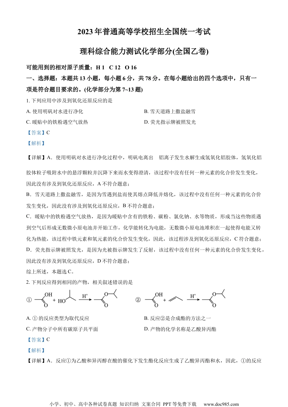 小学、初中、高中各种试卷真题知识归纳文案合同PPT等免费下载www.doc985.com2023年普通高等学校招生全国统一考试理科综合能力测试化学部分(全国乙卷)可能用到的相对原子质量:H1C12O16一、选择题:本题共13小题,每小题6分,共78分。在每小题给出的四个选项中,只有一项是符合题目要求的。(化学部分为第7~13题)1.下列应用中涉及到氧化还原反应的是A.使用明矾对水进行净化B.雪天道路上撒盐融雪C.暖贴中的铁粉遇空气放热D.荧光指示牌被照发光【答案】C【解析】【详解】A.使用明矾对水进行净化过程中,明矾电离出的铝离子发生水解生成氢氧化铝胶体,氢氧化铝胶体粒子吸附水中的悬浮颗粒并沉降下来而水变得澄清,该过程中没有任何一种元素的化合价发生变化,因此没有涉及到氧化还原反应,A不符合题意;B.雪天道路上撒盐融雪,是因为雪遇到盐而使其熔点降低并熔化,该过程中没有任何一种元素的化合价发生变化,因此没有涉及到氧化还原反应,B不符合题意;C.暖贴中的铁粉遇空气放热,是因为暖贴中含有的铁粉、碳粉、氯化钠、水等物质,形成当这些物质遇到空气后形成无数微小原电池并开始工作,化学能转化为电能,无数微小原电池堆积在一起使得电能又转化为热能,该过程中铁元素和氧元素的化合价发生变化,因此,该过程涉及到氧化还原反应,C符合题意;D.荧光指示牌被照发光,是因为光被指示牌发生了反射,该过程中没有任何一种元素的化合价发生变化,因此没有涉及到氧化还原反应,D不符合题意;综上所述,本题选C。2.下列反应得到相同的产物,相关叙述错误的是A.①的反应类型为取代反应B.反应②是合成酯的方法之一C.产物分子中所有碳原子共平面D.产物的化学名称是乙酸异丙酯【答案】C【解析】【详解】A.反应①为乙酸和异丙醇在酸的催化下发生酯化反应生成了乙酸异丙酯和水,因此,①的反应小学、初中、高中各种试卷真题知识归纳文案合同PPT等免费下载www.doc985.com类型为取代反应,A叙述正确;B.反应②为乙酸和丙烯发生加成反应生成乙酸异丙酯,该反应的原子利用率为100%,因此,该反应是合成酯的方法之一,B叙述正确;C.乙酸异丙酯分子中含有4个饱和的碳原子,其中异丙基中存在着一个饱和碳原子连接两个饱和碳原子和一个乙酰氧基,类比甲烷的正四面体结构可知,乙酸异丙酯分子中的所有碳原子不可能共平面,C叙述是错误;D.两个反应的产物是相同的,从结构上看,该产物是由乙酸与异丙醇通过酯化反应生成的酯,故其化学名称是乙酸异丙酯,D叙述是正确;综上所述,本题选C。3.下列装置可以用于相应实验的是ABCD制备分离乙醇和乙酸验证酸性测量体积A.AB.BC.CD.D【答案】D【解析】【详解】A.Na2CO3固体比较稳定,受热不易分解,所以不能采用加热碳酸钠的方式制备二氧化碳,A错误;B.乙醇和乙酸是互溶的,不能采用分液的方式分离,应采用蒸馏来分离,B错误;C.二氧化硫通入品红溶液中,可以验证其漂白性,不能验证酸性,C错误;D.测量氧气体积时,装置选择量气筒,测量时要恢复到室温,量气筒和水准管两边液面高度相等时,氧气排开水的体积与氧气的体积相等,即可用如图装置测量氧气的体积,D正确;故选D。4.一种矿物由短周期元素W、X、Y组成,溶于稀盐酸有无色无味气体生成。W、X、Y原子序数依次增大。小学、初中、高中各种试卷真题知识归纳文案合同PPT等免费下载www.doc985.com简单离子与具有相同的电子结构。下列叙述正确的是A.X的常见化合价有、B.原子半径大小为C.YX的水合物具有两性D.W单质只有4种同素异形体【答案】A【解析】【分析】W、X、Y为短周期元素,原子序数依次增大,简单离子X2-与Y2+具有相同的电子结构,则它们均为10电子微粒,X为O,Y为Mg,W、X、Y组成的物质能溶于稀盐酸有无色无味的气体产生,则W为C,产生的气体为二氧化碳,据此解答。【详解】A.X为O,氧的常见价态有-1价和-2价,如H2O2和H2O,A正确;B.W为C,X为O,Y为Mg,同主族时电子层数越多,原子半径越大,电子层数相同时,原子序数越小,原子半径越大,所以原子半径大小为:Y>W>X,B错误;C.Y为Mg,X为O,他们可形成MgO,水合物为Mg(OH)2,Mg(OH)2只能与酸反应生成盐和水,不能与碱反应,所以YX...