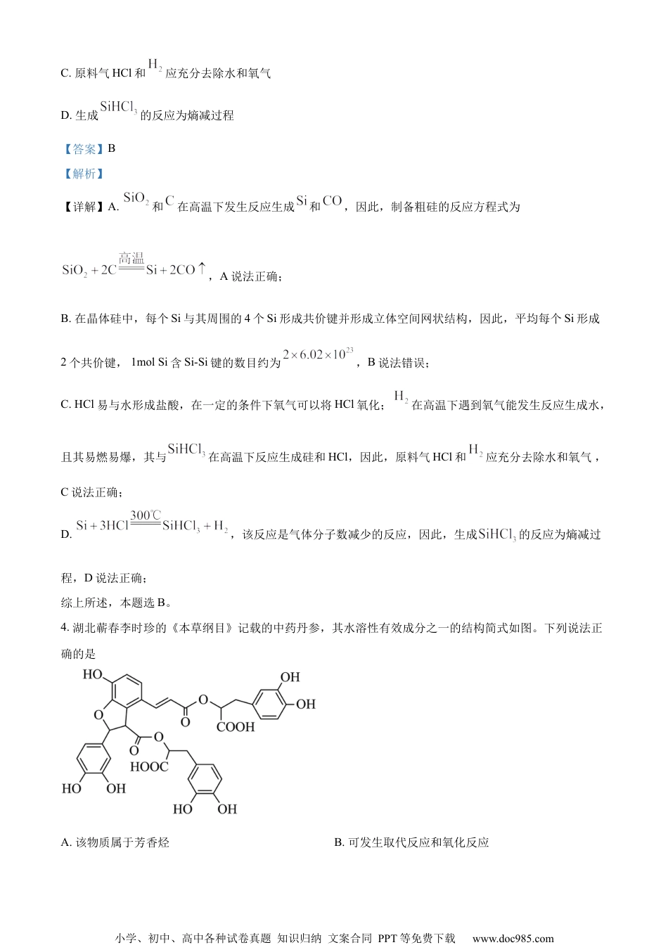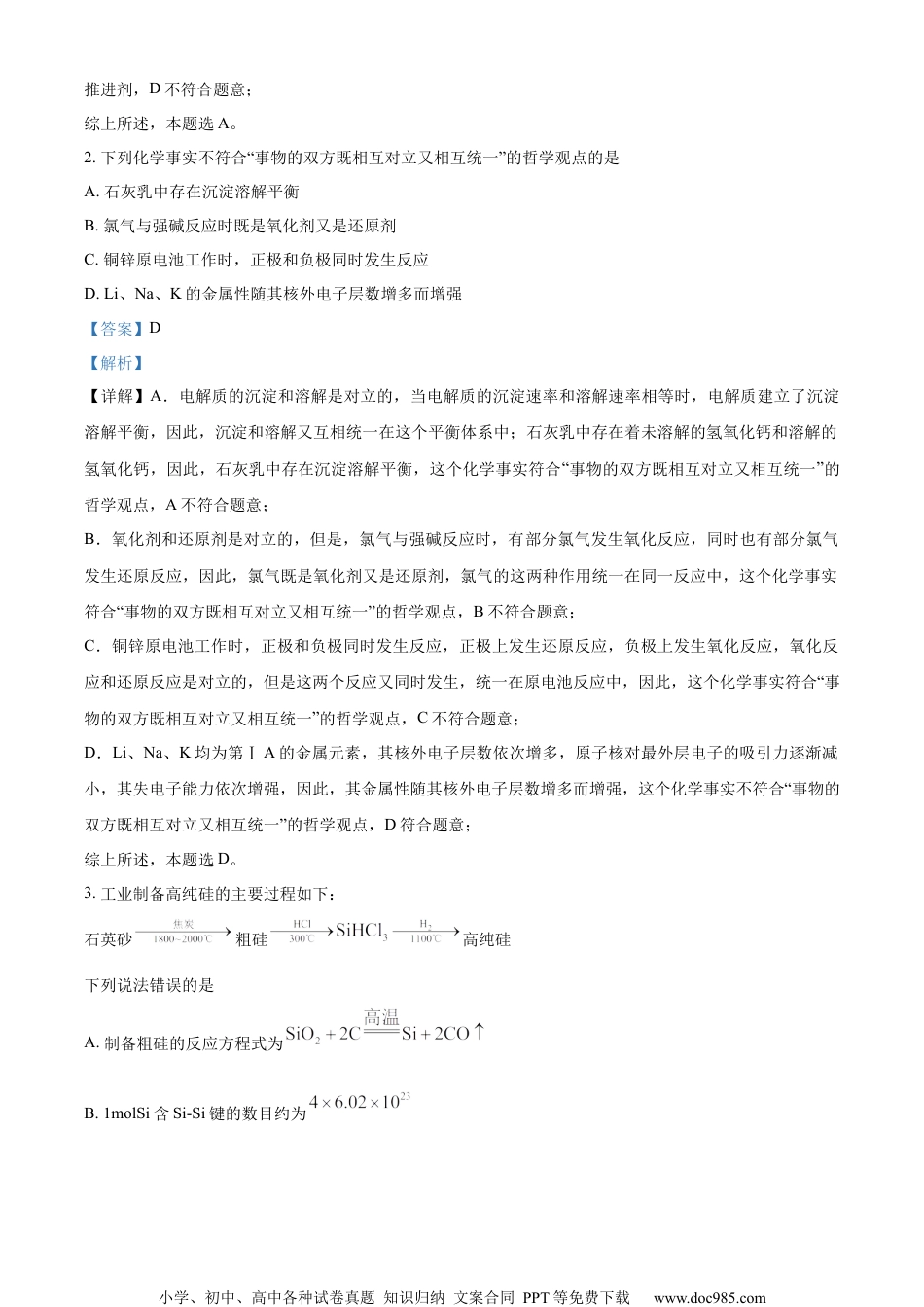 小学、初中、高中各种试卷真题知识归纳文案合同PPT等免费下载www.doc985.com2023年湖北省普通高中学业水平选择性考试化学本试卷共8页,19题。全卷满分100分。考试用时75分钟。注意事项:1.答题前,先将自己的姓名、准考证号、考场号、座位号填写在试卷和答题卡上,并认真核准准考证号条形码上的以上信息,将条形码粘贴在答题卡,上的指定位置。2.请按题号顺序在答题卡上各题目的答题区域内作答,写在试卷、草稿纸和答题卡上的非答题区域均无效。3.选择题用2B铅笔在答题卡上把所选答案的标号涂黑;非选择题用黑色签字笔在答题卡上作答;字体工整,笔迹清楚。4.考试结束后,请将试卷和答题卡一并上交。可能用到的相对原子质量:H1Li7O16Si28Cu64I127La139一、选择题:本题共15小题,每小题3分,共45分。在每小题给出的四个选项中,只有一项是符合题目要求的。1.2023年5月10日,天舟六号货运飞船成功发射,标志着我国航天事业进入到高质量发展新阶段。下列不能作为火箭推进剂的是A.液氮-液氢B.液氧-液氢C.液态-肼D.液氧-煤油【答案】A【解析】【详解】A.虽然氮气在一定的条件下可以与氢气反应,而且是放热反应,但是,由于键能很大,该反应的速率很慢,氢气不能在氮气中燃烧,在短时间内不能产生大量的热量和大量的气体,因此,液氮-液氢不能作为火箭推进剂,A符合题意;B.氢气可以在氧气中燃烧,反应速率很快且放出大量的热、生成大量气体,因此,液氧-液氢能作为火箭推进剂,B不符合题意;C.肼和在一定的条件下可以发生剧烈反应,该反应放出大量的热,且生成大量气体,因此,液态-肼能作为火箭推进剂,C不符合题意;D.煤油可以在氧气中燃烧,反应速率很快且放出大量的热、生成大量气体,因此,液氧-煤油能作为火箭小学、初中、高中各种试卷真题知识归纳文案合同PPT等免费下载www.doc985.com推进剂,D不符合题意;综上所述,本题选A。2.下列化学事实不符合“事物的双方既相互对立又相互统一”的哲学观点的是A.石灰乳中存在沉淀溶解平衡B.氯气与强碱反应时既是氧化剂又是还原剂C.铜锌原电池工作时,正极和负极同时发生反应D.Li、Na、K的金属性随其核外电子层数增多而增强【答案】D【解析】【详解】A.电解质的沉淀和溶解是对立的,当电解质的沉淀速率和溶解速率相等时,电解质建立了沉淀溶解平衡,因此,沉淀和溶解又互相统一在这个平衡体系中;石灰乳中存在着未溶解的氢氧化钙和溶解的氢氧化钙,因此,石灰乳中存在沉淀溶解平衡,这个化学事实符合“事物的双方既相互对立又相互统一”的哲学观点,A不符合题意;B.氧化剂和还原剂是对立的,但是,氯气与强碱反应时,有部分氯气发生氧化反应,同时也有部分氯气发生还原反应,因此,氯气既是氧化剂又是还原剂,氯气的这两种作用统一在同一反应中,这个化学事实符合“事物的双方既相互对立又相互统一”的哲学观点,B不符合题意;C.铜锌原电池工作时,正极和负极同时发生反应,正极上发生还原反应,负极上发生氧化反应,氧化反应和还原反应是对立的,但是这两个反应又同时发生,统一在原电池反应中,因此,这个化学事实符合“事物的双方既相互对立又相互统一”的哲学观点,C不符合题意;D.Li、Na、K均为第ⅠA的金属元素,其核外电子层数依次增多,原子核对最外层电子的吸引力逐渐减小,其失电子能力依次增强,因此,其金属性随其核外电子层数增多而增强,这个化学事实不符合“事物的双方既相互对立又相互统一”的哲学观点,D符合题意;综上所述,本题选D。3.工业制备高纯硅的主要过程如下:石英砂粗硅高纯硅下列说法错误的是A.制备粗硅的反应方程式为B.1molSi含Si-Si键的数目约为小学、初中、高中各种试卷真题知识归纳文案合同PPT等免费下载www.doc985.comC.原料气HCl和应充分去除水和氧气D.生成的反应为熵减过程【答案】B【解析】【详解】A.和在高温下发生反应生成和,因此,制备粗硅的反应方程式为,A说法正确;B.在晶体硅中,每个Si与其周围的4个Si形成共价键并形成立体空间网状结构,因此,平均每个Si形成2个共价键,1molSi含Si-Si键的数目约为,B说法错误;C.HCl易与水形成盐酸,在一定的条件下氧气可以将HCl氧化;在高温下遇...