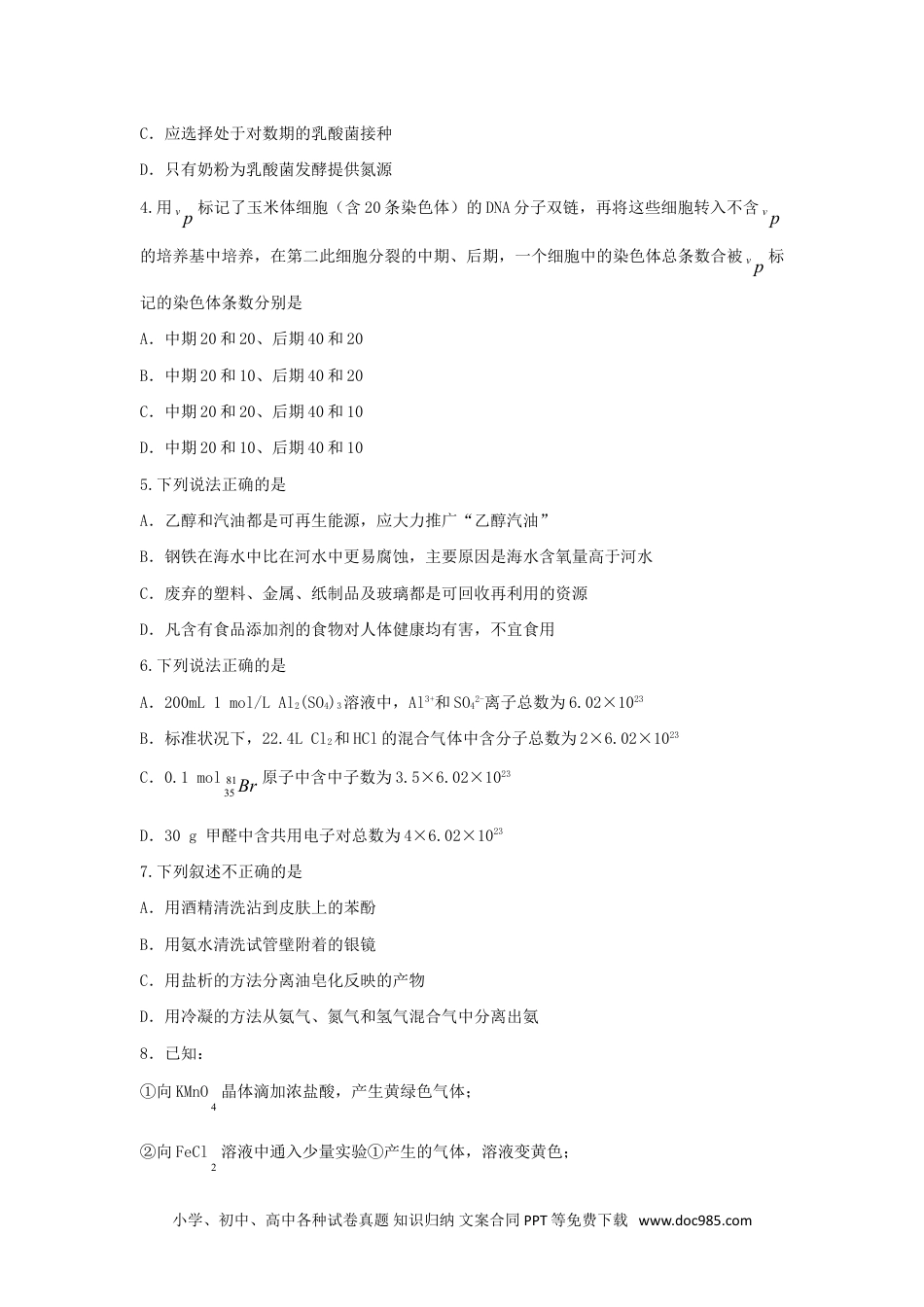2006年北京高考理综真题及答案本试卷分第I卷(选择题)和第II卷(非选择题)两部分,第I卷1至4页,第II卷5至16页,共300分。考试时间150分钟。考试结束,将本试卷和答题卡一并交回。第I卷(选择题共40分)注意事项:1.答第I卷前,考生务必将自己的姓名、准考证号、考试科目涂写在答题卡上。2.每小题选出答案后,用铅笔把答题卡上对应题目的答案标号涂黑。如需改动,用橡皮擦干净后,再在选涂其他答案标号,不能答在试卷上。一、本大题共20小题,每小题6分,共120分。在每列出的四个选项中,选出符合题目要求的一项。以下数据可供解题时参考:可能用到的相对原则质量:H1C12O161.以下不能说明细胞全能性的试验是A.胡萝卜韧皮部细胞培育出植株B.紫色糯性玉米种子培育出植株C.转入抗虫基因的棉花细胞培育出植株D.番茄与马铃薯体细胞杂交后培育出植株2.夏季,在青天、阴天、多云、高温干旱四种天气条件下,猕猴桃的净光合作用强度(实际光合速率与呼吸速率之差)变化曲线不同,表示晴天的曲线图是3.用蔗糖、奶粉和经蛋白酶水解后的玉米胚芽液,通过乳酸菌发酵可生产新型酸奶,下列相关叙述错误的是A.蔗糖消耗量与乳酸生成量呈正相关B.酸奶出现明显气泡说明有杂菌污染小学、初中、高中各种试卷真题知识归纳文案合同PPT等免费下载www.doc985.comC.应选择处于对数期的乳酸菌接种D.只有奶粉为乳酸菌发酵提供氮源4.用vp标记了玉米体细胞(含20条染色体)的DNA分子双链,再将这些细胞转入不含vp的培养基中培养,在第二此细胞分裂的中期、后期,一个细胞中的染色体总条数合被vp标记的染色体条数分别是A.中期20和20、后期40和20B.中期20和10、后期40和20C.中期20和20、后期40和10D.中期20和10、后期40和105.下列说法正确的是A.乙醇和汽油都是可再生能源,应大力推广“乙醇汽油”B.钢铁在海水中比在河水中更易腐蚀,主要原因是海水含氧量高于河水C.废弃的塑料、金属、纸制品及玻璃都是可回收再利用的资源D.凡含有食品添加剂的食物对人体健康均有害,不宜食用6.下列说法正确的是A.200mL1mol/LAl2(SO4)3溶液中,Al3+和SO42-离子总数为6.02×1023B.标准状况下,22.4LCl2和HCl的混合气体中含分子总数为2×6.02×1023C.0.1molBr8135原子中含中子数为3.5×6.02×1023D.30g甲醛中含共用电子对总数为4×6.02×10237.下列叙述不正确的是A.用酒精清洗沾到皮肤上的苯酚B.用氨水清洗试管壁附着的银镜C.用盐析的方法分离油皂化反映的产物D.用冷凝的方法从氨气、氮气和氢气混合气中分离出氨8.已知:①向KMnO4晶体滴加浓盐酸,产生黄绿色气体;②向FeCl2溶液中通入少量实验①产生的气体,溶液变黄色;小学、初中、高中各种试卷真题知识归纳文案合同PPT等免费下载www.doc985.com③取实验②生成的溶液滴在淀粉KI试纸上,试纸变蓝色。下列判断正确的是A.上述实验证明氧化性:MnO4->Cl2>Fe2+>I2B.上述实验中,共有两个氧化还原反应C.实试验①生成的气体不能使湿润的淀粉Kl试纸变蓝D.实试验②证明Fe2+既有氧化性又有还原性9.将aLNH3通过灼热的装有铁触媒的硬质玻璃管后,气体体积变为bL(气体体积均在同温同压下测定),该bL气体中NH3的体积分数是A.2abaB.babC.2abbD.baa10.右图中每条折线表示周体表IVA~VIIA中的某一族元素氢化物的沸点变化,其中a点代表的是A.H2SB.HClC.PH3D.SiH411.某酸HX稀溶液和某碱YOH稀溶液的物质的量浓度相等,两溶液混合后,溶液pH大于7,下表中判断合理的是标号HXYOH溶液的体积关系①强酸强碱V(HX)=V(YOH)②强酸强碱V(HX)<V(YOH)③弱酸弱碱V(HX)=V(YOH)④弱酸强碱V(HX)=V(YOH)A.①③B.②③C.①④D.②④12.R、W、X、Y、Z为原子序数依次递增的同一短周期元素,下列说法一定正确的是(m。n均为正整数)A.若R(OH)n为强碱,则W(OH)m也为强碱小学、初中、高中各种试卷真题知识归纳文案合同PPT等免费下载www.doc985.comB.若HnXOm为强酸,则Y是活泼非金属元素C.若Y的最低化合价为-2,则Z的最高正化合价为+6D.若X的最高正化合价为+5,则五种元素都是非金属元素13.目前核电站利用的核反应是A.裂变,核燃料为...