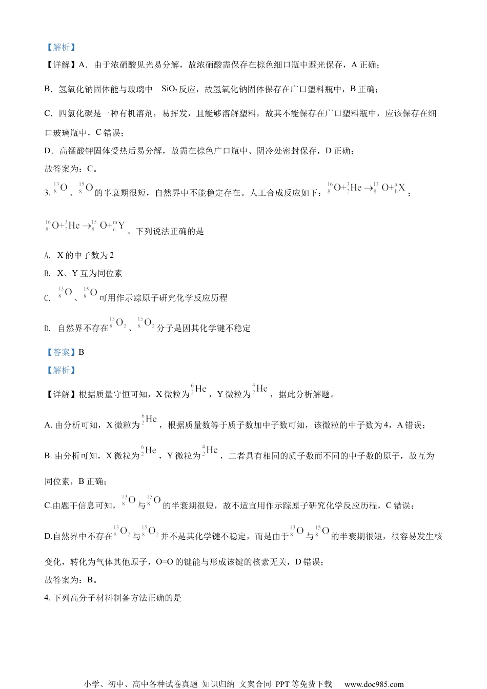 小学、初中、高中各种试卷真题知识归纳文案合同PPT等免费下载www.doc985.com山东省2022年普通高中学业水平等级考试化学注意事项:1.答卷前,考生务必将自己的姓名、考生号等填写在答题卡和试卷指定位置。2.回答选择题时,选出每小题答案后,用铅笔把答题卡上对应题目的答案标号涂黑。如需改动,用橡皮擦干净后,再选涂其他答案标号。回答非选择题时,将答案写在答题卡上。写在本试卷上无效。3.考试结束后,将本试卷和答题卡一并交回。可能用到的相对原子质量:H1C12O16S32Cl35.5Ti48Co59一、选择题:本题共10小题,每小题2分,共20分。每小题只有一个选项符合题目要求。1.古医典富载化学知识,下述之物见其氧化性者为A.金(Au):“虽被火亦未熟"B.石灰(CaO):“以水沃之,即热蒸而解”C.石硫黄(S):“能化……银、铜、铁,奇物”D.石钟乳():“色黄,以苦酒(醋)洗刷则白”【答案】C【解析】【详解】A.金“虽被火亦未熟”是指金单质在空气中被火灼烧也不反应,反应金的化学性质很稳定,与其氧化性无关,A不合题意;B.石灰(CaO):“以水沃之,即热蒸而解”是指CaO+H2O=Ca(OH)2,反应放热,产生大量的水汽,而CaO由块状变为粉末状,未发生氧化还原反应,与其氧化性无关,B不合题意;C.石硫黄即S:“能化……银、铜、铁,奇物”是指2Ag+SAg2S、Fe+SFeS、2Cu+SCu2S,反应中S作氧化剂,与其氧化性有关,C符合题意;D.石钟乳(CaCO3):“色黄,以苦酒(醋)洗刷则白”是指CaCO3+2CH3COOH=(CH3COO)2Ca+H2O+CO2↑,未发生氧化还原反应,与其氧化性无关,D不合题意;故答案为:C。2.下列试剂实验室保存方法错误的是A.浓硝酸保存在棕色细口瓶中B.氢氧化钠固体保存在广口塑料瓶中C.四氯化碳保存在广口塑料瓶中D.高锰酸钾固体保存在棕色广口瓶中【答案】C小学、初中、高中各种试卷真题知识归纳文案合同PPT等免费下载www.doc985.com【解析】【详解】A.由于浓硝酸见光易分解,故浓硝酸需保存在棕色细口瓶中避光保存,A正确;B.氢氧化钠固体能与玻璃中的SiO2反应,故氢氧化钠固体保存在广口塑料瓶中,B正确;C.四氯化碳是一种有机溶剂,易挥发,且能够溶解塑料,故其不能保存在广口塑料瓶中,应该保存在细口玻璃瓶中,C错误;D.高锰酸钾固体受热后易分解,故需在棕色广口瓶中、阴冷处密封保存,D正确;故答案为:C。3.、的半衰期很短,自然界中不能稳定存在。人工合成反应如下:;。下列说法正确的是A.X的中子数为2B.X、Y互为同位素C.、可用作示踪原子研究化学反应历程D.自然界不存在、分子是因其化学键不稳定【答案】B【解析】【详解】根据质量守恒可知,X微粒为,Y微粒为,据此分析解题。A.由分析可知,X微粒为,根据质量数等于质子数加中子数可知,该微粒的中子数为4,A错误;B.由分析可知,X微粒为,Y微粒为,二者具有相同的质子数而不同的中子数的原子,故互为同位素,B正确;C.由题干信息可知,与的半衰期很短,故不适宜用作示踪原子研究化学反应历程,C错误;D.自然界中不存在与并不是其化学键不稳定,而是由于与的半衰期很短,很容易发生核变化,转化为气体其他原子,O=O的键能与形成该键的核素无关,D错误;故答案为:B。4.下列高分子材料制备方法正确的是小学、初中、高中各种试卷真题知识归纳文案合同PPT等免费下载www.doc985.comA.聚乳酸()由乳酸经加聚反应制备B.聚四氟乙烯()由四氟乙烯经加聚反应制备C.尼龙()由己胺和己酸经缩聚反应制备D.聚乙烯醇()由聚乙酸乙烯酯()经消去反应制备【答案】B【解析】【详解】A.聚乳酸()是由乳酸[HOCH(CH3)COOH]分子间脱水缩聚而得,即发生缩聚反应,A错误;B.聚四氟乙烯()是由四氟乙烯(CF2=CF2)经加聚反应制备,B正确;C.尼龙-66()是由己二胺和己二酸经过缩聚反应制得,C错误;D.聚乙烯醇()由聚乙酸乙烯醇酯()发生水解反应制得,D错误;故答案为:B。5.、属于第三代半导体材料,二者成键结构与金刚石相似,晶体中只存在键、键。下列说法错误的是小学、初中、高中各种试卷真题知识归纳文案合同PPT等免费下载www.doc985.comA.的熔点高于B.晶体中所有化学键均为极性键C.晶体中所有原子均采取杂化D.晶体中所有原子的配位数均相同【答案】A【解析】...