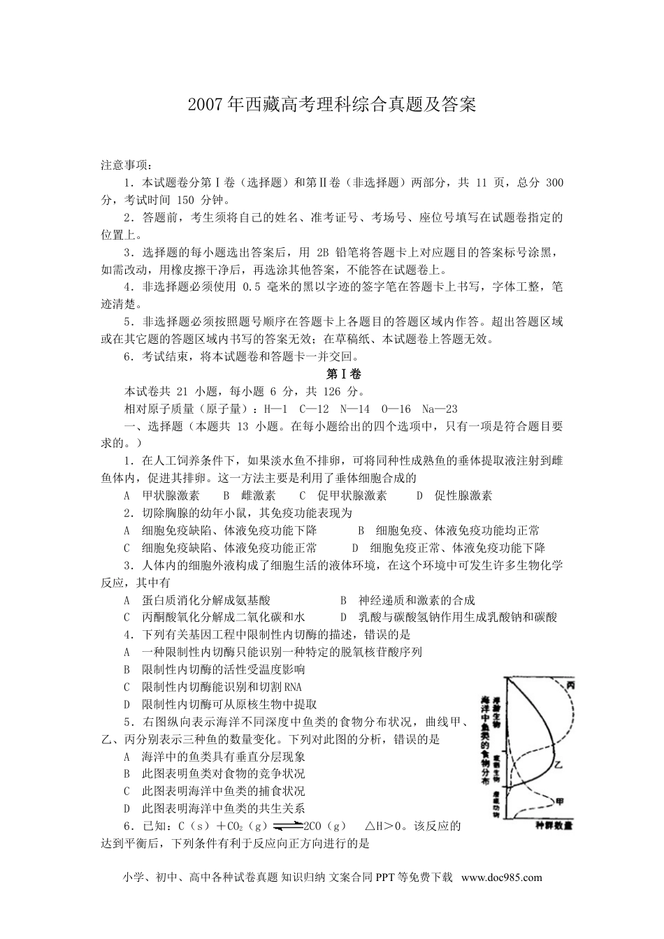 2007年西藏高考理科综合真题及答案注意事项:1.本试题卷分第Ⅰ卷(选择题)和第Ⅱ卷(非选择题)两部分,共11页,总分300分,考试时间150分钟。2.答题前,考生须将自己的姓名、准考证号、考场号、座位号填写在试题卷指定的位置上。3.选择题的每小题选出答案后,用2B铅笔将答题卡上对应题目的答案标号涂黑,如需改动,用橡皮擦干净后,再选涂其他答案,不能答在试题卷上。4.非选择题必须使用0.5毫米的黑以字迹的签字笔在答题卡上书写,字体工整,笔迹清楚。5.非选择题必须按照题号顺序在答题卡上各题目的答题区域内作答。超出答题区域或在其它题的答题区域内书写的答案无效;在草稿纸、本试题卷上答题无效。6.考试结束,将本试题卷和答题卡一并交回。第Ⅰ卷本试卷共21小题,每小题6分,共126分。相对原子质量(原子量):H—1C—12N—14O—16Na—23一、选择题(本题共13小题。在每小题给出的四个选项中,只有一项是符合题目要求的。)1.在人工饲养条件下,如果淡水鱼不排卵,可将同种性成熟鱼的垂体提取液注射到雌鱼体内,促进其排卵。这一方法主要是利用了垂体细胞合成的A甲状腺激素B雌激素C促甲状腺激素D促性腺激素2.切除胸腺的幼年小鼠,其免疫功能表现为A细胞免疫缺陷、体液免疫功能下降B细胞免疫、体液免疫功能均正常C细胞免疫缺陷、体液免疫功能正常D细胞免疫正常、体液免疫功能下降3.人体内的细胞外液构成了细胞生活的液体环境,在这个环境中可发生许多生物化学反应,其中有A蛋白质消化分解成氨基酸B神经递质和激素的合成C丙酮酸氧化分解成二氧化碳和水D乳酸与碳酸氢钠作用生成乳酸钠和碳酸4.下列有关基因工程中限制性内切酶的描述,错误的是A一种限制性内切酶只能识别一种特定的脱氧核苷酸序列B限制性内切酶的活性受温度影响C限制性内切酶能识别和切割RNAD限制性内切酶可从原核生物中提取5.右图纵向表示海洋不同深度中鱼类的食物分布状况,曲线甲、乙、丙分别表示三种鱼的数量变化。下列对此图的分析,错误的是A海洋中的鱼类具有垂直分层现象B此图表明鱼类对食物的竞争状况C此图表明海洋中鱼类的捕食状况D此图表明海洋中鱼类的共生关系6.已知:C(s)+CO2(g)2CO(g)△H>0。该反应的达到平衡后,下列条件有利于反应向正方向进行的是小学、初中、高中各种试卷真题知识归纳文案合同PPT等免费下载www.doc985.comA升高温度和减小压强B降低温度和减小压强C降低温度和增大压强D升高温度和增大压强7.0.1mol/LNaHCO3溶液的pH最接近于A.5.6B.7.0C.8.4D.13.08.能正确表示下列反应的离子方程式是A醋酸钠的水解反应CH3COO-+H3O+=CH3COOH+H2OB碳酸氢钙与过量的NaOH溶液反应Ca2++2HCO3-+2OH-=CaCO3↓+2H2O+CO32-C苯酚钠溶液与二氧化碳反应C6H5O-+CO2+H2O=C6H5OH+CO32-D稀硝酸与过量的铁屑反应3Fe+8H++2NO3-=3Fe3++2NO↑+4H2O9.已知:①1molH2分子中化学键断裂时需要吸收436kJ的能量②1molCl2分子中化学键断裂时需要吸收243kJ的能量③由H原子和Cl原子形成1molHCl分子时释放431kJ的能量下列叙述正确的是A.氢气和氯气反应生成氯化氢气体的热化学方程式是H2(g)+Cl2(g)=2HCl(g)B.氢气和氯气反应生成2mol氯化氢气体,反应的△H=183kJ/molC.氢气和氯气反应生成2mol氯化氢气体,反应的△H=-183kJ/molD.氢气和氯气反应生成1mol氯化氢气体,反应的△H=-183kJ/mol10.在盛有稀H2SO4的烧杯中放入用导线连接锌片和铜片,下列叙述正确的是A正极附近的SO42―离子浓度逐渐增大B电子通过导线由铜片流向锌片C正极有O2逸出D铜片上有H2逸出11.下列氧化还原反应中,水作为氧化剂的是ACO+H2OCO2+H2B3NO2+H2O=2HNO3+NOC2Na2O2+2H2O=4NaOH+O2↑D2F2+2H2O=4HF+O212.仔细分析下列表格中烃的排列规律,判断排列在第15位烃的分子式是123456789……C2H2C2H4C2H6C3H4C3H6C3H8C4H6C4H8C4H10……AC6H12BC6H14CC7H12DC7H1413.在一定条件下,将钠与氧气反应的生成物1.5g溶于水,所得溶液恰好能被80mL浓度为0.50mol/L的HCl溶液中和,则该生成物的成分是ANa2OBNa2O2CNa2O和Na2O2DNa2O2和NaO2二、选择题(本题共8小题。在每小题给出的四个选项中,...