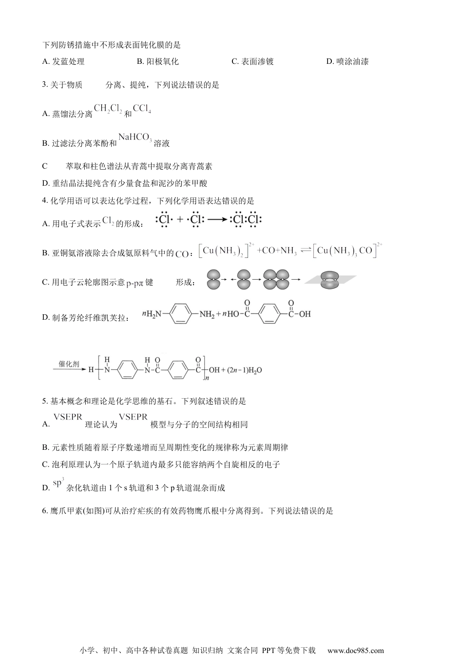 小学、初中、高中各种试卷真题知识归纳文案合同PPT等免费下载www.doc985.com机密★启用前2024年湖北省普通高中学业水平选择性考试化学本试卷共8页,19题。主卷满分100分。考试用时75分钟。★祝考试顺利★注意事项:1.答题前,先将自己的姓名、准考证号、考场号、座位号填写在试卷和答题卡上,并认真核准准考证号条形码上的以上信息,将条形码粘贴在答题卡上的指定位置。2.请按题号顺序在答题卡上各题目的答题区域内作答,写在试卷、草稿纸和答题卡上的非答题区域均无效。3.选择题用2B铅笔在答题卡上把所选答案的标号涂黑;非选择题用黑色签字笔在答题卡上作答;字体工整,笔迹清楚。4.考试结束后,请将试卷和答题卡一并上交。可能用到的相对原子质量:本卷涉及的实验均须在专业人士指导和安全得到充分保障的条件下完成。一、选择题:本题共15小题,每小题3分,共45分。在每小题给出的四个选项中,只有一项是符合题目要求的。1.劳动人民的发明创造是中华优秀传统文化的组成部分。下列化学原理描述错误的是发明关键操作化学原理A制墨松木在窑内焖烧发生不完全燃烧B陶瓷黏土高温烧结形成新的化学键C造纸草木灰水浸泡树皮促进纤维素溶解D火药硫黄、硝石和木炭混合,点燃发生氧化还原反应A.AB.BC.CD.D2.2024年5月8日,我国第三艘航空母舰福建舰顺利完成首次海试。舰体表面需要采取有效的防锈措施,小学、初中、高中各种试卷真题知识归纳文案合同PPT等免费下载www.doc985.com下列防锈措施中不形成表面钝化膜的是A.发蓝处理B.阳极氧化C.表面渗镀D.喷涂油漆3.关于物质的分离、提纯,下列说法错误的是A.蒸馏法分离和B.过滤法分离苯酚和溶液C.萃取和柱色谱法从青蒿中提取分离青蒿素D.重结晶法提纯含有少量食盐和泥沙的苯甲酸4.化学用语可以表达化学过程,下列化学用语表达错误的是A.用电子式表示的形成:B.亚铜氨溶液除去合成氨原料气中的:C.用电子云轮廓图示意键的形成:D.制备芳纶纤维凯芙拉:5.基本概念和理论是化学思维的基石。下列叙述错误的是A.理论认为模型与分子的空间结构相同B.元素性质随着原子序数递增而呈周期性变化的规律称为元素周期律C.泡利原理认为一个原子轨道内最多只能容纳两个自旋相反的电子D.杂化轨道由1个s轨道和3个p轨道混杂而成6.鹰爪甲素(如图)可从治疗疟疾的有效药物鹰爪根中分离得到。下列说法错误的是小学、初中、高中各种试卷真题知识归纳文案合同PPT等免费下载www.doc985.comA.有5个手性碳B.在条件下干燥样品C.同分异构体的结构中不可能含有苯环D.红外光谱中出现了以上的吸收峰7.过量与以下的溶液反应,下列总反应方程式错误的是溶液现象化学方程式A产生淡黄色沉淀B溶液由棕黄色变浅绿色C溶液褪色,产生白色沉淀D(含酚酞)溶液由红色变无色A.AB.BC.CD.D8.结构决定性质,性质决定用途。下列事实解释错误的是事实解释A甘油是黏稠液体甘油分子间的氢键较强B王水溶解铂浓盐酸增强了浓硝酸的氧化性C冰的密度小于干冰冰晶体中水分子的空间利用率相对较低D石墨能导电未杂化的p轨道重叠使电子可在整个碳原子平面内运动小学、初中、高中各种试卷真题知识归纳文案合同PPT等免费下载www.doc985.comA.AB.BC.CD.D9.主族元素W、X、Y、Z原子序数依次增大,X、Y的价电子数相等,Z的价电子所在能层有16个轨道,4种元素形成的化合物如图。下列说法正确的是A.电负性:B.酸性:C.基态原子的未成对电子数:D.氧化物溶于水所得溶液的10.碱金属的液氨溶液含有的蓝色溶剂化电子是强还原剂。锂与液氨反应的装置如图(夹持装置略)。下列说法错误的是A.碱石灰有利于逸出B.锂片必须打磨出新鲜表面C.干燥管中均可选用D.双口烧瓶中发生的变化是11.黄金按质量分数分级,纯金为。合金的三种晶胞结构如图,Ⅱ和Ⅲ是立方晶胞。下列说法错误的是小学、初中、高中各种试卷真题知识归纳文案合同PPT等免费下载www.doc985.comA.I为金B.Ⅱ中的配位数是12C.Ⅲ中最小核间距D.I、Ⅱ、Ⅲ中,与原子个数比依次为、、12.在超高压下转化为平行六面体的分子(如图)。下列说法错误的是A.和互为同素异形体B.中存在不同的氧氧键C.转化为是熵减反应D.常压低温下能稳定存在13.气氛下,溶液中含铅物种的分布如图。纵...