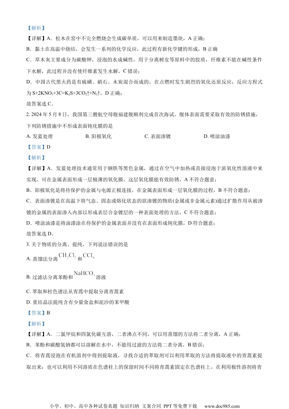 小学、初中、高中各种试卷真题知识归纳文案合同PPT等免费下载www.doc985.com机密★启用前2024年湖北省普通高中学业水平选择性考试化学本试卷共8页,19题。主卷满分100分。考试用时75分钟。★祝考试顺利★注意事项:1.答题前,先将自己的姓名、准考证号、考场号、座位号填写在试卷和答题卡上,并认真核准准考证号条形码上的以上信息,将条形码粘贴在答题卡上的指定位置。2.请按题号顺序在答题卡上各题目的答题区域内作答,写在试卷、草稿纸和答题卡上的非答题区域均无效。3.选择题用2B铅笔在答题卡上把所选答案的标号涂黑;非选择题用黑色签字笔在答题卡上作答;字体工整,笔迹清楚。4.考试结束后,请将试卷和答题卡一并上交。可能用到的相对原子质量:本卷涉及的实验均须在专业人士指导和安全得到充分保障的条件下完成。一、选择题:本题共15小题,每小题3分,共45分。在每小题给出的四个选项中,只有一项是符合题目要求的。1.劳动人民的发明创造是中华优秀传统文化的组成部分。下列化学原理描述错误的是发明关键操作化学原理A制墨松木在窑内焖烧发生不完全燃烧B陶瓷黏土高温烧结形成新的化学键C造纸草木灰水浸泡树皮促进纤维素溶解D火药硫黄、硝石和木炭混合,点燃发生氧化还原反应A.AB.BC.CD.D【答案】C小学、初中、高中各种试卷真题知识归纳文案合同PPT等免费下载www.doc985.com【解析】【详解】A.松木在窑中不完全燃烧会生成碳单质,可以用来制造墨块,A正确;B.黏土在高温中烧结,会发生一系列的化学反应,此过程有新化学键的形成,B正确C.草木灰主要成分为碳酸钾,浸泡的水成碱性,用于分离树皮等原料中的胶质,纤维素不能在碱性条件下水解,此过程并没有使纤维素发生水解,C错误;D.中国古代黑火药是有硫磺、硝石、木炭混合而成的,在点燃时发生剧烈的氧化还原反应,反应方程式为S+2KNO3+3C=K2S+3CO2↑+N2↑,D正确;故答案选C。2.2024年5月8日,我国第三艘航空母舰福建舰顺利完成首次海试。舰体表面需要采取有效的防锈措施,下列防锈措施中不形成表面钝化膜的是A.发蓝处理B.阳极氧化C.表面渗镀D.喷涂油漆【答案】D【解析】【详解】A.发蓝处理技术通常用于钢铁等黑色金属,通过在空气中加热或直接浸泡于浓氧化性溶液中来实现,可在金属表面形成一层极薄的氧化膜,这层氧化膜能有效防锈,A不符合题意;B.阳极氧化是将待保护的金属与电源正极连接,在金属表面形成一层氧化膜的过程,B不符合题意;C.表面渗镀是在高温下将气态、固态或熔化状态的欲渗镀的物质(金属或非金属元素)通过扩散作用从被渗镀的金属的表面渗入内部以形成表层合金镀层的一种表面处理的方法,C不符合题意;D.喷涂油漆是将油漆涂在待保护的金属表面并没有在表面形成钝化膜,D符合题意;故答案选D。3.关于物质的分离、提纯,下列说法错误的是A.蒸馏法分离和B.过滤法分离苯酚和溶液C.萃取和柱色谱法从青蒿中提取分离青蒿素D.重结晶法提纯含有少量食盐和泥沙的苯甲酸【答案】B【解析】【详解】A.二氯甲烷和四氯化碳互溶,二者沸点不同,可以用蒸馏的方法将二者分离,A正确;B.苯酚和碳酸氢钠都可以溶解在水中,不能用过滤的方法将二者分离,B错误;C.将青蒿浸泡在有机溶剂中得到提取液,寻找合适的萃取剂可以利用萃取的方法将提取液中的青蒿素提取出来;也可以利用不同溶质在色谱柱上的保留时间不同将青蒿素固定在色谱柱上,在利用极性溶剂将青小学、初中、高中各种试卷真题知识归纳文案合同PPT等免费下载www.doc985.com蒿素洗脱下来,得到纯净的青蒿素,C正确;D.食盐和苯甲酸的溶解度二者差异较大,可以利用重结晶的方式将低温下溶解度较小的苯甲酸提纯出来,D正确;故答案选B。4.化学用语可以表达化学过程,下列化学用语表达错误的是A.用电子式表示的形成:B.亚铜氨溶液除去合成氨原料气中的:C.用电子云轮廓图示意键的形成:D.制备芳纶纤维凯芙拉:【答案】B【解析】【详解】A.氯元素为VIIA族元素,最外层电子数为7,Cl原子与Cl原子共用1对电子形成Cl2,电子式表示Cl2的形成过程为:,故A正确;B.亚铜氨中铜元素的化合价为+1价,而中铜元素为+2价,亚铜氨溶液除去合成氨原料气中的CO的原...