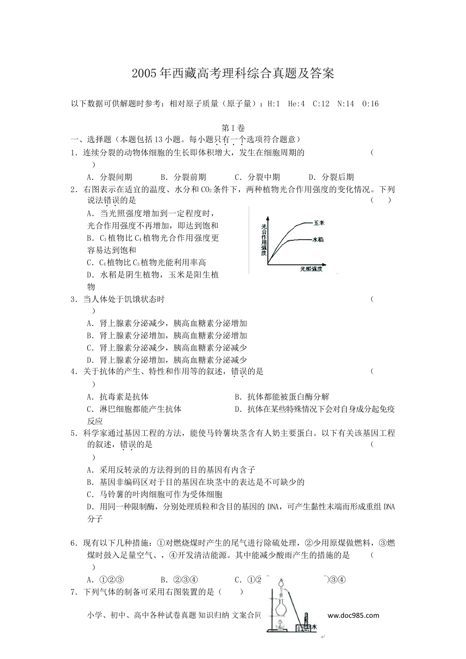 2005年西藏高考理科综合真题及答案以下数据可供解题时参考:相对原子质量(原子量):H:1He:4C:12N:14O:16第I卷一、选择题(本题包括13小题。每小题只有一个选项符合题意)1.连续分裂的动物体细胞的生长即体积增大,发生在细胞周期的()A.分裂间期B.分裂前期C.分裂中期D.分裂后期2.右图表示在适宜的温度、水分和CO2条件下,两种植物光合作用强度的变化情况。下列说法错误的是()A.当光照强度增加到一定程度时,光合作用强度不再增加,即达到饱和B.C3植物比C4植物光合作用强度更容易达到饱和C.C4植物比C3植物光能利用率高D.水稻是阴生植物,玉米是阳生植物3.当人体处于饥饿状态时()A.肾上腺素分泌减少,胰高血糖素分泌增加B.肾上腺素分泌增加,胰高血糖素分泌增加C.肾上腺素分泌减少,胰高血糖素分泌减少D.肾上腺素分泌增加,胰高血糖素分泌减少4.关于抗体的产生、特性和作用等的叙述,错误的是()A.抗毒素是抗体B.抗体都能被蛋白酶分解C.淋巴细胞都能产生抗体D.抗体在某些特殊情况下会对自身成分起免疫反应5.科学家通过基因工程的方法,能使马铃薯块茎含有人奶主要蛋白。以下有关该基因工程的叙述,错误的是()A.采用反转录的方法得到的目的基因有内含子B.基因非编码区对于目的基因在块茎中的表达是不可缺少的C.马铃薯的叶肉细胞可作为受体细胞D.用同一种限制酶,分别处理质粒和含目的基因的DNA,可产生黏性末端而形成重组DNA分子6.现有以下几种措施:①对燃烧煤时产生的尾气进行除硫处理,②少用原煤做燃料,③燃煤时鼓入足量空气、,④开发清洁能源。其中能减少酸雨产生的措施的是()A.①②③B.②③④C.①②④D.①③④7.下列气体的制备可采用右图装置的是()小学、初中、高中各种试卷真题知识归纳文案合同PPT等免费下载www.doc985.comA.铜与浓硝酸反应制NO2B.铜与稀硝酸反应制SOC.乙醇与浓硫酸反应制乙烯D.氯化钠与浓硫酸反应制HCl8.在体积可变的密闭容器中,反应mA(气)+nB(固)pC(气)达到平衡后,压缩容器的体积,发现A的转化率随之降低。下列说法中,正确的是()A.(m+n)必定小于pB.(m+n)必定大于pC.m必定小于pD.n必定大于p9.同一主族的两种元素的原子序数之差不可能是()A.16B.26C.36D.4610.向0.1mol·L-1NaOH溶液中通入过量CO2后,溶液中存在的主要离子是()A.Na+、COB.Na+、HCO3-C.HCO3-、COD.Na+、OH-11.已知KH和H2O反应生成H2和KOH,反应中1molKH()A.失去1mol电子B.得到1mol电子C.失去2mol电子D.没有电子得失12.在273K和10kPa的条件下,将2.00g氮气、1.40g氮气和1.60g氧气混合,该混合气体的体积是()A.6.72LB.7.84LC.10.08LD.13.44L13.能正确表示下列反应的离子方程式是()A.甲酸钠溶液和盐酸反应:HCOO-+H+HCOOHB.硫化钠的第一步水解:S2-+2H2OH2S+2OH-C.醋酸钡溶液和硫酸反应:Ba2++SOBaSO4↓D.氢氧化钙溶液和碳酸氢镁反应:Ca2++OH-+HCO3-CaCO3↓+H2O二、选择题(本题包括8小题。每小题给出的四个选项中,有的只有一个选项正确,有的有多个选项正确)14.如图所示,一物块位于光滑水平桌面上,用一大小为F、方向如图所示的力去推它,使它以加速度a向右运动。若保持力的方向不变而大力的大小,则()A.a变大B.a不变C.a变小D.因为物块的质量未知,故不能确定a变化的趋势15.氢原子的能级图如图所示。欲使一处于基态的氢原子释放出一个电子而变成氢离子,该氢原子需要吸收的能量至少是()A.13.60eVB.10.20eVC.0.54eVD.27.20eV小学、初中、高中各种试卷真题知识归纳文案合同PPT等免费下载www.doc985.com16.如图,闭合线圈上方有一竖直放置的条形磁铁,磁铁的N极朝下。当磁铁向下运动时(但未插入线圈内部).()A.线圈中感应电流的方向与图中箭头方向相同,磁铁与线圈相互吸引B.线圈中感应电流的方向与图中箭头方向相同,磁铁与线圈相互排斥C.线圈中感应电流的方向与图中箭头方向相反,磁铁与线圈相互吸引D.线圈中感应电流的方向与图中箭头方向相反,磁铁与线圈相互排斥17.水平放置的平行板电容器与一电池相连,在电容器的两板间有一带正电的质点处于静止平衡状...