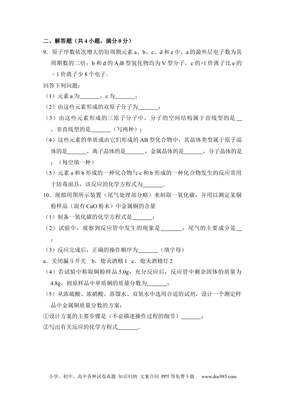 小学、初中、高中各种试卷真题知识归纳文案合同PPT等免费下载www.doc985.com2012年全国统一高考化学试卷(大纲版)一、选择题1.下列关于化学键的叙述,正确的一项是()A.离子化合物中一定含有离子键B.单质分子中均不存在化学键C.含有极性键的分子一定是极性分子D.含有共价键的化合物一定是共价化合物2.能正确表示下列反应的离子方程式是()A.硫酸铝溶液中加入过量氨水Al3++3OH﹣=Al(OH)3↓B.碳酸钠溶液中加入澄清石灰水Ca(OH)2+CO32﹣=CaCO3↓+2OH﹣C.冷的氢氧化钠溶液中通入氯气Cl2+2OH﹣=ClO﹣+Cl﹣+H2OD.稀硫酸中加入铁粉2Fe+6H+=2Fe3++3H2↑3.合成氨所需的氢气可用煤和水作原料经多步反应制得,其中的一步反应为:CO(g)+H2O(g)CO2(g)+H2(g)△H<0反应达到平衡后,为提高CO的转化率,下列措施中正确的是()A.增加压强B.降低温度C.增大CO的浓度D.更换催化剂4.反应A+B→C(△H<0)分两步进行①A+B→X(△H>0)②X→C(△H<0)下列示意图中,能正确表示总反应过程中能量变化的是()A.B.小学、初中、高中各种试卷真题知识归纳文案合同PPT等免费下载www.doc985.comC.D.5.元素X形成的离子与钙离子的核外电子排布相同,且X的离子半径小于负二价硫离子的半径.X元素为()A.AlB.PC.ArD.K6.①②③④四种金属片两两相连浸入稀硫酸中都可组成原电池.①②相连时,外电路电流从②流向①;①③相连时,③为正极;②④相连时,②上有气泡逸出;③④相连时,③的质量减少.据此判断这四种金属活泼性由大到小的顺序是()A.①③②④B.①③④②C.③④②①D.③①②④7.在常压和500℃条件下,等物质的量的Ag2O、Fe(OH)3、NH4HCO3、NaHCO3完全分解,所得气体体积依次为V1、V2、V3、V4,体积大小顺序正确的是()A.V3>V2>V4>V1B.V3>V4>V2>V1C.V3>V2>V1>V4D.V2>V3>V1>V48.橙花醇具玫瑰及苹果香气,可作香料,其结构简式如下:下列关于橙花醇的叙述,错误的是()A.既能发生取代反应,也能发生加成反应B.在浓硫酸催化下加热脱水,可以生成不止一种四烯烃C.1mo1橙花醇在氧气中充分燃烧,需消耗470.4L氧气(标准状况)D.1mo1橙花醇在室温下与溴四氯化碳溶液反应,最多消耗240g溴小学、初中、高中各种试卷真题知识归纳文案合同PPT等免费下载www.doc985.com二、解答题(共4小题,满分0分)9.原子序数依次增大的短周期元素a、b、c、d和e中,a的最外层电子数为其周期数的二倍;b和d的A2B型氢化物均为V型分子,c的+1价离子比e的﹣1价离子少8个电子.回答下列问题:(1)元素a为,c为;(2)由这些元素形成的双原子分子为;(3)由这些元素形成的三原子分子中,分子的空间结构属于直线型的是,非直线型的是(写两种);(4)这些元素的单质或由它们形成的AB型化合物中,其晶体类型属于原子晶体的是,离子晶体的是,金属晶体的是,分子晶体的是;(每空填一种)(5)元素a和b形成的一种化合物与c和b形成的一种化合物发生的反应常用于防毒面具,该反应的化学方程式为.10.现拟用图所示装置(尾气处理部分略)来制取一氧化碳,并用以测定某铜粉样品(混有CuO粉末)中金属铜的含量(1)制备一氧化碳的化学方程式是;(2)试验中,观察到反应管中发生的现象是;尾气的主要成分是;(3)反应完成后,正确的操作顺序为(填字母)a.关闭漏斗开关b.熄灭酒精1c.熄灭酒精灯2(4)若试验中称取铜粉样品5.0g,充分反应后,反应管中剩余固体的质量为4.8g,则原样品中单质铜的质量分数为;(5)从浓硫酸、浓硝酸、蒸馏水、双氧水中选用合适的试剂,设计一个测定样品中金属铜质量分数的方案;①设计方案的主要步骤是(不必描述操作过程的细节);②写出有关反应的化学方程式.小学、初中、高中各种试卷真题知识归纳文案合同PPT等免费下载www.doc985.com11.氯化钾样品中含有少量碳酸钾、硫酸钾和不溶于水的杂质.为了提纯氯化钾,先将样品溶于适量水中,充分搅拌后过滤,在将滤液按图所示步骤进行操作.回答下列问题:(1)起始滤液的pH7(填“大于”、“小于”或“等于”),其原因是.(2)试剂I的化学式为,①中发生反应的离子方程式为.(3...