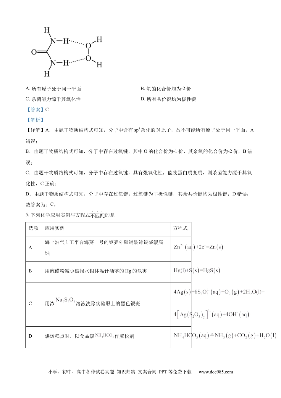 小学、初中、高中各种试卷真题知识归纳文案合同PPT等免费下载www.doc985.com机密★启用前2024年海南省普通高中学业水平选择性考试化学注意事项:1.答卷前,考生务必将自己的姓名、准考证号填写在答题卡上。2.回答选择题时,选出每小题答案后,用铅笔把答题卡上对应题目的答案标号涂黑。如需改动,用橡皮擦干净后,再选涂其他答案标号。回答非选择题时,将答案写在答题|卡上。写在本试卷上无效。3.考试结束后,将本试卷和答题卡一并交回。可能用到的相对原子质量:H-1Li-7ⅳO-16Cl-35.5K-39Mn-55Fe-56Cu-64Zn-65一、选择题:本题共8小题,每小题2分,共16分。在每小题给出的四个选项中,只有一项是符合题目要求的。1.化学为实现社会可持续发展贡献巨大。下列说法错误的是A.以竹代塑,可减少白色污染B.使用人工合成杀虫剂,对环境无影响C.无纸化办公,可减少人工合成油墨的使用D.使用无磷洗涤剂,可减少水体污染【答案】B【解析】【详解】A.利用可降解的竹子替代普通塑料,减少塑料的使用,可防止白色污染,故A正确;B.人工合成杀虫剂具有一定毒性,会对环境造成一定影响,故B错误;C.无纸化办公,减少了打印机中人工合成的油墨使用,故C正确;D.含磷洗涤剂会导致水的富营养化,从而导致赤潮、水华等污染,使用无磷洗涤剂,可减少水体污染,故D正确;故选B。2.下列包装标签上的安全标识与试剂对应正确的是ABCD小学、初中、高中各种试卷真题知识归纳文案合同PPT等免费下载www.doc985.com丁烷葡萄糖浓硫酸氯化钡A.AB.BC.CD.D【答案】A【解析】【详解】A.丁烷易燃,属于易燃气体,故A正确;B.葡萄糖没有腐蚀性,不属于腐蚀类物质,故B错误;C.浓硫酸是硫酸浓度很大的水溶液,不属于加压气体,故C错误;D.氯化钡的性质稳定,没有爆炸性,不属于爆炸类物质,故D错误;故选A。3.高分子物质与我们生活息息相关。下列说法错误的是A.糖原(成分类似于淀粉)可转化为葡萄糖B.聚合物是的加聚物C.畜禽毛羽(主要成分为角蛋白)完全水解可以得到氨基酸D.聚合物的单体是和【答案】D【解析】【详解】A.成分类似于淀粉的糖原一定条件下能发生水解反应最终生成葡萄糖,故A正确,B.乙烯分子中含有碳碳双键,一定条件下能发生加聚反应生成高聚物聚乙烯,故B正确;C.畜禽毛羽的主要成分为角蛋白,一定条件下能完全水解生成氨基酸,故C正确;D.由结构简式可知,聚合物的单体是和HOCH2CH2OH,故D错误;故选D。4.过氧化脲[]是一种常用的消毒剂,可由过氧化氢()和脲加合而成,代表性结构如图所示。下列关于过氧化脲的说法正确的是小学、初中、高中各种试卷真题知识归纳文案合同PPT等免费下载www.doc985.comA.所有原子处于同一平面B.氧的化合价均为-2价C.杀菌能力源于其氧化性D.所有共价键均为极性键【答案】C【解析】【详解】A.由题干物质结构式可知,分子中含有sp3杂化的N原子,故不可能所有原子处于同一平面,A错误;B.由题干物质结构式可知,分子中存在过氧键,其中O的化合价为-1价,其余氧的化合价为-2价,B错误;C.由题干物质结构式可知,分子中存在过氧键,具有强氧化性,能使蛋白质变质,则杀菌能力源于其氧化性,C正确;D.由题干物质结构式可知,分子中存在过氧键,过氧键为非极性键,其余共价键均为极性键,D错误;故答案为:C。5.下列化学应用实例与方程式不匹配的是选项应用实例方程式A海上油气1工平台海葵一号的钢壳外壁铺装锌锭减缓腐蚀B用硫磺粉减少破损水银体温计洒落的Hg的危害C用浓溶液洗除实验服上的黑色银斑D烘焙糕点时,以食品级作膨松剂小学、初中、高中各种试卷真题知识归纳文案合同PPT等免费下载www.doc985.comA.AB.BC.CD.D【答案】A【解析】【详解】A.海上油气1工平台海葵一号的钢壳外壁铺装锌锭能减缓腐蚀是因为金属性强于铁的锌做原电池的负极,锌失去电子发生氧化反应生成锌离子被损耗,电极反应式为,故A错误;B.用硫磺粉减少破损水银体温计洒落的汞的危害是因为硫能与汞反应生成硫化汞,减少汞挥发产生蒸气而污染环境,反应的化学方程式为,故B正确;C.用浓硫代硫酸钠溶液洗除实验服上的黑色银斑是因为银与能与含有硫代硫酸根离子的溶液和氧气反应生成二硫代硫酸...