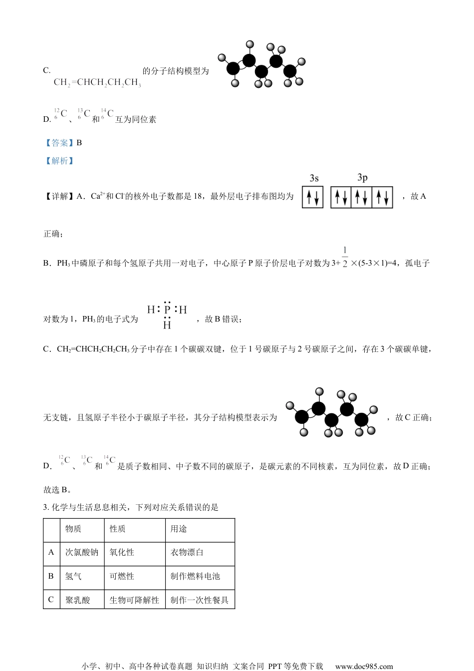 小学、初中、高中各种试卷真题知识归纳文案合同PPT等免费下载www.doc985.com机密★启用前2024年甘肃省普通高校招生统一考试化学注意事项:1.答卷前,考生务必将自己的姓名、准考证号填写在答题卡上。2.回答选择题时,选出每小题答案后,用2B铅笔把答题卡上对应题目的答案标号框涂黑。如需改动,用橡皮擦干净后,再选涂其它答案标号框。回答非选择题时,将答案写在答题卡上。写在本试卷上无效。3.考试结束后,将本试卷和答题卡一并交回。可能用到的相对原子质量:一、选择题:本题共14小题,每小题3分,共42分。在每小题给出的四个选项中,只有一项是符合题目要求的。1.下列成语涉及金属材料的是A.洛阳纸贵B.聚沙成塔C.金戈铁马D.甘之若饴【答案】C【解析】【详解】A.纸的主要成分是纤维素,不是金属材料,A错误;B.沙的主要成分是硅酸盐,不是金属材料,B错误;C.金和铁都是金属,C正确;D.甘之若饴意思是把它看成像糖那样甜,糖类是有机物,不是金属材料,D错误;故选C。2.下列化学用语表述错误的是A.和的最外层电子排布图均为B.和的电子式分别为和小学、初中、高中各种试卷真题知识归纳文案合同PPT等免费下载www.doc985.comC.的分子结构模型为D.、和互为同位素【答案】B【解析】【详解】A.Ca2+和Cl-的核外电子数都是18,最外层电子排布图均为,故A正确;B.PH3中磷原子和每个氢原子共用一对电子,中心原子P原子价层电子对数为3+×(5-3×1)=4,孤电子对数为1,PH3的电子式为,故B错误;C.CH2=CHCH2CH2CH3分子中存在1个碳碳双键,位于1号碳原子与2号碳原子之间,存在3个碳碳单键,无支链,且氢原子半径小于碳原子半径,其分子结构模型表示为,故C正确;D.、和是质子数相同、中子数不同的碳原子,是碳元素的不同核素,互为同位素,故D正确;故选B。3.化学与生活息息相关,下列对应关系错误的是物质性质用途A次氯酸钠氧化性衣物漂白B氢气可燃性制作燃料电池C聚乳酸生物可降解性制作一次性餐具小学、初中、高中各种试卷真题知识归纳文案合同PPT等免费下载www.doc985.comD活性炭吸附性分解室内甲醛A.AB.BC.CD.D【答案】D【解析】【详解】A.次氯酸钠有强氧化性,从而可以做漂白剂,用于衣物漂白,A正确;B.氢气是可燃气体,具有可燃性,能被氧气氧化,可以制作燃料电池,B正确;C.聚乳酸具有生物可降解性,无毒,是高分子化合物,可以制作一次性餐具,C正确;D.活性炭有吸附性,能够有效吸附空气中的有害气体、去除异味,但无法分解甲醛,D错误;故本题选D。4.下列措施能降低化学反应速率的是A.催化氧化氨制备硝酸时加入铂B.中和滴定时,边滴边摇锥形瓶C.锌粉和盐酸反应时加水稀释D.石墨合成金刚石时增大压强【答案】C【解析】【详解】A.催化剂可以改变化学反应速率,一般来说,催化剂可以用来加快化学反应速率,故催化氧化氨制备硝酸时加入铂可以加快化学反应速率,A项不符合题意;B.中和滴定时,边滴边摇锥形瓶,可以让反应物快速接触,可以加快化学反应速率,B项不符合题意;C.锌粉和盐酸反应时加水稀释会降低盐酸的浓度,会降低化学反应速率,C项符合题意;D.石墨合成金刚石,该反应中没有气体参与,增大压强不会改变化学反应速率,D项不符合题意;故选C。5.X、Y、Z、W、Q为短周期元素,原子序数依次增大,最外层电子数之和为18。Y原子核外有两个单电子,Z和Q同族,Z的原子序数是Q的一半,W元素的焰色试验呈黄色。下列说法错误的是A.X、Y组成的化合物有可燃性B.X、Q组成的化合物有还原性C.Z、W组成的化合物能与水反应D.W、Q组成的化合物溶于水呈酸性【答案】D【解析】【分析】X、Y、Z、W、Q为短周期元素,W元素的焰色试验呈黄色,W为Na元素;Z和Q同族,Z的原子序数是Q的一半,则Z为O、Q为S;Y原子核外有两个单电子、且原子序数小于Z,Y为C元素;X、Y、Z、W、Q的最外层电子数之和为18,则X的最外层电子数为18-4-6-1-6=1,X可能为H或Li。小学、初中、高中各种试卷真题知识归纳文案合同PPT等免费下载www.doc985.com【详解】A.若X为H,H与C组成的化合物为烃,烃能够燃烧,若X为Li,Li与C组成的化合物也具有可燃性,A项正确;B.X、Q组成的化合物中Q(即S)元素呈-2价,...