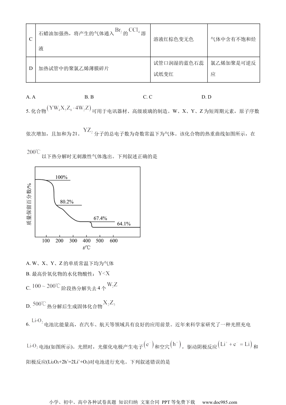 小学、初中、高中各种试卷真题知识归纳文案合同PPT等免费下载www.doc985.com2022年普通高等学校招生全国统一考试(全国乙卷)化学1.生活中处处有化学,下列叙述正确的是A.HB铅笔芯的成分为二氧化铅B.碳酸氢钠可做食品膨松剂C.青铜和黄铜是不同结构的单质铜D.焰火中红色来源于钠盐灼烧2.一种实现二氧化碳固定及再利用的反应如下:下列叙述正确的是A.化合物1分子中的所有原子共平面B.化合物1与乙醇互为同系物C.化合物2分子中含有羟基和酯基D.化合物2可以发生开环聚合反应3.某白色粉末样品,可能含有、、和。取少量样品进行如下实验:①溶于水,得到无色透明溶液②向①的溶液中滴加过量稀盐酸,溶液变浑浊,有刺激性气体逸出。离心分离。③取②的上层清液,向其中滴加溶液有沉淀生成。该样品中确定存在的是A.B.C.D.4.由实验操作和现象,可得出相应正确结论的是实验操作现象结论A向NaBr溶液中滴加过量氯水,再加入淀粉KI溶液先变橙色,后变蓝色氧化性:B向蔗糖溶液中滴加稀硫酸,水浴加热,加入新制的悬浊液无砖红色沉淀蔗糖未发生水解小学、初中、高中各种试卷真题知识归纳文案合同PPT等免费下载www.doc985.comC石蜡油加强热,将产生的气体通入的溶液溶液红棕色变无色气体中含有不饱和烃D加热试管中的聚氯乙烯薄膜碎片试管口润湿的蓝色石蕊试纸变红氯乙烯加聚是可逆反应A.AB.BC.CD.D5.化合物可用于电讯器材、高级玻璃的制造。W、X、Y、Z为短周期元素,原子序数依次增加,且加和为21。分子的总电子数为奇数常温下为气体。该化合物的热重曲线如图所示,在以下热分解时无刺激性气体逸出。下列叙述正确的是A.W、X、Y、Z的单质常温下均为气体B.最高价氧化物的水化物酸性:C.阶段热分解失去4个D.热分解后生成固体化合物6.电池比能量高,在汽车、航天等领域具有良好的应用前景。近年来科学家研究了一种光照充电电池(如图所示)。光照时,光催化电极产生电子和空穴,驱动阴极反应和阳极反应(Li2O2+2h+=2Li++O2)对电池进行充电。下列叙述错误的是小学、初中、高中各种试卷真题知识归纳文案合同PPT等免费下载www.doc985.comA.充电时,电池的总反应B.充电效率与光照产生的电子和空穴量有关C.放电时,Li+从正极穿过离子交换膜向负极迁移D.放电时,正极发生反应7.常温下,一元酸的。在某体系中,与离子不能穿过隔膜,未电离的可自由穿过该膜(如图所示)。设溶液中,当达到平衡时,下列叙述正确的是A.溶液Ⅰ中B.溶液Ⅱ中的HA的电离度为C.溶液Ⅰ和Ⅱ中的不相等D.溶液Ⅰ和Ⅱ中的之比为小学、初中、高中各种试卷真题知识归纳文案合同PPT等免费下载www.doc985.com8.废旧铅蓄电池的铅膏中主要含有、、和Pb。还有少量Ba、Fe、Al的盐或氧化物等。为了保护环境、充分利用铅资源,通过下图流程实现铅的回收。一些难溶电解质的溶度积常数如下表:难溶电解质一定条件下,一些金属氢氧化物沉淀时的如下表:金属氢氧化物开始沉淀的pH2.36.83.57.2完全沉淀的pH3.28.34.69.1回答下列问题:(1)在“脱硫”中转化反应的离子方程式为________,用沉淀溶解平衡原理解释选择的原因________。(2)在“脱硫”中,加入不能使铅膏中完全转化,原因是________。(3)在“酸浸”中,除加入醋酸(),还要加入。(ⅰ)能被氧化的离子是________;(ⅱ)促进了金属Pb在醋酸中转化为,其化学方程式为________;(ⅲ)也能使转化为,的作用是________。小学、初中、高中各种试卷真题知识归纳文案合同PPT等免费下载www.doc985.com(4)“酸浸”后溶液的pH约为4.9,滤渣的主要成分是________。(5)“沉铅”的滤液中,金属离子有________。9.二草酸合铜(Ⅱ)酸钾()可用于无机合成、功能材料制备。实验室制备二草酸合铜(Ⅱ)酸钾可采用如下步骤:Ⅰ.取已知浓度的溶液,搅拌下滴加足量溶液,产生浅蓝色沉淀。加热,沉淀转变成黑色,过滤。Ⅱ.向草酸()溶液中加入适量固体,制得和混合溶液。Ⅲ.将Ⅱ的混合溶液加热至80-85℃,加入Ⅰ中的黑色沉淀。全部溶解后,趁热过滤。Ⅳ.将Ⅲ的滤液用蒸汽浴加热浓缩,经一系列操作后,干燥,得到二草酸合铜(Ⅱ)酸钾晶体,进行表征和分析。回答下列问题:(1)由配制Ⅰ中的溶液,下列仪器中不需要的是________(填仪...