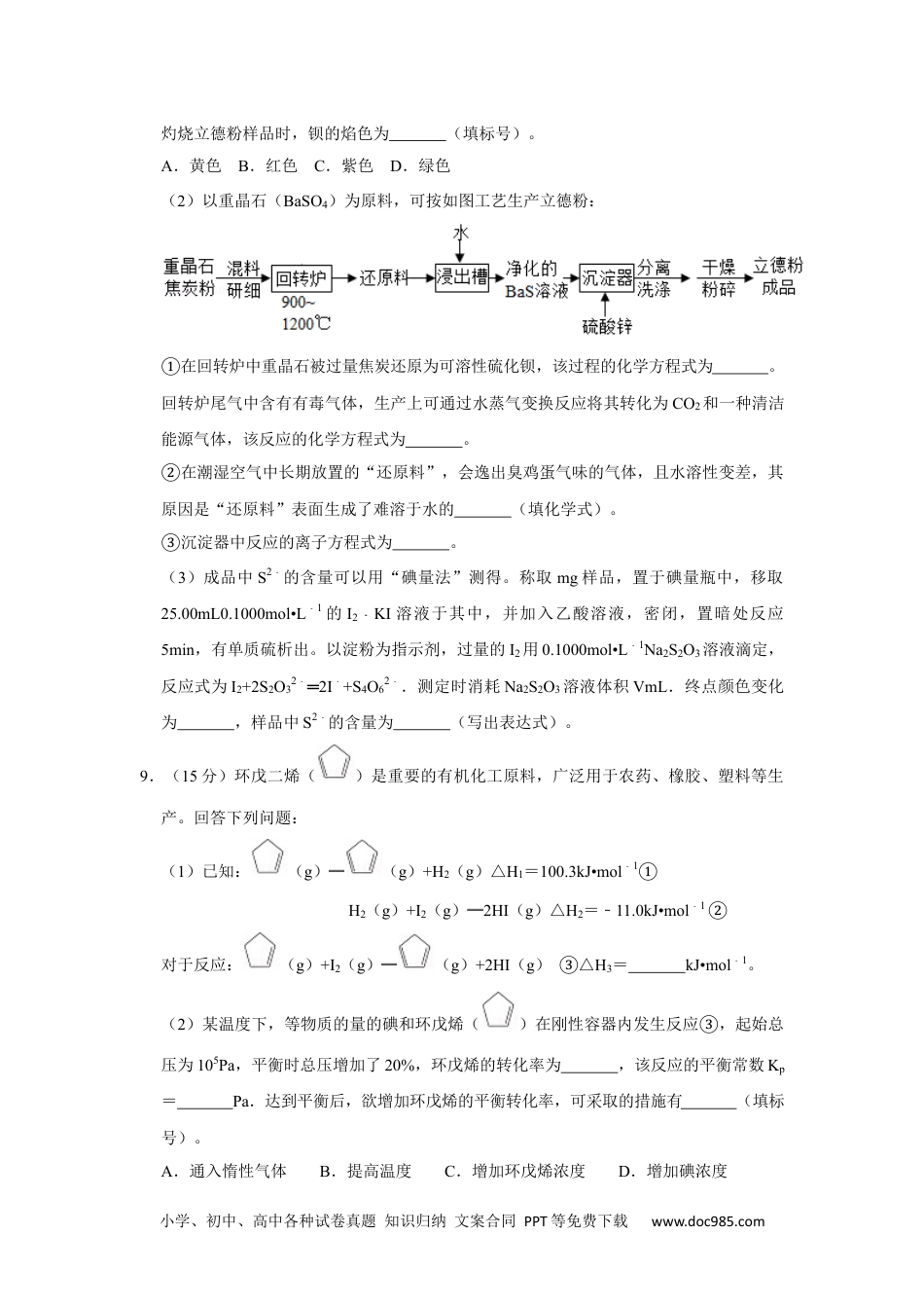 小学、初中、高中各种试卷真题知识归纳文案合同PPT等免费下载www.doc985.com2019年全国统一高考化学试卷(新课标Ⅱ)一、选择题:共7小题,每小题6分,满分42分。在每小题给出的四个选项中,只有一项是符合题目要求的。1.(6分)“春蚕到死丝方尽,蜡炬成灰泪始干”是唐代诗人李商隐的著名诗句。下列关于该诗句中所涉及物质的说法错误的是()A.蚕丝的主要成分是蛋白质B.蚕丝属于天然高分子材料C.“蜡炬成灰”过程中发生了氧化反应D.古代的蜡是高级脂肪酸脂,属于高分子聚合物2.(6分)已知NA是阿伏加德罗常数的值,下列说法错误的是()A.3g3He含有的中子数为1NAB.1L0.1mol•L1﹣磷酸钠溶液含有的PO43﹣数目为0.1NAC.1molK2Cr2O7被还原为Cr3+转移的电子数为6NAD.48g正丁烷和10g异丁烷的混合物中共价键数目为13NA3.(6分)今年是门捷列夫发现元素周期律150周年。下表是元素周期表的一部分,W、X、Y、Z为短周期主族元素,W与X的最高化合价之和为8.下列说法错误的是()WXYZA.原子半径:W<XB.常温常压下,Y单质为固态C.气态氢化物热稳定性:Z<WD.X的最高价氧化物的水化物是强碱4.(6分)下列实验现象与实验操作不相匹配的是()实验操作实验现象A向盛有高锰酸钾酸性溶液的试管中通入足量的乙烯后静置溶液的紫色逐渐褪去,静置后溶液分层B将镁条点燃后迅速伸入集满CO2的集气瓶集气瓶中产生浓烟并有黑色颗粒产生C向盛有饱和硫代硫酸钠溶液的试管中滴加有刺激性气味气体产生,溶液变浑浊小学、初中、高中各种试卷真题知识归纳文案合同PPT等免费下载www.doc985.com稀盐酸D向盛有FeCl3溶液的试管中加过量铁粉,充分振荡后加1滴KSCN溶液黄色逐渐消失,加KSCN后溶液颜色不变A.AB.BC.CD.D5.(6分)下列化学方程式中,不能正确表达反应颜色变化的是()A.向CuSO4溶液中加入足量Zn粉,溶液蓝色消失Zn+CuSO4═Cu+ZnSO4B.澄清的石灰水久置后出现白色固体Ca(OH)2+CO2═CaCO3↓+H2OC.Na2O2在空气中放置后由淡黄色变为白色2Na2O2═2Na2O+O2↑D.向Mg(OH)2悬浊液中滴加足量FeCl3溶液出现红褐色沉淀3Mg(OH)2+2FeCl3═2Fe(OH)3+3MgCl26.(6分)绚丽多彩的无机颜料的应用曾创造了古代绘画和彩陶的辉煌。硫化镉(CdS)是一种难溶于水的黄色颜料,其在水中的沉淀溶解平衡曲线如图所示。下列说法错误的是()A.图中a和b分别为T1、T2温度下CdS在水中的溶解度B.图中各点对应的Ksp的关系为:Ksp(m)=Ksp(n)<Ksp(p)<Ksp(q)C.向m点的溶液中加入少量Na2S固体,溶液组成由m沿mpn线向p方向移动D.温度降低时,q点的饱和溶液的组成由q沿qp线向p方向移动7.(6分)分子式为C4H8BrCl的有机物共有(不含立体异构)()A.8种B.10种C.12种D.14种二、非选择题:共43分。第8~10题为必考题,每个试题考生都必须作答。第11~12为选考题,考生根据要求作答。(一)必考题:8.(13分)立德粉ZnS•BaSO4(也称锌钡白),是一种常用白色颜料。回答下列问题:(1)利用焰色反应的原理既可制作五彩缤纷的节日烟花,亦可定性鉴别某些金属盐。小学、初中、高中各种试卷真题知识归纳文案合同PPT等免费下载www.doc985.com灼烧立德粉样品时,钡的焰色为(填标号)。A.黄色B.红色C.紫色D.绿色(2)以重晶石(BaSO4)为原料,可按如图工艺生产立德粉:①在回转炉中重晶石被过量焦炭还原为可溶性硫化钡,该过程的化学方程式为。回转炉尾气中含有有毒气体,生产上可通过水蒸气变换反应将其转化为CO2和一种清洁能源气体,该反应的化学方程式为。②在潮湿空气中长期放置的“还原料”,会逸出臭鸡蛋气味的气体,且水溶性变差,其原因是“还原料”表面生成了难溶于水的(填化学式)。③沉淀器中反应的离子方程式为。(3)成品中S2﹣的含量可以用“碘量法”测得。称取mg样品,置于碘量瓶中,移取25.00mL0.1000mol•L1﹣的I2KI﹣溶液于其中,并加入乙酸溶液,密闭,置暗处反应5min,有单质硫析出。以淀粉为指示剂,过量的I2用0.1000mol•L1﹣Na2S2O3溶液滴定,反应式为I2+2S2O32﹣═2I﹣+S4O62﹣.测定时消耗Na2S2O3溶液体积VmL.终点颜色变化为,样品中S2﹣的含量为(写出表达式)。9....