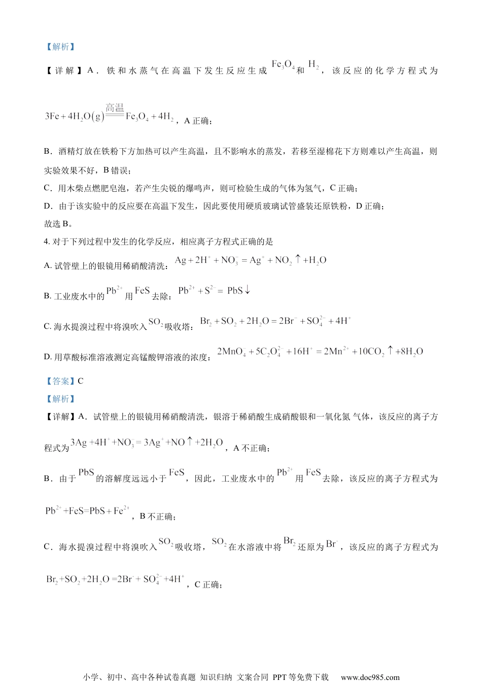 小学、初中、高中各种试卷真题知识归纳文案合同PPT等免费下载www.doc985.com卷12024年普通高等学校招生全国统一考试(全国新课标卷)化学本试卷满分100分,建议用时50分钟。刷卷提示:本卷为新教材老高考理综试卷,题号遵循原卷,化学题目已全部提供。本卷题目均符合新高考考查要求。可能用到的相对原子质量:H—1C—12N—14O—16一、选择题:本题共7小题,每小题6分,共42分。在每小题给出的4个选项中,只有一项是符合题目要求的。1.文房四宝是中华传统文化的瑰宝。下列有关叙述错误的是A.羊毛可用于制毛笔,主要成分为蛋白质B.松木可用于制墨,墨的主要成分是单质碳C.竹子可用于造纸,纸的主要成分是纤维素D.大理石可用于制砚台,主要成分为硅酸盐【答案】D【解析】【详解】A.动物的毛、皮、角等的主要成分都是蛋白质,羊毛的主要成分为蛋白质,A正确;B.墨的主要成分是炭黑,炭黑是碳元素的一种单质,碳的单质在常温下的化学性质很稳定,不易与其他物质发生化学反应,故用墨汁书写的字画历经千年仍不褪色,B正确;C.竹子可用于造纸,竹子的主要成分是纤维素,用其造的纸的主要成分也是纤维素,C正确;D.大理石可用于制砚台,大理石主要成分为碳酸钙,不是硅酸盐,D错误;故选D。2.一种点击化学方法合成聚硫酸酯(W)的路线如下所示:下列说法正确的是A.双酚A是苯酚的同系物,可与甲醛发生聚合反应小学、初中、高中各种试卷真题知识归纳文案合同PPT等免费下载www.doc985.comB.催化聚合也可生成WC.生成W的反应③为缩聚反应,同时生成D.在碱性条件下,W比聚苯乙烯更难降解【答案】B【解析】【详解】A.同系物之间的官能团的种类与数目均相同,双酚A有2个羟基,故其不是苯酚的同系物,A不正确;B.题干中两种有机物之间通过缩聚反应生成W,根据题干中的反应机理可知,也可以通过缩聚反应生成W,B正确;C.生成W的反应③为缩聚反应,同时生成,C不正确;D.W为聚硫酸酯,酯类物质在碱性条件下可以发生水解反应,因此,在碱性条件下,W比聚苯乙烯易降解,D不正确;综上所述,本题选B。3.实验室中利用下图装置验证铁与水蒸气反应。下列说法错误的是A.反应为B.酒精灯移至湿棉花下方实验效果更好C.用木柴点燃肥皂泡检验生成的氢气D.使用硬质玻璃试管盛装还原铁粉【答案】B小学、初中、高中各种试卷真题知识归纳文案合同PPT等免费下载www.doc985.com【解析】【详解】A.铁和水蒸气在高温下发生反应生成和,该反应的化学方程式为,A正确;B.酒精灯放在铁粉下方加热可以产生高温,且不影响水的蒸发,若移至湿棉花下方则难以产生高温,则实验效果不好,B错误;C.用木柴点燃肥皂泡,若产生尖锐的爆鸣声,则可检验生成的气体为氢气,C正确;D.由于该实验中的反应要在高温下发生,因此要使用硬质玻璃试管盛装还原铁粉,D正确;故选B。4.对于下列过程中发生的化学反应,相应离子方程式正确的是A.试管壁上的银镜用稀硝酸清洗:B.工业废水中的用去除:C.海水提溴过程中将溴吹入吸收塔:D.用草酸标准溶液测定高锰酸钾溶液的浓度:【答案】C【解析】【详解】A.试管壁上的银镜用稀硝酸清洗,银溶于稀硝酸生成硝酸银和一氧化氮气体,该反应的离子方程式为,A不正确;B.由于的溶解度远远小于,因此,工业废水中的用去除,该反应的离子方程式为,B不正确;C.海水提溴过程中将溴吹入吸收塔,在水溶液中将还原为,该反应的离子方程式为,C正确;小学、初中、高中各种试卷真题知识归纳文案合同PPT等免费下载www.doc985.comD.用草酸标准溶液测定高锰酸钾溶液的浓度,被氧化为,属于弱酸,该反应的离子方程式为,D不正确;综上所述,本题选C。5.我国科学家最近研究的一种无机盐纳米药物具有高效的细胞内亚铁离子捕获和抗氧化能力。W、X、Y、Z的原子序数依次增加,且W、X、Y属于不同族的短周期元素。W的外层电子数是其内层电子数的2倍,X和Y的第一电离能都比左右相邻元素的高。Z的M层未成对电子数为4。下列叙述错误的是A.W、X、Y、Z四种元素的单质中Z的熔点最高B.在X的简单氢化物中X原子轨道杂化类型为C.Y的氢氧化物难溶于NaCl溶液,可以溶于溶液D.中提供电子对与形成配位键【答案】A【解析】【分析】W...