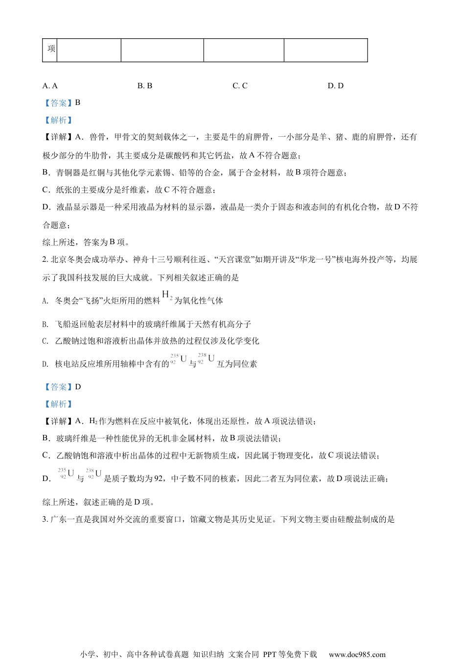小学、初中、高中各种试卷真题知识归纳文案合同PPT等免费下载www.doc985.com2022年广东省普通高中学业水平选择性考试化学本试卷共8页,21小题,满分100分,考试用时75分钟。注意事项:1.答卷前,考生务必用黑色字迹钢笔或签字笔将自己的姓名、考生号、考场号和座位号填写在答题卡上。用2B铅笔将试卷类型(A)填涂在答题卡相应位置上。将条形码横贴在答题卡右上角“条形码粘贴处”。2.作答选择题时,选出每小题答案后,用2B铅笔把答题卡上对应题目选项的答案信息点涂黑;如需改动,用橡皮擦干净后,再选涂其他答案,答案不能答在试卷上。3.非选择题必须用黑色字迹钢笔或签字笔作答,答案必须写在答题卡各题目指定区域内相应位置上;如需改动,先划掉原来的答案,然后再写上新的答案;不准使用铅笔和涂改液。不按以上要求作答的答案无效。4.作答选考题时,请先用2B铅笔填涂选做题的题号对应的信息点,再作答。漏涂、错涂、多涂的,答案无效。5.考生必须保持答题卡的整洁。考试结束后,将试卷和答题卡一并交回。可能用到的相对原子质量:H1C12N14O16Na23Mg24S32Cl35.5Fe56一、选择题:本题共16小题,共44分。第1~10小题,每小题2分;第11~16小题,每小题4分。在每小题给出的四个选项中,只有一项是符合题目要求的。1.中华文明源远流长,在世界文明中独树一帜,汉字居功至伟。随着时代发展,汉字被不断赋予新的文化内涵,其载体也发生相应变化。下列汉字载体主要由合金材料制成的是汉字载体选A.兽骨B.青铜器C.纸张D.液晶显示屏小学、初中、高中各种试卷真题知识归纳文案合同PPT等免费下载www.doc985.com项A.AB.BC.CD.D【答案】B【解析】【详解】A.兽骨,甲骨文的契刻载体之一,主要是牛的肩胛骨,一小部分是羊、猪、鹿的肩胛骨,还有极少部分的牛肋骨,其主要成分是碳酸钙和其它钙盐,故A不符合题意;B.青铜器是红铜与其他化学元素锡、铅等的合金,属于合金材料,故B项符合题意;C.纸张的主要成分是纤维素,故C不符合题意;D.液晶显示器是一种采用液晶为材料的显示器,液晶是一类介于固态和液态间的有机化合物,故D不符合题意;综上所述,答案为B项。2.北京冬奥会成功举办、神舟十三号顺利往返、“天宫课堂”如期开讲及“华龙一号”核电海外投产等,均展示了我国科技发展的巨大成就。下列相关叙述正确的是A.冬奥会“飞扬”火炬所用的燃料为氧化性气体B.飞船返回舱表层材料中的玻璃纤维属于天然有机高分子C.乙酸钠过饱和溶液析出晶体并放热的过程仅涉及化学变化D.核电站反应堆所用轴棒中含有的与互为同位素【答案】D【解析】【详解】A.H2作为燃料在反应中被氧化,体现出还原性,故A项说法错误;B.玻璃纤维是一种性能优异的无机非金属材料,故B项说法错误;C.乙酸钠饱和溶液中析出晶体的过程中无新物质生成,因此属于物理变化,故C项说法错误;D.与是质子数均为92,中子数不同的核素,因此二者互为同位素,故D项说法正确;综上所述,叙述正确的是D项。3.广东一直是我国对外交流的重要窗口,馆藏文物是其历史见证。下列文物主要由硅酸盐制成的是小学、初中、高中各种试卷真题知识归纳文案合同PPT等免费下载www.doc985.com文物选项A.南宋鎏金饰品B.蒜头纹银盒C.广彩瓷咖啡杯D.铜镀金钟座A.AB.BC.CD.D【答案】C【解析】【详解】A.鎏金饰品是用金汞合金制成的金泥涂饰器物的表面,经过烘烤,汞蒸发而金固结于器物上的一种传统工艺,其中不含硅酸盐,故A项不符合题意;B.蒜头纹银盒中主要成分为金属银,其中不含硅酸盐,故B项不符合题意;C.广彩瓷咖啡杯是由黏土等硅酸盐产品烧制而成,其主要成分为硅酸盐,故C项符合题意;D.铜镀金钟座是铜和金等制得而成,其中不含硅酸盐,故D项不符合题意;综上所述,答案为C。4.实验室进行粗盐提纯时,需除去和,所用试剂包括以及A.B.C.D.【答案】A【解析】【分析】除杂过程中不能引入新杂质,同时为保证除杂完全,所加除杂试剂一般过量,然后选择合适的试剂将所加过量的物质除去。【详解】粗盐中主要成分为NaCl。除去Ca2+选用将其转化为沉淀,为了不引入新杂质,所加物质的小学、初中、高中各种试卷真题知识归纳文案合同PPT等免费下载www.doc98...