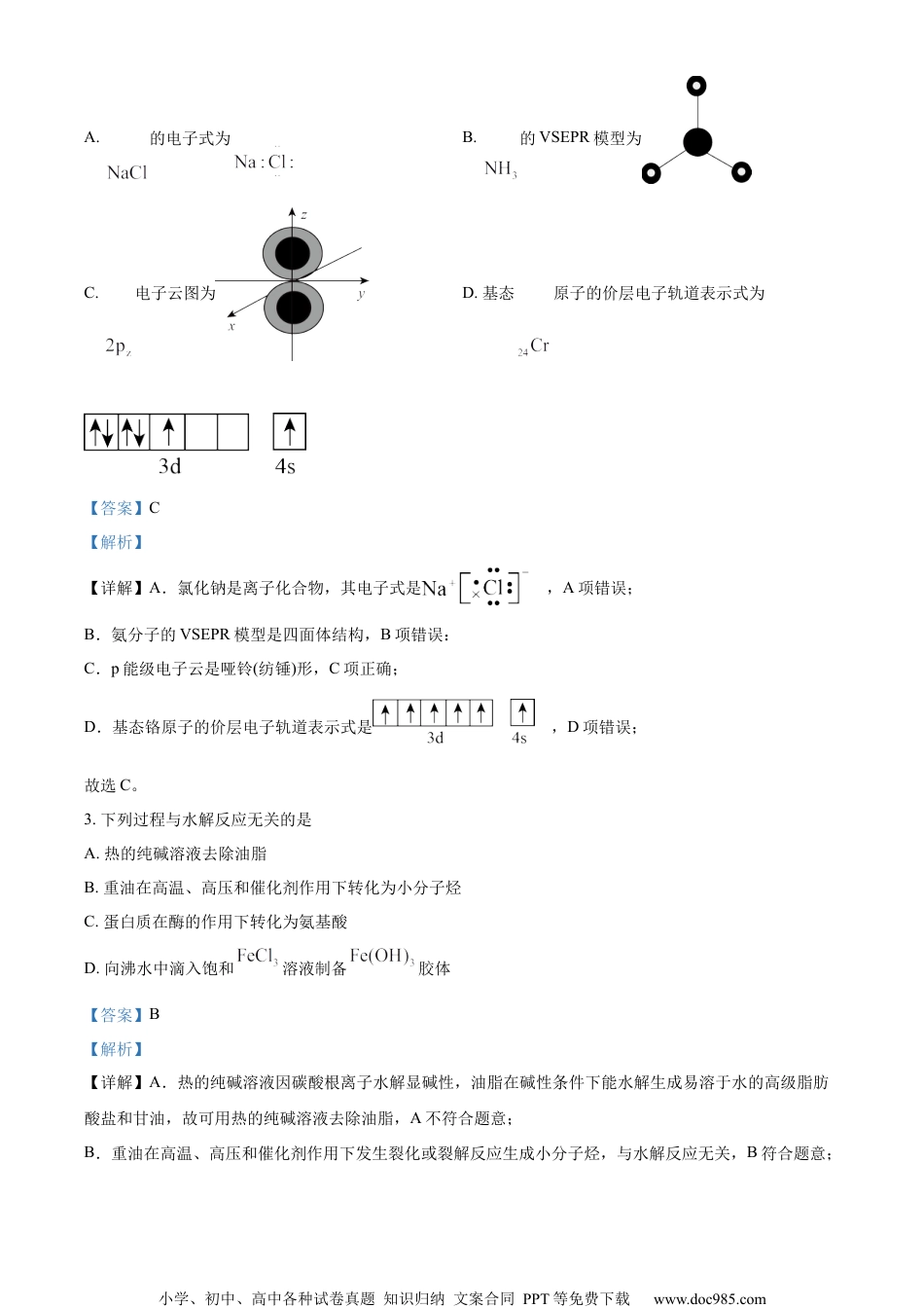 小学、初中、高中各种试卷真题知识归纳文案合同PPT等免费下载www.doc985.com2023年普通高中学业水平等级性考试(北京卷)化学可能用到的相对原子质量:H-1C-12N-14O-16Mg-24S-32第一部分本部分共14小题,每题3分,共42分。在每题列出的四个选项中,选出最符合题目要求的一项。1.中国科学家首次成功制得大面积单晶石墨炔,是碳材料科学的一大进步。下列关于金刚石、石墨、石墨炔的说法正确的是A.三种物质中均有碳碳原子间的键B.三种物质中的碳原子都是杂化C.三种物质的晶体类型相同D.三种物质均能导电【答案】A【解析】【详解】A.原子间优先形成键,三种物质中均存在键,A项正确;B.金刚石中所有碳原子均采用杂化,石墨中所有碳原子均采用杂化,石墨炔中苯环上的碳原子采用杂化,碳碳三键上的碳原子采用杂化,B项错误;C.金刚石为共价晶体,石墨炔为分子晶体,石墨为混合晶体,C项错误;D.金刚石中没有自由移动电子,不能导电,D项错误;故选A。2.下列化学用语或图示表达正确的是小学、初中、高中各种试卷真题知识归纳文案合同PPT等免费下载www.doc985.comA.的电子式为B.的VSEPR模型为C.电子云图为D.基态原子的价层电子轨道表示式为【答案】C【解析】【详解】A.氯化钠是离子化合物,其电子式是,A项错误;B.氨分子的VSEPR模型是四面体结构,B项错误:C.p能级电子云是哑铃(纺锤)形,C项正确;D.基态铬原子的价层电子轨道表示式是,D项错误;故选C。3.下列过程与水解反应无关的是A.热的纯碱溶液去除油脂B.重油在高温、高压和催化剂作用下转化为小分子烃C.蛋白质在酶的作用下转化为氨基酸D.向沸水中滴入饱和溶液制备胶体【答案】B【解析】【详解】A.热的纯碱溶液因碳酸根离子水解显碱性,油脂在碱性条件下能水解生成易溶于水的高级脂肪酸盐和甘油,故可用热的纯碱溶液去除油脂,A不符合题意;B.重油在高温、高压和催化剂作用下发生裂化或裂解反应生成小分子烃,与水解反应无关,B符合题意;小学、初中、高中各种试卷真题知识归纳文案合同PPT等免费下载www.doc985.comC.蛋白质在酶的作用下可以发生水解反应生成氨基酸,C不符合题意;D.Fe3+能发生水解反应生成Fe(OH)3,加热能增大Fe3+的水解程度,D不符合题意;故选B。4.下列事实能用平衡移动原理解释的是A.溶液中加入少量固体,促进分解B.密闭烧瓶内的和的混合气体,受热后颜色加深C.铁钉放入浓中,待不再变化后,加热能产生大量红棕色气体D.锌片与稀反应过程中,加入少量固体,促进的产生【答案】B【解析】【详解】A.MnO2会催化H2O2分解,与平衡移动无关,A项错误;B.NO2转化为N2O4的反应是放热反应,升温平衡逆向移动,NO2浓度增大,混合气体颜色加深,B项正确;C.铁在浓硝酸中钝化,加热会使表面的氧化膜溶解,铁与浓硝酸反应生成大量红棕色气体,与平衡移动无关,C项错误;D.加入硫酸铜以后,锌置换出铜,构成原电池,从而使反应速率加快,与平衡移动无关,D项错误;故选B。5.回收利用工业废气中的和,实验原理示意图如下。下列说法不正确的是A.废气中排放到大气中会形成酸雨小学、初中、高中各种试卷真题知识归纳文案合同PPT等免费下载www.doc985.comB.装置a中溶液显碱性的原因是的水解程度大于的电离程度C.装置a中溶液的作用是吸收废气中的和D.装置中的总反应为【答案】C【解析】【详解】A.是酸性氧化物,废气中排放到空气中会形成硫酸型酸雨,故A正确;B.装置a中溶液的溶质为,溶液显碱性,说明的水解程度大于电离程度,故B正确;C.装置a中溶液的作用是吸收气体,与溶液不反应,不能吸收,故C错误;D.由电解池阴极和阳极反应式可知,装置b中总反应为,故D正确;选C。6.下列离子方程式与所给事实不相符的是A.制备84消毒液(主要成分是):B.食醋去除水垢中的:C.利用覆铜板制作印刷电路板:D.去除废水中的:【答案】B【解析】【详解】A.Cl2和NaOH溶液反应产生NaCl、NaClO、H2O,除了Cl2和H2O不能拆写其余均可拆写为离子,A项正确;B.食醋为弱酸不能拆写为离子,反应为2CH3COOH+CaCO3=Ca2++2CH3COO-+CO2+H2O,B项错误;C.FeCl3将Cu氧化为CuCl2而自身被还原为FeCl2,反应为2Fe3++Cu=2Fe2++Cu2+,C项正确;小学、...