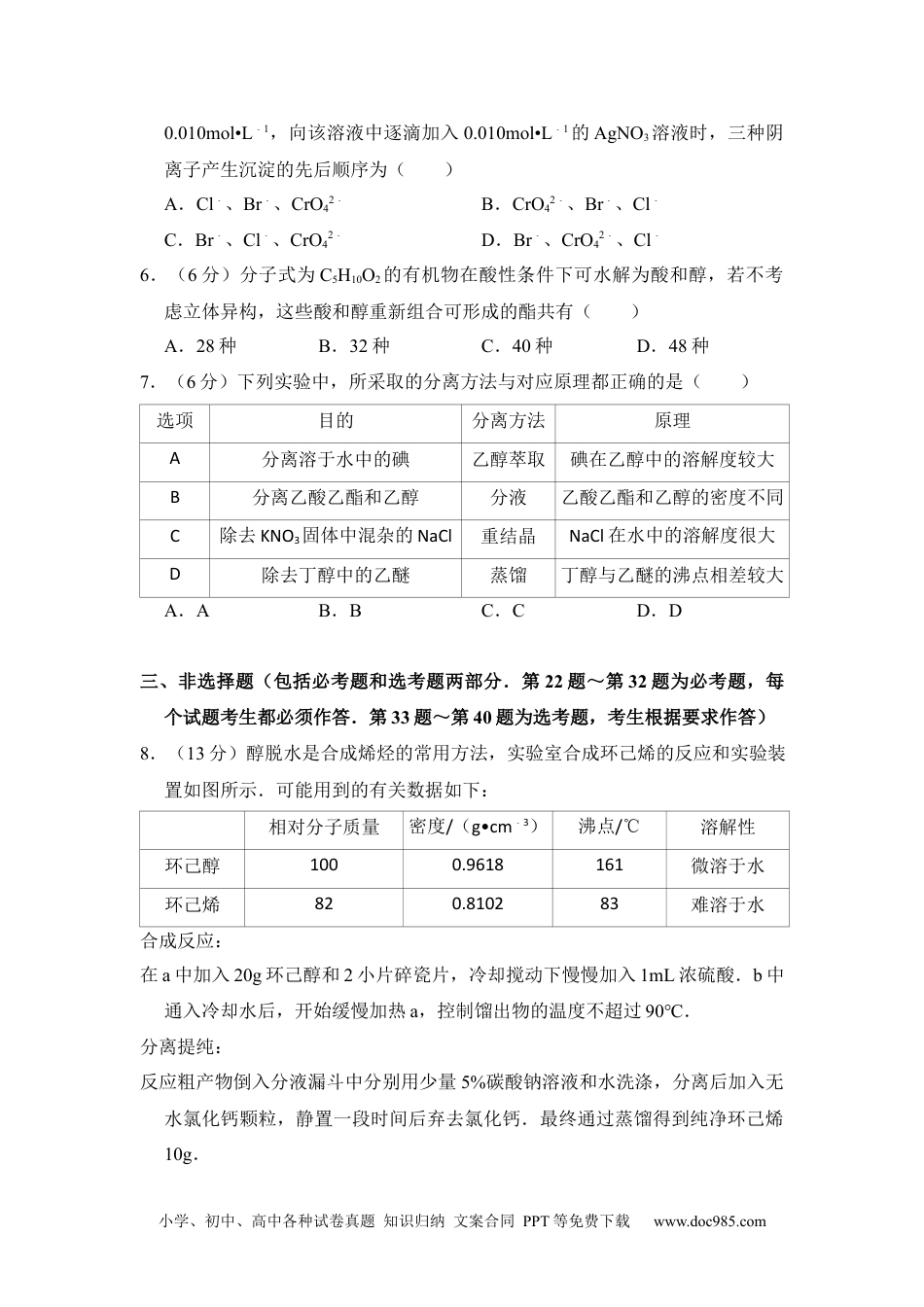 小学、初中、高中各种试卷真题知识归纳文案合同PPT等免费下载www.doc985.com2013年全国统一高考化学试卷(新课标Ⅰ)一、选择题1.(6分)化学无处不在,与化学有关的说法不正确的是()A.侯氏制碱法的工艺过程中应用了物质溶解度的差异B.可用蘸浓盐酸的棉棒检验输送氨气的管道是否漏气C.碘是人体必需微量元素,所以要多吃富含高碘酸的食物D.黑火药由硫磺、硝石、木炭三种物质按一定比例混合制成2.(6分)香叶醇是合成玫瑰香油的主要原料,其结构简式如图所示:下列有关香叶醇的叙述正确的是()A.香叶醇的分子式为C10H18OB.不能使溴的四氯化碳溶液褪色C.不能使酸性高锰酸钾溶液褪色D.能发生加成反应不能发生取代反应3.(6分)短周期元素W、X、Y、Z的原子序数依次增大,其简单离子都能破坏水的电离平衡的是()A.W2﹣、X+B.X+、Y3+C.Y3+、Z2﹣D.X+、Z2﹣4.(6分)银制器皿日久表面会逐渐变黑,这是生成了Ag2S的缘故.根据电化学原理可进行如下处理:在铝质容器中加入食盐溶液,再将变黑的银器浸入该溶液中,一段时间后发现黑色会褪去.下列说法正确的是()A.处理过程中银器一直保持恒重B.银器为正极,Ag2S被还原生成单质银C.该过程中总反应为2Al+3Ag2S═6Ag+Al2S3D.黑色褪去的原因是黑色Ag2S转化为白色AgCl5.(6分)已知Ksp(AgCl)=1.56×1010﹣,Ksp(AgBr)=7.7×1013﹣,Ksp(Ag2CrO4)=9.0×1012﹣.某溶液中含有Cl﹣、Br﹣和CrO42﹣浓度均为小学、初中、高中各种试卷真题知识归纳文案合同PPT等免费下载www.doc985.com0.010mol•L1﹣,向该溶液中逐滴加入0.010mol•L1﹣的AgNO3溶液时,三种阴离子产生沉淀的先后顺序为()A.Cl﹣、Br﹣、CrO42﹣B.CrO42﹣、Br﹣、Cl﹣C.Br﹣、Cl﹣、CrO42﹣D.Br﹣、CrO42﹣、Cl﹣6.(6分)分子式为C5H10O2的有机物在酸性条件下可水解为酸和醇,若不考虑立体异构,这些酸和醇重新组合可形成的酯共有()A.28种B.32种C.40种D.48种7.(6分)下列实验中,所采取的分离方法与对应原理都正确的是()选项目的分离方法原理A分离溶于水中的碘乙醇萃取碘在乙醇中的溶解度较大B分离乙酸乙酯和乙醇分液乙酸乙酯和乙醇的密度不同C除去KNO3固体中混杂的NaCl重结晶NaCl在水中的溶解度很大D除去丁醇中的乙醚蒸馏丁醇与乙醚的沸点相差较大A.AB.BC.CD.D三、非选择题(包括必考题和选考题两部分.第22题~第32题为必考题,每个试题考生都必须作答.第33题~第40题为选考题,考生根据要求作答)8.(13分)醇脱水是合成烯烃的常用方法,实验室合成环己烯的反应和实验装置如图所示.可能用到的有关数据如下:相对分子质量密度/(g•cm3﹣)沸点/℃溶解性环己醇1000.9618161微溶于水环己烯820.810283难溶于水合成反应:在a中加入20g环己醇和2小片碎瓷片,冷却搅动下慢慢加入1mL浓硫酸.b中通入冷却水后,开始缓慢加热a,控制馏出物的温度不超过90℃.分离提纯:反应粗产物倒入分液漏斗中分别用少量5%碳酸钠溶液和水洗涤,分离后加入无水氯化钙颗粒,静置一段时间后弃去氯化钙.最终通过蒸馏得到纯净环己烯10g.小学、初中、高中各种试卷真题知识归纳文案合同PPT等免费下载www.doc985.com回答下列问题:(1)装置b的名称是.(2)加入碎瓷片的作用是;如果加热一段时间后发现忘记加瓷片,应该采取的正确操作是(填正确答案标号).A.立即补加B.冷却后补加C.不需补加D.重新配料(3)本实验中最容易产生的副产物的结构简式为.(4)分液漏斗在使用前须清洗干净并;在本实验分离过程中,产物应该从分液漏斗的(填“上口倒出”或“下口放出”).(5)分离提纯过程中加入无水氯化钙的目的是.(6)在环己烯粗产物蒸馏过程中,不可能用到的仪器有(填正确答案标号).A.蒸馏烧瓶B.温度计C.吸滤瓶D.球形冷凝管E.接收器(7)本实验所得到的环己烯产率是(填正确答案标号).A.41%B.50%C.61%D.70%9.(15分)锂离子电池的应用很广,其正极材料可再生利用.某锂离子电池正极材料有钴酸锂(LiCoO2)、导电剂乙炔黑和铝箔等.充电时,该锂离子电池阴极发生的反应为6C+xLi++xe﹣═LixC6.现欲利用以下工艺流程回收正极材料中的某些...