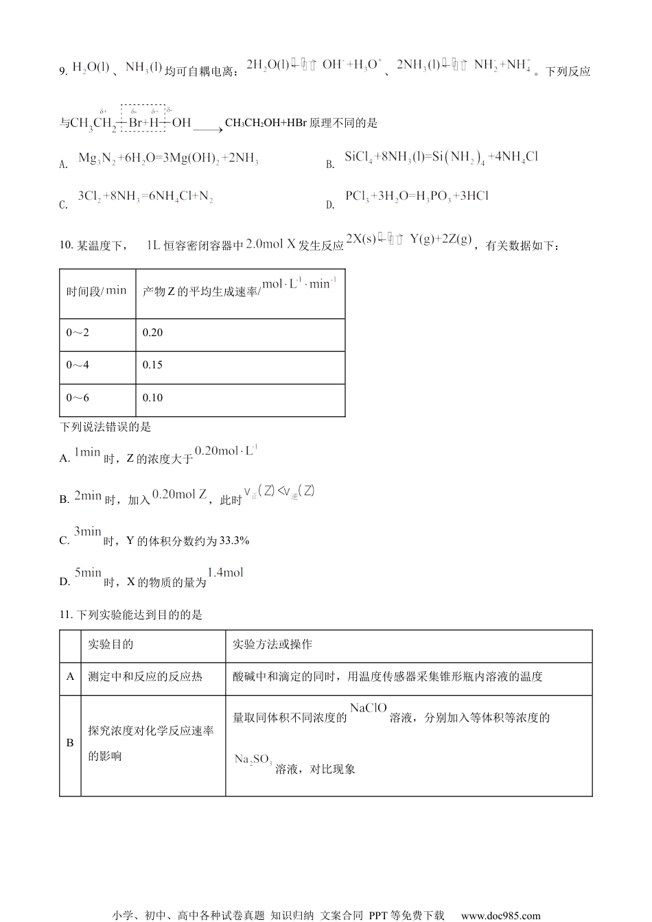 小学、初中、高中各种试卷真题知识归纳文案合同PPT等免费下载www.doc985.com2022年辽宁省普通高等学校招生选择性考试化学本试卷满分100分,考试时间75分钟。可能用到的相对原子质量:H-1B-11C-12N-14O-16Na-23S-32Fe-56一、选择题:本题共15小题,每小题3分,共45分。在每小题给出的四个选项中,只有一项符合题目要求。1.北京冬奥会备受世界瞩目。下列说法错误的是A.冰壶主材料花岗岩属于无机非金属材料B.火炬“飞扬”使用的碳纤维属于有机高分子材料C.冬奥会“同心”金属奖牌属于合金材料D.短道速滑服使用的超高分子量聚乙烯属于有机高分子材料2.下列符号表征或说法正确的是A.电离:B.位于元素周期表p区C.空间结构:平面三角形D.电子式:3.设为阿伏加德罗常数的值。下列说法正确的是A.中含有的中子数为B.分子中含有的键数目为C.标准状况下,气体中数目为D.的溶液中数目为4.下列关于苯乙炔()的说法正确的是A.不能使酸性溶液褪色B.分子中最多有5个原子共直线C.能发生加成反应和取代反应D.可溶于水5.短周期元素X、Y、Z、W、Q原子序数依次增大。基态X、Z、Q原子均有两个单电子,W简单离子在小学、初中、高中各种试卷真题知识归纳文案合同PPT等免费下载www.doc985.com同周期离子中半径最小,Q与Z同主族。下列说法错误的是A.X能与多种元素形成共价键B.简单氢化物沸点:C.第一电离能:D.电负性:6.镀锌铁钉放入棕色的碘水中,溶液褪色;取出铁钉后加入少量漂白粉,溶液恢复棕色;加入,振荡,静置,液体分层。下列说法正确的是A.褪色原因为被还原B.液体分层后,上层呈紫红色C.镀锌铁钉比镀锡铁钉更易生锈D.溶液恢复棕色的原因为被氧化7.下列类比或推理合理的是已知方法结论A沸点:类比沸点:B酸性:类比酸性:C金属性:推理氧化性:D:推理溶解度:A.AB.BC.CD.D8.理论化学模拟得到一种离子,结构如图。下列关于该离子的说法错误的是A.所有原子均满足8电子结构B.N原子的杂化方式有2种C.空间结构为四面体形D.常温下不稳定小学、初中、高中各种试卷真题知识归纳文案合同PPT等免费下载www.doc985.com9.、均可自耦电离:、。下列反应与CH3CH2OH+HBr原理不同的是A.B.C.D.10.某温度下,在恒容密闭容器中发生反应,有关数据如下:时间段/产物Z的平均生成速率/0~20.200~40.150~60.10下列说法错误的是A.时,Z的浓度大于B.时,加入,此时C.时,Y的体积分数约为33.3%D.时,X的物质的量为11.下列实验能达到目的的是实验目的实验方法或操作A测定中和反应的反应热酸碱中和滴定的同时,用温度传感器采集锥形瓶内溶液的温度B探究浓度对化学反应速率的影响量取同体积不同浓度的溶液,分别加入等体积等浓度的溶液,对比现象小学、初中、高中各种试卷真题知识归纳文案合同PPT等免费下载www.doc985.comC判断反应后是否沉淀完全将溶液与溶液混合,反应后静置,向上层清液中再加1滴溶液D检验淀粉是否发生了水解向淀粉水解液中加入碘水A.AB.BC.CD.D12.某储能电池原理如图。下列说法正确的是A.放电时负极反应:B.放电时透过多孔活性炭电极向中迁移C.放电时每转移电子,理论上吸收D.充电过程中,溶液浓度增大13.甘氨酸是人体必需氨基酸之一、在时,、和的分布分数【如】与溶液关系如图。下列说法错误的是小学、初中、高中各种试卷真题知识归纳文案合同PPT等免费下载www.doc985.comA.甘氨酸具有两性B.曲线c代表C.的平衡常数D.二、非选择题:本题共4小题,共55分。14.某工厂采用辉铋矿(主要成分为,含有、杂质)与软锰矿(主要成分为)联合焙烧法制备和,工艺流程如下:已知:①焙烧时过量的分解为,转变为;②金属活动性:;③相关金属离子形成氢氧化物的范围如下:开始沉淀完全沉淀6.58.3小学、初中、高中各种试卷真题知识归纳文案合同PPT等免费下载www.doc985.com1.62.88.110.1回答下列问题:(1)为提高焙烧效率,可采取的措施为___________。a.进一步粉碎矿石b.鼓入适当过量的空气c.降低焙烧温度(2)在空气中单独焙烧生成,反应的化学方程式为___________。(3)“酸浸”中过量浓盐酸的作用为:①充分浸出和;②___________。(4)滤渣的主要成分为___________(填化学式)。(5)生成气体A的离子方程式为_____...