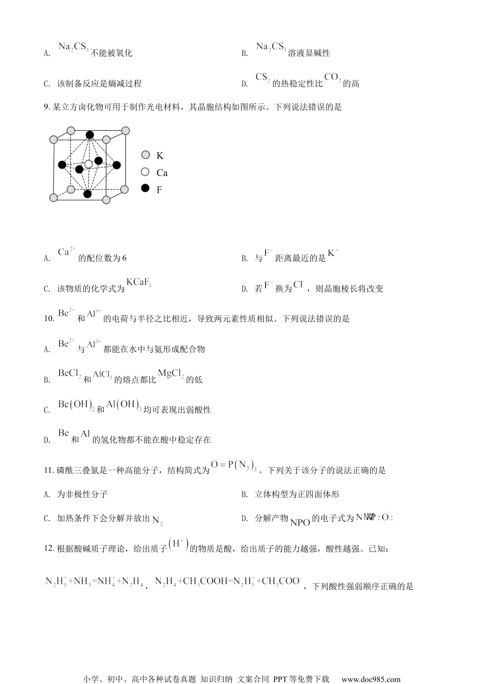 小学、初中、高中各种试卷真题知识归纳文案合同PPT等免费下载www.doc985.com湖北省2022年普通高中学业水平选择性考试化学本试卷共8页,19题。全卷满分100分。考试用时75分钟。★祝考试顺利★注意事项:1.答题前,先将自己的姓名、准考证号、考场号、座位号填写在试卷和答题卡上,并认真核准准考证号条形码上的以上信息,将条形码粘贴在答题卡上的指定位置。2.请按题号顺序在答题卡上各题目的答题区域内作答,写在试卷、草稿纸和答题卡上的非答题区域均无效。3.选择题用2B铅笔在答题卡上把所选答秦的标号涂黑;非选择题用黑色签字笔在答题卡上作答;字体工整,笔迹清楚。4.考试结束后,请将试卷和答题卡一并上交。可能用到的相对原子质量:H1Li7C12O16Mg24Al27Ca40本卷涉及的实验均须在专业人士指导和李余得到充分保障的条件下完成。一、选择题:本题共15小题,每小题3分,共45分。在每小题给出的四个选项中,只有一项是符合题目要求的。1.化学与生活密切相关,下列不涉及化学变化的是A.加入明矾后泥水变澄清B.北京冬奥会用水快速制冰C.炖排骨汤时加点醋味道更鲜D.切开的茄子放置后切面变色2.莲藕含多酚类物质,其典型结构简式如图所示。下列有关该类物质的说法错误的是A.不能与溴水反应B.可用作抗氧化剂C.有特征红外吸收峰D.能与发生显色反应3.武当山金殿是铜铸鎏金大殿。传统鎏金工艺是将金溶于汞中制成“金汞漆”,涂在器物表面,然后加火除汞,使金附着在器物表面。下列说法错误的是小学、初中、高中各种试卷真题知识归纳文案合同PPT等免费下载www.doc985.comA.鎏金工艺利用了汞的挥发性B.鎏金工艺中金发生了化学反应C.鎏金工艺的原理可用于金的富集D.用电化学方法也可实现铜上覆金4.下列各组离子在给定溶液中能大量共存的是A.在氨水中:B.在氯化钠溶液中:C.在醋酸溶液中:D.在硝酸银溶液中:5.化学物质与生命过程密切相关,下列说法错误的是A.维生素C可以还原活性氧自由基B.蛋白质只能由蛋白酶催化水解C.淀粉可用为原料人工合成D.核酸可视为核苷酸的聚合产物6.下列实验装置(部分夹持装置略)或现象错误的是A.滴入酚酞溶液B.吸氧腐蚀C.钠的燃烧D.石蜡油的热分解A.AB.BC.CD.D7.在高温高压下可转变为具有一定导电性、高硬度的非晶态碳玻璃。下列关于该碳玻璃的说法错误的是A.具有自范性B.与互为同素异形体C.含有杂化的碳原子D.化学性质与金刚石有差异8.硫代碳酸钠能用于处理废水中的重金属离子,可通过如下反应制备:,下列说法正确的是小学、初中、高中各种试卷真题知识归纳文案合同PPT等免费下载www.doc985.comA.不能被氧化B.溶液显碱性C.该制备反应是熵减过程D.的热稳定性比的高9.某立方卤化物可用于制作光电材料,其晶胞结构如图所示。下列说法错误的是A.的配位数为6B.与距离最近的是C.该物质的化学式为D.若换为,则晶胞棱长将改变10.和的电荷与半径之比相近,导致两元素性质相似。下列说法错误的是A.与都能在水中与氨形成配合物B.和的熔点都比的低C.和均可表现出弱酸性D.和的氢化物都不能在酸中稳定存在11.磷酰三叠氮是一种高能分子,结构简式为。下列关于该分子的说法正确的是A.为非极性分子B.立体构型为正四面体形C.加热条件下会分解并放出D.分解产物的电子式为12.根据酸碱质子理论,给出质子的物质是酸,给出质子的能力越强,酸性越强。已知:,,下列酸性强弱顺序正确的是小学、初中、高中各种试卷真题知识归纳文案合同PPT等免费下载www.doc985.comA.B.C.D.13.同位素示踪是研究反应机理的重要手段之一、已知醛与在酸催化下存在如下平衡:。据此推测,对羟基苯甲醛与10倍量的在少量酸催化下反应,达到平衡后,下列化合物中含量最高的是A.B.C.D.14.含磷有机物应用广泛。电解法可实现由白磷直接制备,过程如图所示(为甲基)。下列说法正确的是A.生成,理论上外电路需要转移电子B.阴极上的电极反应为:C.在电解过程中向铂电极移动D.电解产生的中的氢元素来自于15.下图是亚砷酸和酒石酸混合体系中部分物种的图小学、初中、高中各种试卷真题知识归纳文案合同PPT等免费下载www.doc985.com(浓度:总为,总T为)。下列说法错误的是A.的为B.的酸性比的强C.时,的浓度比的高D.时,...