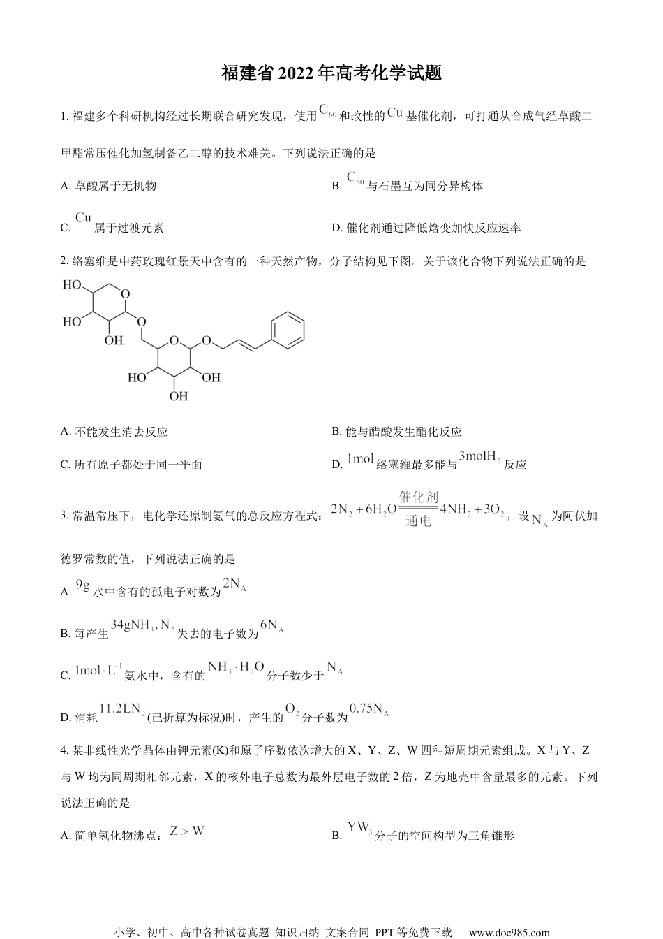 小学、初中、高中各种试卷真题知识归纳文案合同PPT等免费下载www.doc985.com福建省2022年高考化学试题1.福建多个科研机构经过长期联合研究发现,使用和改性的基催化剂,可打通从合成气经草酸二甲酯常压催化加氢制备乙二醇的技术难关。下列说法正确的是A.草酸属于无机物B.与石墨互为同分异构体C.属于过渡元素D.催化剂通过降低焓变加快反应速率2.络塞维是中药玫瑰红景天中含有的一种天然产物,分子结构见下图。关于该化合物下列说法正确的是A.不能发生消去反应B.能与醋酸发生酯化反应C.所有原子都处于同一平面D.络塞维最多能与反应3.常温常压下,电化学还原制氨气的总反应方程式:,设为阿伏加德罗常数的值,下列说法正确的是A.水中含有的孤电子对数为B.每产生失去的电子数为C.氨水中,含有的分子数少于D.消耗(己折算为标况)时,产生的分子数为4.某非线性光学晶体由钾元素(K)和原子序数依次增大的X、Y、Z、W四种短周期元素组成。X与Y、Z与W均为同周期相邻元素,X的核外电子总数为最外层电子数的2倍,Z为地壳中含量最多的元素。下列说法正确的是A.简单氢化物沸点:B.分子的空间构型为三角锥形小学、初中、高中各种试卷真题知识归纳文案合同PPT等免费下载www.doc985.comC.原子半径:D.最高价氧化物对应水化物的碱性:5.探究醋酸浓度与电离度关系的步骤如下,与相关步骤对应的操作或叙述正确的步骤操作或叙述AⅠ.用标准溶液标定醋酸溶液浓度滴定时应始终注视滴定管中的液面BⅡ.用标定后的溶液配制不同浓度的醋酸溶液应使用干燥的容量瓶CⅢ.测定步骤Ⅰ中所得溶液的应在相同温度下测定DⅣ.计算不同浓度溶液中醋酸的电离度计算式为A.AB.BC.CD.D6.用铬铁合金(含少量单质)生产硫酸铬的工艺流程如下:下列说法错误的是A.“浸出”产生的气体含有B.“除杂”的目的是除去元素C.流程中未产生六价铬化合物D.“滤渣2”的主要成分是7.锂辉石是锂的重要来源,其焙烧后的酸性浸出液中含有和杂质离子,可在0~14范围内调节对其净化(即相关离子浓度)。时,与关系见下图(碱性过强时和会部分溶解)。下列说法正确的是小学、初中、高中各种试卷真题知识归纳文案合同PPT等免费下载www.doc985.comA.可被净化的区间最大B.加入适量,可进一步提升净化程度C.净化的先后顺序:D.8.实验室需对少量污染物进行处理。以下处理方法和对应的反应方程式均错误的是A.用硫磺处理洒落在地上的水银:B.用盐酸处理银镜反应后试管内壁的金属银:C.用烧碱溶液吸收蔗糖与浓硫酸反应产生的刺激性气体:D.用烧碱溶液吸收电解饱和食盐水时阳极产生的气体:9.一种化学“自充电”的锌-有机物电池,电解质为和水溶液。将电池暴露于空气中,某电极无需外接电源即能实现化学自充电,该电极充放电原理如下图所示。下列说法正确的是小学、初中、高中各种试卷真题知识归纳文案合同PPT等免费下载www.doc985.comA.化学自充电时,增大B.化学自充电时,电能转化为化学能C.化学自充电时,锌电极反应式:D.放电时,外电路通过电子,正极材料损耗10.氨是水体污染物的主要成分之一,工业上可用次氯酸盐作处理剂,有关反应可表示为:①②在一定条件下模拟处理氨氮废水:将的氨水分别和不同量的混合,测得溶液中氨去除率、总氮(氨氮和硝氮的总和)残余率与投入量(用x表示)的关系如下图所示。下列说法正确的是小学、初中、高中各种试卷真题知识归纳文案合同PPT等免费下载www.doc985.comA.的数值为0.009B.时,C.时,x越大,生成的量越少D.时,11.粉煤灰是火电厂的大宗固废。以某电厂的粉煤灰为原料(主要含和等)提铝的工艺流程如下:回答下列问题:(1)“浸出”时适当升温的主要目的是_______,发生反应的离子方程式为_______。(2)“浸渣”的主要成分除残余外,还有_______。实验测得,粉煤灰(的质量分数为)经浸出、干燥后得到“浸渣”(的质量分数为),的浸出率为_______。(3)“沉铝”时,体系中三种物质的溶解度曲线如下图所示,加入沉铝的目的是_______,“沉铝”的最佳方案为_______。小学、初中、高中各种试卷真题知识归纳文案合同PPT等免费下载www.doc985.com(4)“焙烧”时,主要反应的化学方程式为_______。(5)“水浸”后得到的“滤液2”可返回...