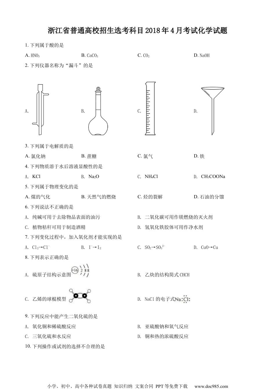 小学、初中、高中各种试卷真题知识归纳文案合同PPT等免费下载www.doc985.com浙江省普通高校招生选考科目2018年4月考试化学试题1.下列属于酸的是A.HNO3B.CaCO3C.CO2D.NaOH2.下列仪器名称为“漏斗”的是A.B.C.D.3.下列属于电解质的是A.氯化钠B.蔗糖C.氯气D.铁4.下列物质溶于水后溶液显酸性的是A.KClB.Na2OC.NH4ClD.CH3COONa5.下列属于物理变化的是A.煤的气化B.天然气的燃烧C.烃的裂解D.石油的分馏6.下列说法不正确的是A.纯碱可用于去除物品表面的油污B.二氧化碳可用作镁燃烧的灭火剂C.植物秸秆可用于制造酒精D.氢氧化铁胶体可用作净水剂7.下列变化过程中,加入氧化剂才能实现的是A.Cl2→Cl-B.I-→I2C.SO2→SO32-D.CuO→Cu8.下列表示正确的是A.硫原子结构示意图B.乙炔的结构简式CHCHC.乙烯的球棍模型D.NaCl的电子式9.下列反应中能产生二氧化硫的是A.氧化铜和稀硫酸反应B.亚硫酸钠和氧气反应C.三氧化硫和水反应D.铜和热的浓硫酸反应10.下列操作或试剂的选择不合理的是小学、初中、高中各种试卷真题知识归纳文案合同PPT等免费下载www.doc985.comA.可用蒸发结晶的方法从碘水中提取碘单质B.可用灼烧法除去氧化铜中混有的铜粉C.可用硫酸鉴别碳酸钠、硅酸钠和硫酸钠D.可用含氢氧化钠的氢氧化铜悬浊液鉴别乙醇、乙醛和乙酸11.下列说法正确的是A.的名称为3一甲基丁烷B.CH3CH2CH2CH2CH3和互为同素异形体C.和为同一物质D.CH3CH2OH和具有相同的官能团,互为同系物12.四种短周期元素X、Y、Z和W在周期表中的位置如图所示,原子序数之和为48。下列说法不正确的是XYZWA.原子半径(r)大小比较r(X)>r(Y)B.X和W可形成共价化合物XW3C.W的非金属性比Z的强,所以W氢化物的沸点比Z的高D.Z的最低价单核阴离子的失电子能力比Y的强13.下列离子方程式正确的是A.大理石与醋酸反应:CO32-+2CH3COOH==2CH3COO-+H2O+CO2↑B.高锰酸钾与浓盐酸制氯气的反应:MnO4-+4Cl-+8H+==Mn2++2Cl2↑+4H2OC.漂白粉溶液吸收少量二氧化硫气体:SO2+H2O+ClO-=SO42-+Cl-+2H+D.氢氧化钠溶液与过量的碳酸氢钙溶液反应:OH-+Ca2++HCO3-==CaCO3↓+H2O14.反应N2(g)+3H2(g)2NH3(g)ΔH<0,若在恒压容器中发生,下列选项表明反应一定已达平衡状态的是()A.容器内气体的密度不再变化小学、初中、高中各种试卷真题知识归纳文案合同PPT等免费下载www.doc985.comB.容器内压强保持不变C.相同时间内,生成N-H键的数目与断开H-H键的数目相等D.容器内气体的浓度之比c(N2)∶c(H2)∶c(NH3)=1∶3∶215.下列说法正确的是A.光照下,1molCH4最多能与4molCl2发生取代反应,产物中物质的量最多的是CCl4B.苯与浓硝酸和浓硫酸的混合液在一定条件下能发生取代反应C.甲烷与乙烯混合物可通过溴的四氯化碳溶液分离D.乙烯和苯分子中均含独立的碳碳双键,都能与H2发生加成反应16.下列说法正确的是A.油脂、糖类和蛋白质都能发生水解反应B.油脂皂化反应可用酸作催化剂C.淀粉溶液中加入硫酸,加热4-5min,再加入少量银氨溶液,加热,有光亮银镜生成D.福尔马林能使蛋白质发生变性,可用于浸制动物标本17.锂(Li)—空气电池的工作原理如图所示下列说法不正确的是A.金属锂作负极,发生氧化反应B.Li+通过有机电解质向水溶液处移动C.正极的电极反应:O2+4e—==2O2—D.电池总反应:4Li+O2+2H2O==4LiOH18.相同温度下,关于盐酸和醋酸两种溶液的比较,下列说法正确的是A.pH相等的两溶液中:c(CH3COOˉ)=c(Clˉ)B.分别中和pH相等、体积相等的两溶液,所需NaOH的物质的量相同C.相同浓度的两溶液,分别与金属镁反应,反应速率相同D.相同浓度的两溶液,分别与NaOH固体反应后呈中性的溶液中(忽略溶液体积变化):c(CH3COOˉ)=c(Clˉ)小学、初中、高中各种试卷真题知识归纳文案合同PPT等免费下载www.doc985.com19.下列说法正确的是A.CaCl2中既有离子键又有共价键,所以CaCl2属于离子化合物B.H2O汽化成水蒸气、分解为H2和O2,都需要破坏共价键C.C4H10的两种同分异构体因为分子间作用力大小不同,因而沸点不同D.水晶和干冰都是共价化合物,均属于原子晶体20.设NA阿伏加德罗常数的值,下列说法不正确的是A.10g的2H216O含有的质子数与中子数均为5NAB.32g硫在足量的氧气中充分燃烧,...
