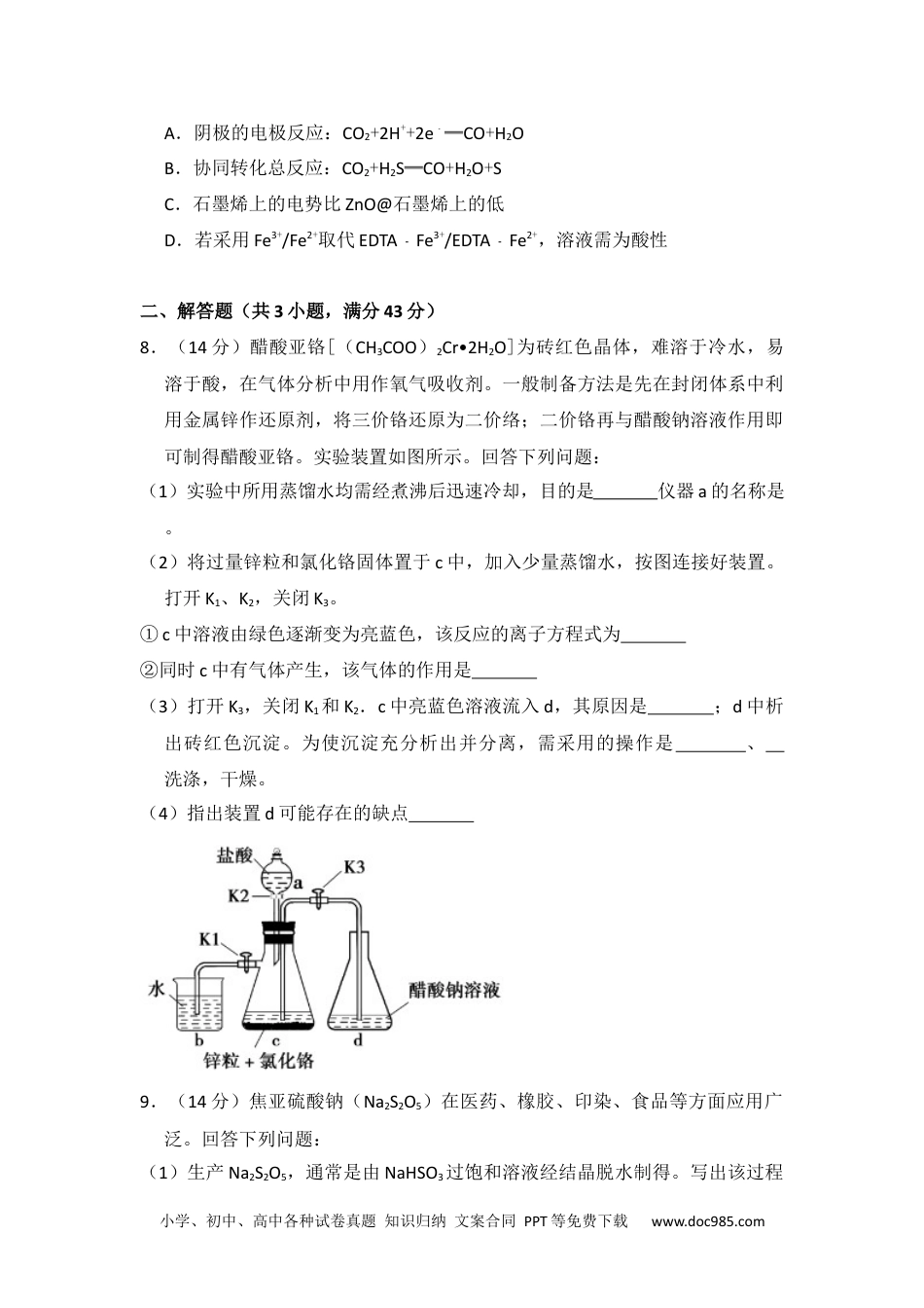 小学、初中、高中各种试卷真题知识归纳文案合同PPT等免费下载www.doc985.com2018年全国统一高考化学试卷(新课标Ⅰ)一、选择题(共7小题,每小题6分,满分42分)1.(6分)磷酸亚铁锂(LiFePO4)电池是新能源汽车的动力电池之一,采用湿法冶金工艺回收废旧磷酸亚铁锂电池正极片中的金属,其流程如下:下列叙述错误的是()A.合理处理废旧电池有利于保护环境和资源再利用B.从“正极片”中可回收的金属元素有Al、Fe、LiC.“沉淀”反应的金属离子为Fe3+D.上述流程中可用硫酸钠代替碳酸钠2.(6分)下列说法错误的是()A.蔗糖、果糖和麦芽糖均为双糖B.酶是一类具有高选择催化性能的蛋白质C.植物油含不饱和脂肪酸酯,能使Br2/CCl4褪色D.淀粉和纤维素水解的最终产物均为葡萄糖3.(6分)在生成和纯化乙酸乙酯的实验过程中,下列操作未涉及的是()A.B.C.D.4.(6分)NA是阿伏加德罗常数的值,下列说法正确的是()A.16.25gFeCl3,水解形成的Fe(OH)3为胶体粒子数为0.1NAB.22.4L(标准状况)氩气含有的质子数为18NA小学、初中、高中各种试卷真题知识归纳文案合同PPT等免费下载www.doc985.comC.92.0g甘油(丙三醇)中含有羟基数为1.0NAD.1.0molCH4与Cl2在光照下生成CH3Cl的分子数为1.0NA5.(6分)环之间共用一个碳原子的化合物称为螺环化合物,螺(2,2)戊烷()是最简单的一种,下列关于该化合物的说法错误的是()A.与环戊烯互为同分异构体B.二氯化物超过两种C.所有碳原子均处同一平面D.生成1molC5H12,至少需要2molH26.(6分)主族元素W、X、Y、Z的原子序数依次增加,且均不大于20.W、X、Z最外层电子数之和为10;W与Y同族;W与Z形成的化合物可与浓硫酸反应,其生成物可腐蚀玻璃。下列说法正确的是()A.常温常压下X的单质为气态B.Z的氢化物为离子化合物C.Y和Z形成的化合物的水溶液呈碱性D.W与Y具有相同的最高化合价7.(6分)最近我国科学家设计了一种CO2+H2S协同转化装置,实现对天然气中CO2和H2S的高效去除。示意图如右所示,其中电极分别为ZnO@石墨烯(石墨烯包裹的ZnO)和石墨烯,石墨烯电极区发生反应为:①EDTAFe﹣2+e﹣﹣=EDTAFe﹣3+②2EDTAFe﹣3++H2S=2H++S+2EDTAFe﹣2+该装置工作时,下列叙述错误的是()小学、初中、高中各种试卷真题知识归纳文案合同PPT等免费下载www.doc985.comA.阴极的电极反应:CO2+2H++2e﹣═CO+H2OB.协同转化总反应:CO2+H2S═CO+H2O+SC.石墨烯上的电势比ZnO@石墨烯上的低D.若采用Fe3+/Fe2+取代EDTAFe﹣3+/EDTAFe﹣2+,溶液需为酸性二、解答题(共3小题,满分43分)8.(14分)醋酸亚铬[(CH3COO)2Cr•2H2O]为砖红色晶体,难溶于冷水,易溶于酸,在气体分析中用作氧气吸收剂。一般制备方法是先在封闭体系中利用金属锌作还原剂,将三价铬还原为二价络;二价铬再与醋酸钠溶液作用即可制得醋酸亚铬。实验装置如图所示。回答下列问题:(1)实验中所用蒸馏水均需经煮沸后迅速冷却,目的是仪器a的名称是。(2)将过量锌粒和氯化铬固体置于c中,加入少量蒸馏水,按图连接好装置。打开K1、K2,关闭K3。①c中溶液由绿色逐渐变为亮蓝色,该反应的离子方程式为②同时c中有气体产生,该气体的作用是(3)打开K3,关闭K1和K2.c中亮蓝色溶液流入d,其原因是;d中析出砖红色沉淀。为使沉淀充分析出并分离,需采用的操作是、洗涤,干燥。(4)指出装置d可能存在的缺点9.(14分)焦亚硫酸钠(Na2S2O5)在医药、橡胶、印染、食品等方面应用广泛。回答下列问题:(1)生产Na2S2O5,通常是由NaHSO3过饱和溶液经结晶脱水制得。写出该过程小学、初中、高中各种试卷真题知识归纳文案合同PPT等免费下载www.doc985.com的化学方程式(2)利用烟道气中的SO2生产Na2S2O5,的工艺为:①pH=4.1时,Ⅰ中为溶液(写化学式)。②工艺中加入Na2CO3固体,并再次充入SO2的目的是。(3)制备Na2S2O5也可采用三室膜电解技术,装置如图所示,其中SO2碱吸收液中含有NaHSO3和Na2SO3.阳极的电极反应式为。电解后,室的NaHSO3浓度增加。将该室溶液进行结晶脱水,可得到Na2S2O5(4)Na2S2O5可用作食品的抗氧化剂。在测定某葡萄酒中Na2S2O5残留量时,取50.00...