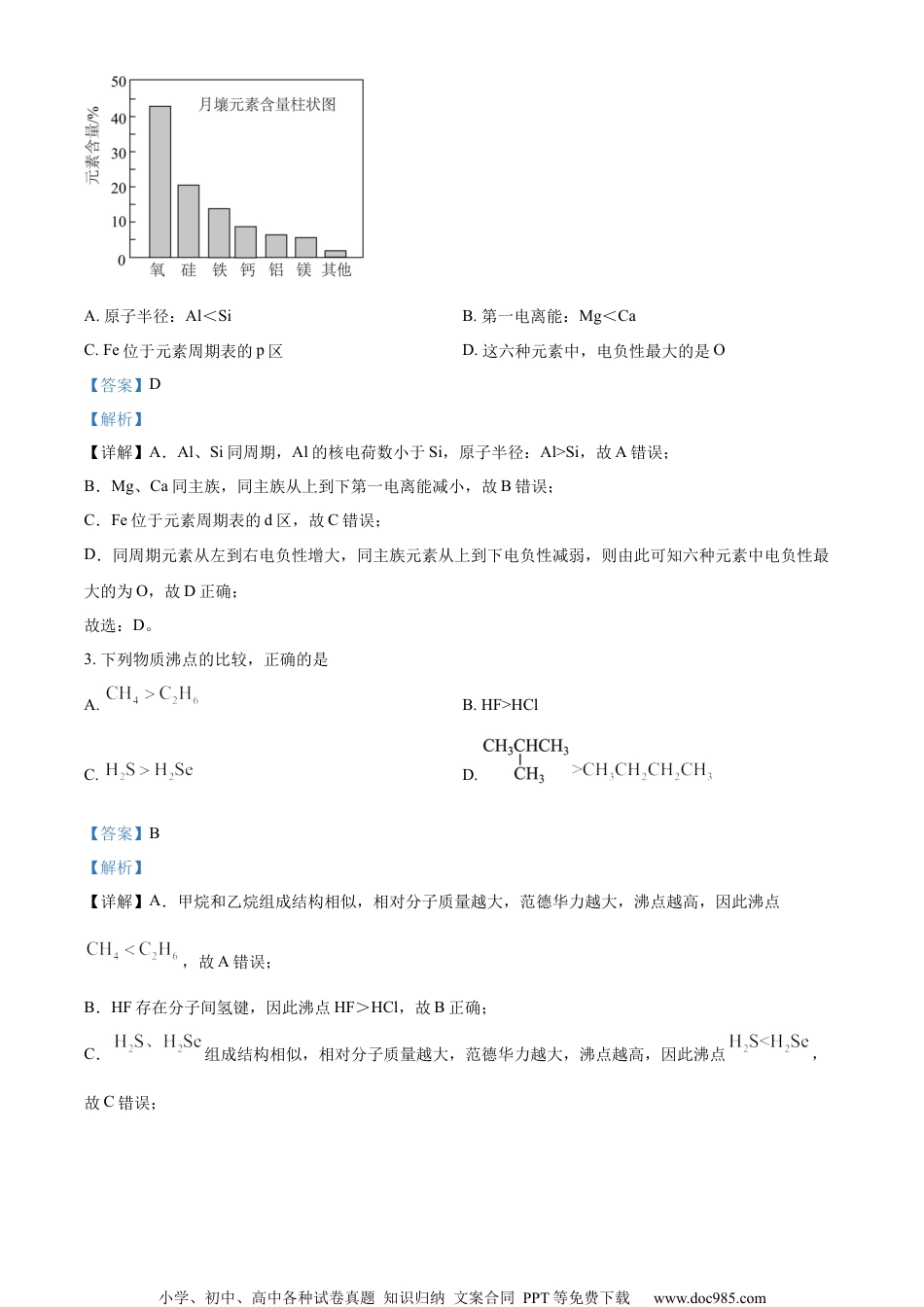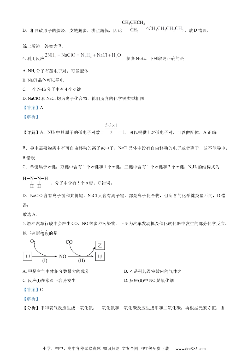 小学、初中、高中各种试卷真题知识归纳文案合同PPT等免费下载www.doc985.com2022年天津市普通高中学业水平等级性考试化学本试卷分为第I卷(选择题)和第II卷(非选择题)两部分,共100分,考试用时60分钟。第I卷1至4页,第II卷5至8页。答卷前,考生务必将自己的姓名、考生号、考场号和座位号填写在答题卡上,并在规定位置粘贴考试用条形码。答卷时,考生务必将答案涂写在答题卡上,答在试卷上的无效。考试结束后,将本试卷和答题卡一并交回。以下数据可供解题时参考:相对原子质量:H1C12O16Na23第I卷注意事项:1.每题选出答案后,用铅笔将答题卡上对应题目的答案标号涂黑。如需改动,用橡皮擦干净后,再选涂其他答案标号。2.本卷共12题,每题3分,共36分。在每题所给出的四个选项中,只有一项是最符合题目要求的。1.近年我国在科技领域不断取得新成就。对相关成就所涉及的化学知识理解错误的是A.我国科学家实现了从二氧化碳到淀粉的人工合成,淀粉是一种单糖B.中国“深海一号”平台成功实现从深海中开采石油和天然气,石油和天然气都是混合物C.我国实现了高性能纤维锂离子电池的规模化制备,锂离子电池放电时将化学能转化为电能D.以硅树脂为基体的自供电软机器人成功挑战马里亚纳海沟,硅树脂是一种高分子材料【答案】A【解析】【详解】A.淀粉是一种多糖,故A错误;B.石油主要是各种烷烃、环烷烃、芳香烃的混合物,天然气主要含甲烷,还有少量的其他烷烃气体,因此天然气是混合物,故B正确;C.锂离子电池放电属于原电池,是将化学能转化为电能,故C正确;D.硅树脂是高聚物,属于高分子材料,故D正确。综上所述,答案为A。2.嫦娥5号月球探测器带回的月壤样品的元素分析结果如图,下列有关含量前六位元素的说法正确的是小学、初中、高中各种试卷真题知识归纳文案合同PPT等免费下载www.doc985.comA.原子半径:Al<SiB.第一电离能:Mg<CaC.Fe位于元素周期表的p区D.这六种元素中,电负性最大的是O【答案】D【解析】【详解】A.Al、Si同周期,Al的核电荷数小于Si,原子半径:Al>Si,故A错误;B.Mg、Ca同主族,同主族从上到下第一电离能减小,故B错误;C.Fe位于元素周期表的d区,故C错误;D.同周期元素从左到右电负性增大,同主族元素从上到下电负性减弱,则由此可知六种元素中电负性最大的为O,故D正确;故选:D。3.下列物质沸点的比较,正确的是A.B.HF>HClC.D.【答案】B【解析】【详解】A.甲烷和乙烷组成结构相似,相对分子质量越大,范德华力越大,沸点越高,因此沸点,故A错误;B.HF存在分子间氢键,因此沸点HF>HCl,故B正确;C.组成结构相似,相对分子质量越大,范德华力越大,沸点越高,因此沸点,故C错误;小学、初中、高中各种试卷真题知识归纳文案合同PPT等免费下载www.doc985.comD.相同碳原子的烷烃,支链越多,沸点越低,因此,故D错误。综上所述,答案为B。4.利用反应可制备N2H4。下列叙述正确的是A.NH3分子有孤电子对,可做配体B.NaCl晶体可以导电C.一个N2H4分子中有4个σ键D.NaClO和NaCl均为离子化合物,他们所含的化学键类型相同【答案】A【解析】【详解】A.NH3中N原子的孤电子对数==1,可以提供1对孤电子对,可以做配体,A正确;B.导电需要物质中有可自由移动的离子或电子,NaCl晶体中没有自由移动的电子或者离子,故不能导电,B错误;C.单键属于σ键,双键中含有1个σ键和1个π键,三键中含有1个σ键和2个π键;N2H4的结构式为,分子中含有5个σ键,C错误;D.NaClO含有离子键和共价键,NaCl只含有离子键,都是离子化合物,但所含的化学键类型不同,D错误;故选A。5.燃油汽车行驶中会产生CO、NO等多种污染物。下图为汽车发动机及催化转化器中发生的部分化学反应。以下判断错误的是A.甲是空气中体积分数最大的成分B.乙是引起温室效应的气体之一C.反应(Ⅰ)在常温下容易发生D.反应(Ⅱ)中NO是氧化剂【答案】C【解析】【分析】甲和氧气反应生成一氧化氮,一氧化氮和一氧化碳反应生成甲和二氧化碳,再根据元素守恒,则小学、初中、高中各种试卷真题知识归纳文案合同PPT等免费下载www.doc985.com甲为氮气。【详解】A.甲是氮气,氮气空气中体积分数最大的成分...