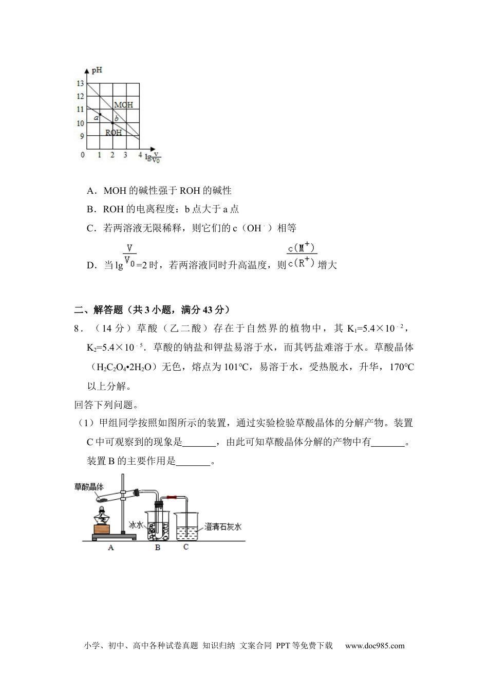 小学、初中、高中各种试卷真题知识归纳文案合同PPT等免费下载www.doc985.com2015年全国统一高考化学试卷(新课标Ⅰ)一、选择题(共7小题,每小题6分,满分42分)1.(6分)我国清代《本草纲目拾遗》中记叙无机药物335种,其中“强水”条目下写道:“性最烈,能蚀五金…其水甚强,五金八石皆能穿第,惟玻璃可盛。”这里的“强水”是指()A.氨水B.硝酸C.醋D.卤水2.(6分)NA为阿伏伽德罗常数的值。下列说法正确的是()A.18gD2O和18gH2O中含有的质子数均为10NAB.2L0.5mol/L亚硫酸溶液中含有的H+个数为2NAC.过氧化钠与水反应时,生成0.1mol氧气转移的电子数为0.2NAD.密闭容器中2molNO与1molO2充分反应,产物的分子数为2NA3.(6分)乌洛托品在合成、医药、染料等工业中有广泛用途,其结构式如图所示。将甲醛水溶液与氨水混合蒸发可制得乌洛托品。若原料完全反应生成乌洛托品,则甲醛与氨的物质的量之比为()A.1:1B.2:3C.3:2D.2:14.(6分)下列实验中,对应的现象以及结论都正确且两者具有因果关系的是()实验现象结论A将硝酸加入过量铁粉中,充分反应后滴加KSCN溶液有气体生成,溶液成血红色稀硝酸将Fe氧化为Fe3+B将铜粉加入1.0mol•L1﹣的Fe2(SO4)3溶液中溶液变蓝,有黑色固体出现金属Fe比Cu活泼C用坩埚钳夹住用砂纸仔细打磨过的铝箔在酒精灯上加热熔化后的液态铝滴落下来金属铝的熔点比较低D将0.1mol•L1﹣MgSO4溶液滴入NaOH先有白色沉淀生Cu(OH)2的溶度积小学、初中、高中各种试卷真题知识归纳文案合同PPT等免费下载www.doc985.com溶液中至不在有沉淀产生,再滴加0.1mol•L1﹣CuSO4溶液成,后变为浅蓝色沉淀比Mg(OH)2的小A.AB.BC.CD.D5.(6分)微生物电池是指在微生物的作用下将化学能转化为电能的装置,其工作原理如图所示。下列有关微生物电池的说法错误的是()A.正极反应中有CO2生成B.微生物促进了反应中电子的转移C.质子通过交换膜从负极区移向正极区D.电池总反应为C6H12O6+6O2═6CO2+6H2O6.(6分)W、X、Y、Z均为的短周期主族元素,原子序数依次增加,且原子核外L电子层的电子数分别为0、5、8、8,它们的最外层电子数之和为18.下列说法正确的是()A.单质的沸点:W>XB.阴离子的还原性:W>ZC.氧化物的水化物的酸性:Y<ZD.X与Y不能存在于同一离子化合物中7.(6分)浓度均为0.10mol/L、体积均为V0的MOH和ROH溶液,分别加水稀释至体积V,pH随lg的变化如图所示,下列叙述错误的是()小学、初中、高中各种试卷真题知识归纳文案合同PPT等免费下载www.doc985.comA.MOH的碱性强于ROH的碱性B.ROH的电离程度:b点大于a点C.若两溶液无限稀释,则它们的c(OH﹣)相等D.当lg=2时,若两溶液同时升高温度,则增大二、解答题(共3小题,满分43分)8.(14分)草酸(乙二酸)存在于自然界的植物中,其K1=5.4×102﹣,K2=5.4×105﹣.草酸的钠盐和钾盐易溶于水,而其钙盐难溶于水。草酸晶体(H2C2O4•2H2O)无色,熔点为101℃,易溶于水,受热脱水,升华,170℃以上分解。回答下列问题。(1)甲组同学按照如图所示的装置,通过实验检验草酸晶体的分解产物。装置C中可观察到的现象是,由此可知草酸晶体分解的产物中有。装置B的主要作用是。小学、初中、高中各种试卷真题知识归纳文案合同PPT等免费下载www.doc985.com(2)乙组同学认为草酸晶体分解产物中还有CO,为进行验证,选用甲组实验中的装置A、B和图2所示的部分装置(可以重复选用)进行实验。①乙组同学的实验装置中,依次连接的合理顺序为A、B、、I,装置H反应管中盛有的物质是。②能证明草酸晶体分解产物中有CO的现象是。(3)设计实验证明:草酸的酸性比碳酸的强。9.(14分)硼及其化合物在工业上有许多用途。以铁硼矿(主要成分为Mg2B2O5•H2O和Fe3O4,还有少量Fe2O3、FeO、CaO、Al2O3和SiO2等)为原料制备硼酸(H3BO3)的工艺流程如图所示:回答下列问题:(1)写出Mg2B2O5•H2O与硫酸反应的化学方程式。为提高浸出速率,除适当增加硫酸浓度外,还可采取的措施有(写出两条)。(2)利用的磁性,可将其从“浸渣”中分离。“浸渣”中还剩余的物质是(化学式)。(3)“净化除杂...